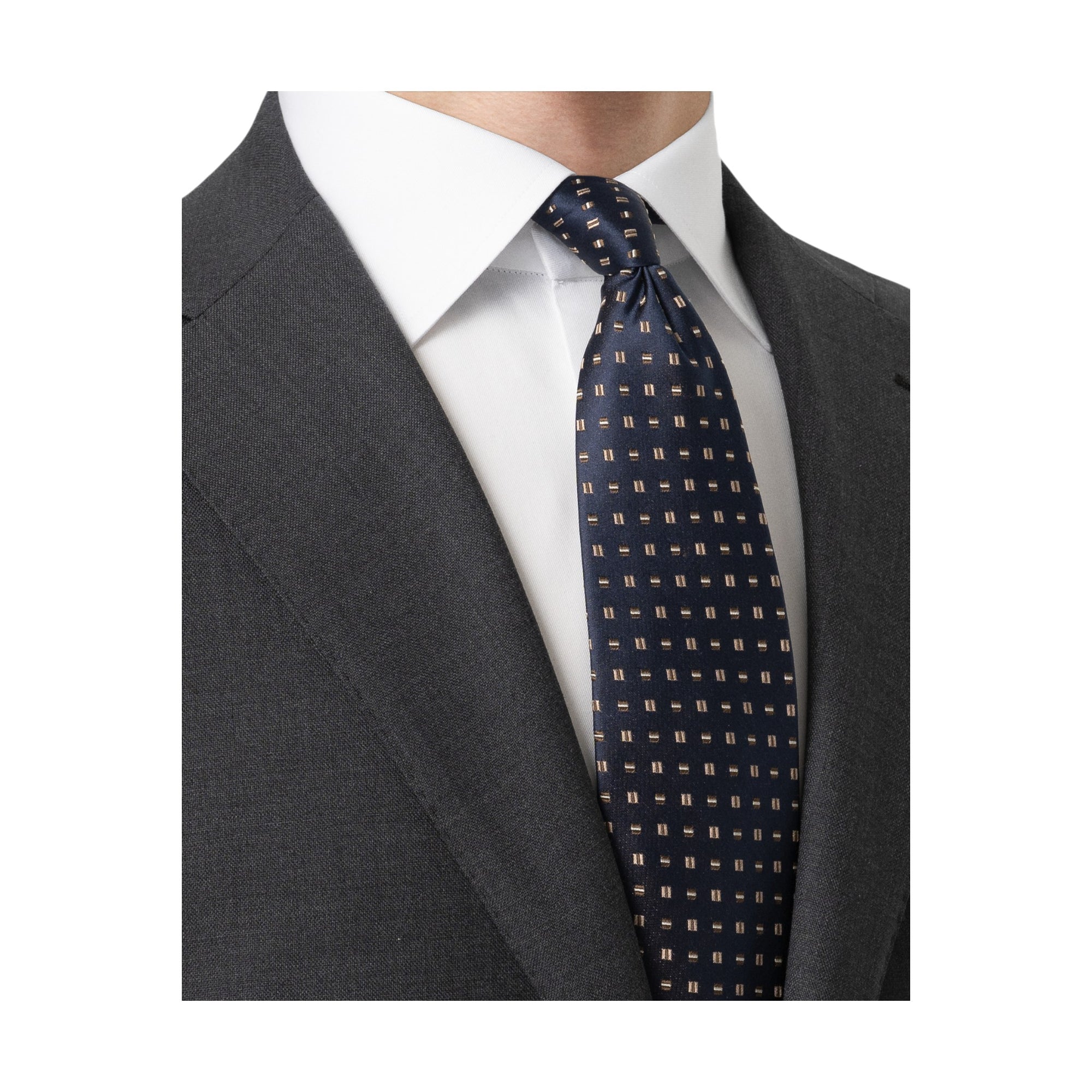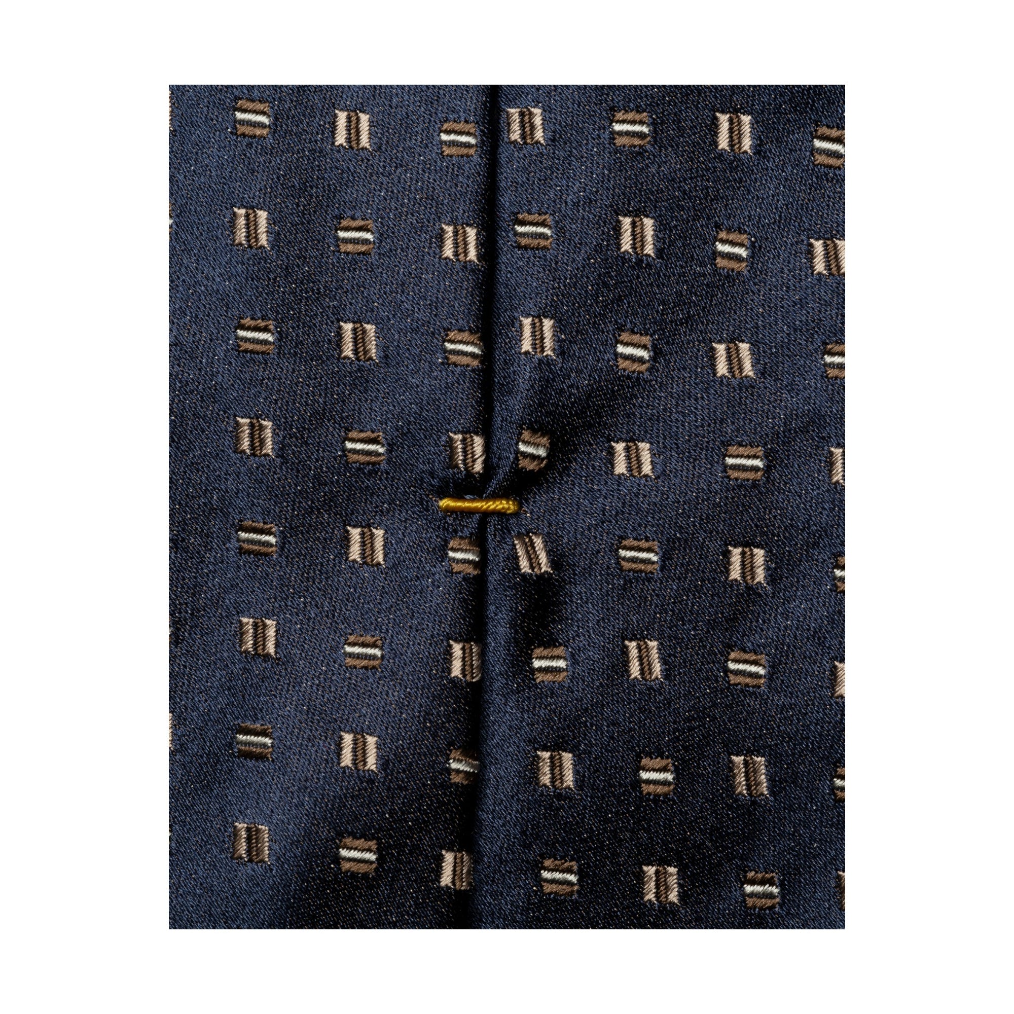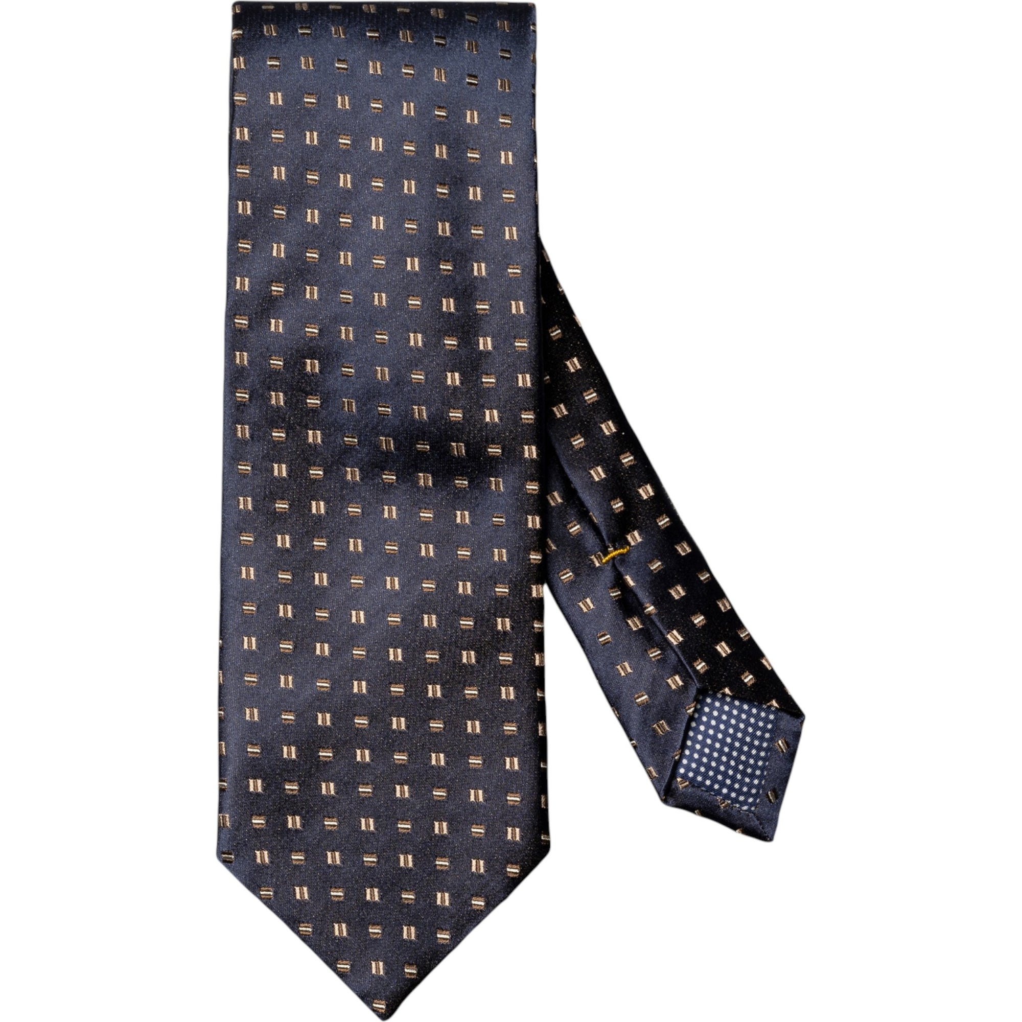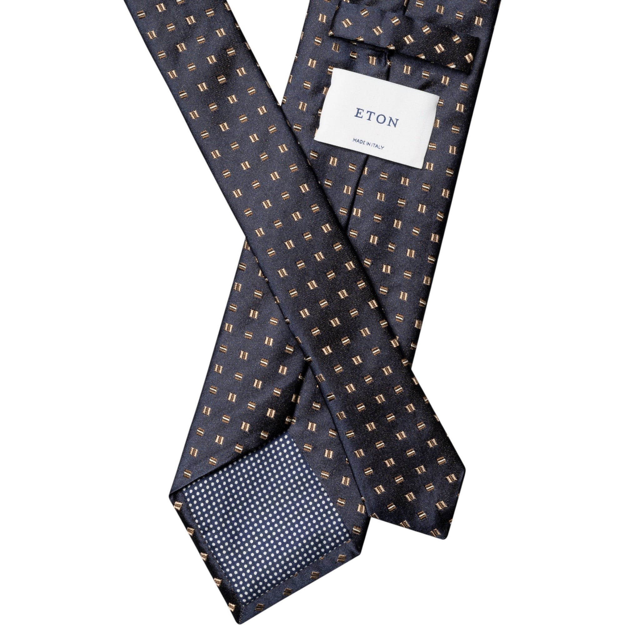 Et klassisk slips med et moderne twist. Dette navyfarvede slips fra Eton er vævet i 100% silke og prydet med et elegant geometrisk mønster, der skaber et stilrent og sofistikeret udtryk. Den dybe blå nuance gør det til et alsidigt valg, der passer perfekt til både formelle og mere afslappede jakkesæt.