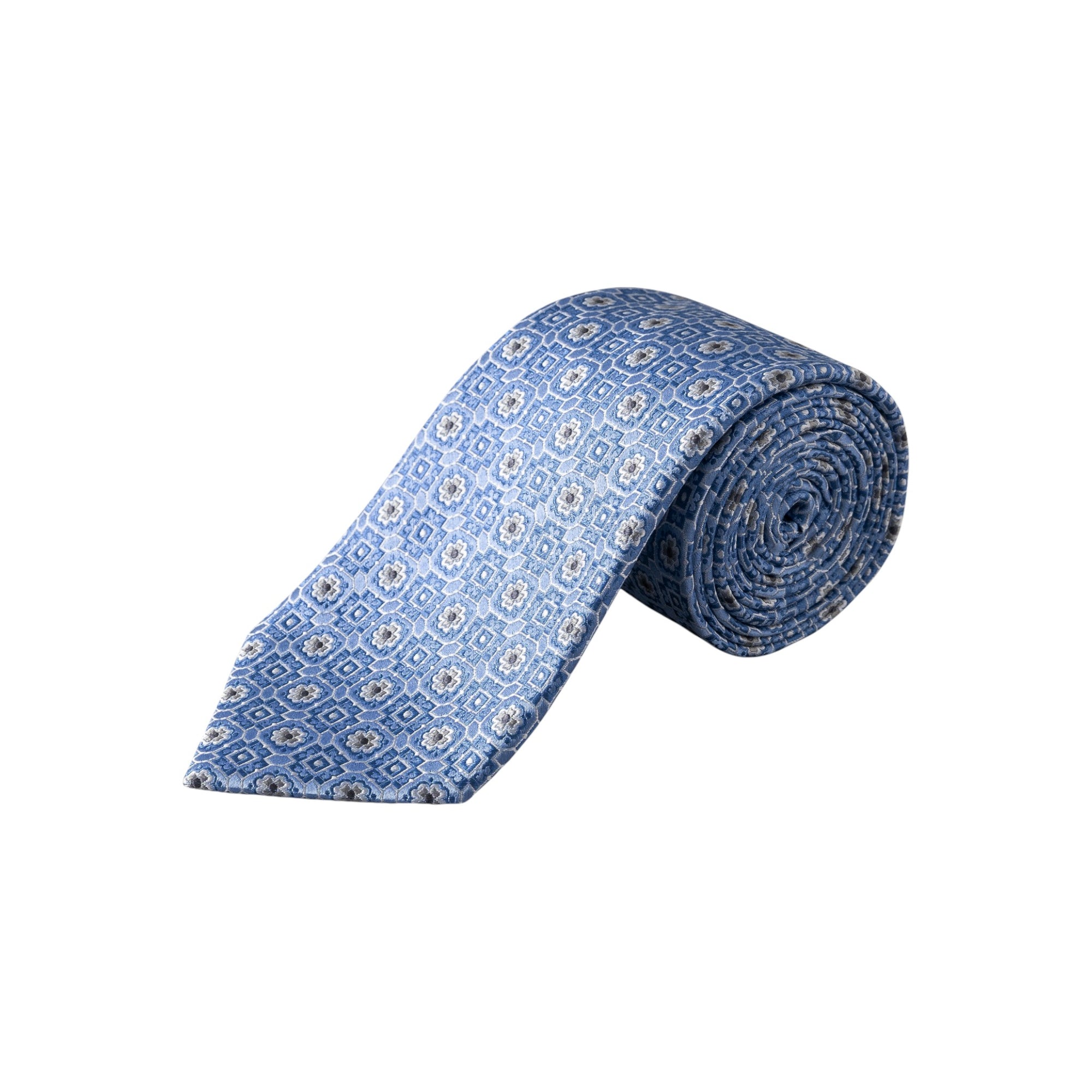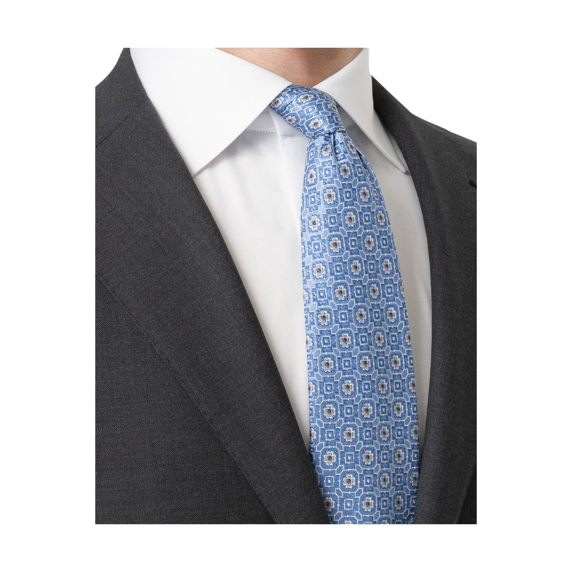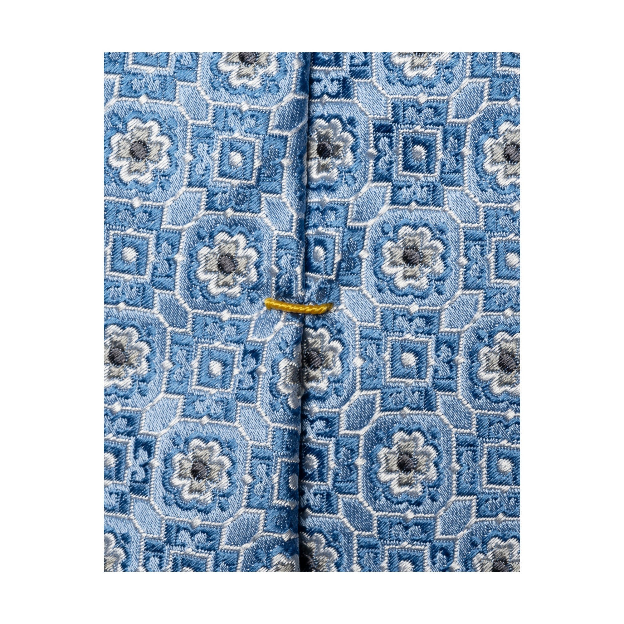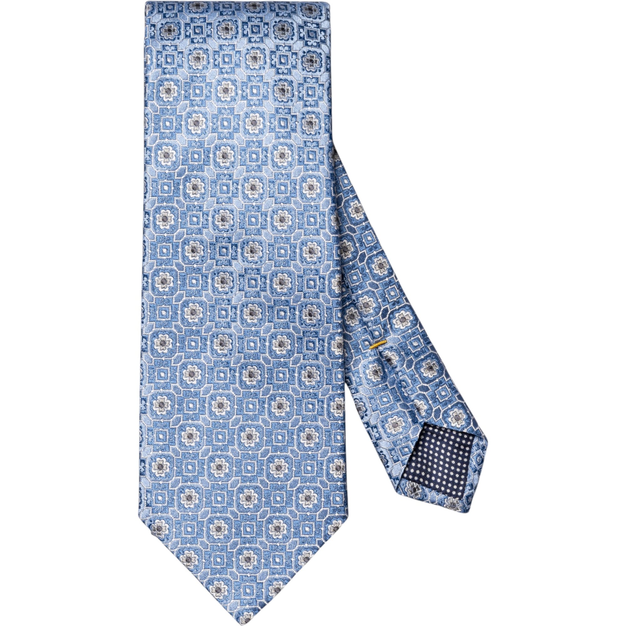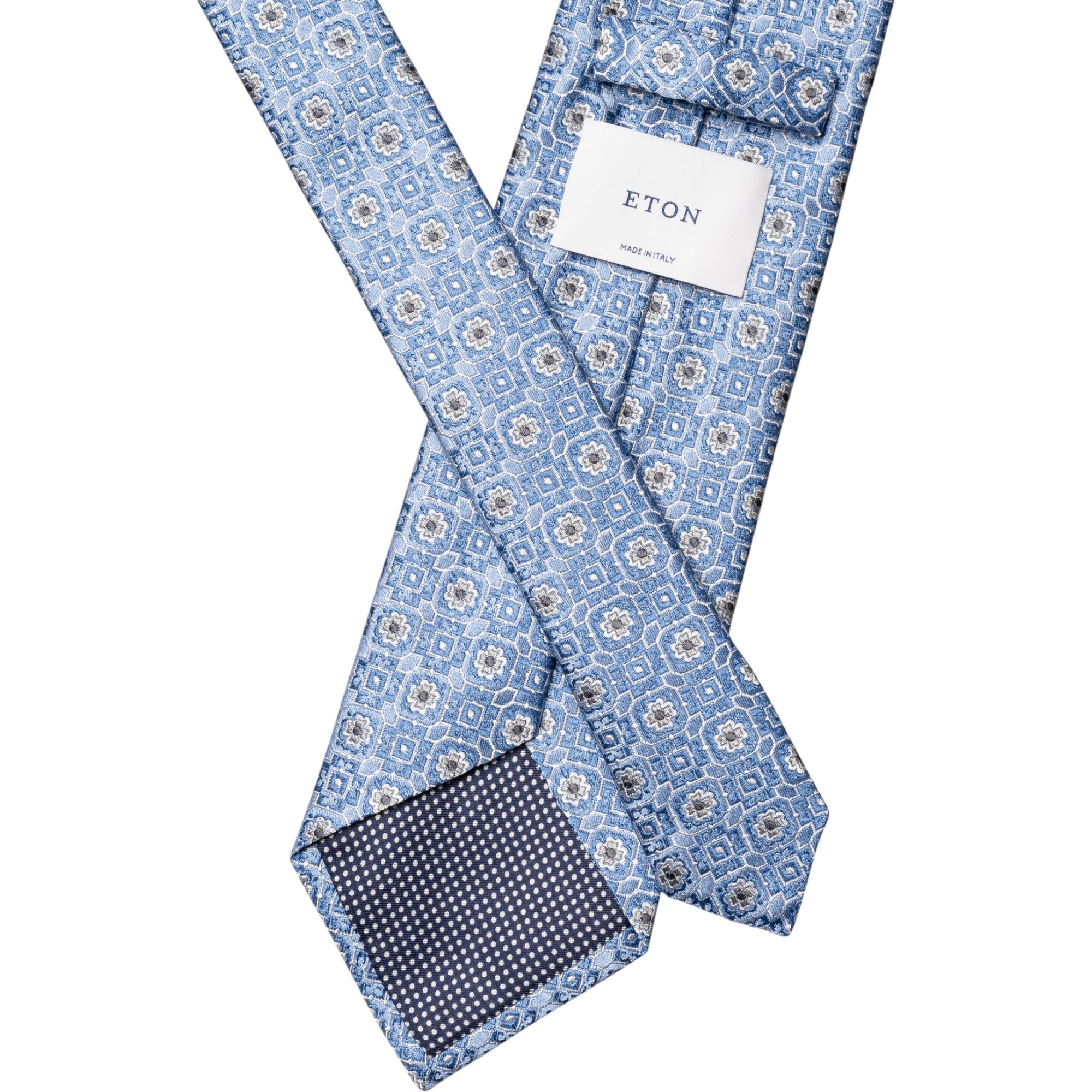 Et raffineret valg til den moderne gentleman. Dette lyseblå slips fra Eton er fremstillet i 100% eksklusiv silke og vævet med et elegant medaljonmønster, der tilføjer dybde og personlighed til dit look. Den bløde farve gør det nemt at matche med både klassiske og lyse skjorter – perfekt til alt fra formelle lejligheder til sommerbryllupper.