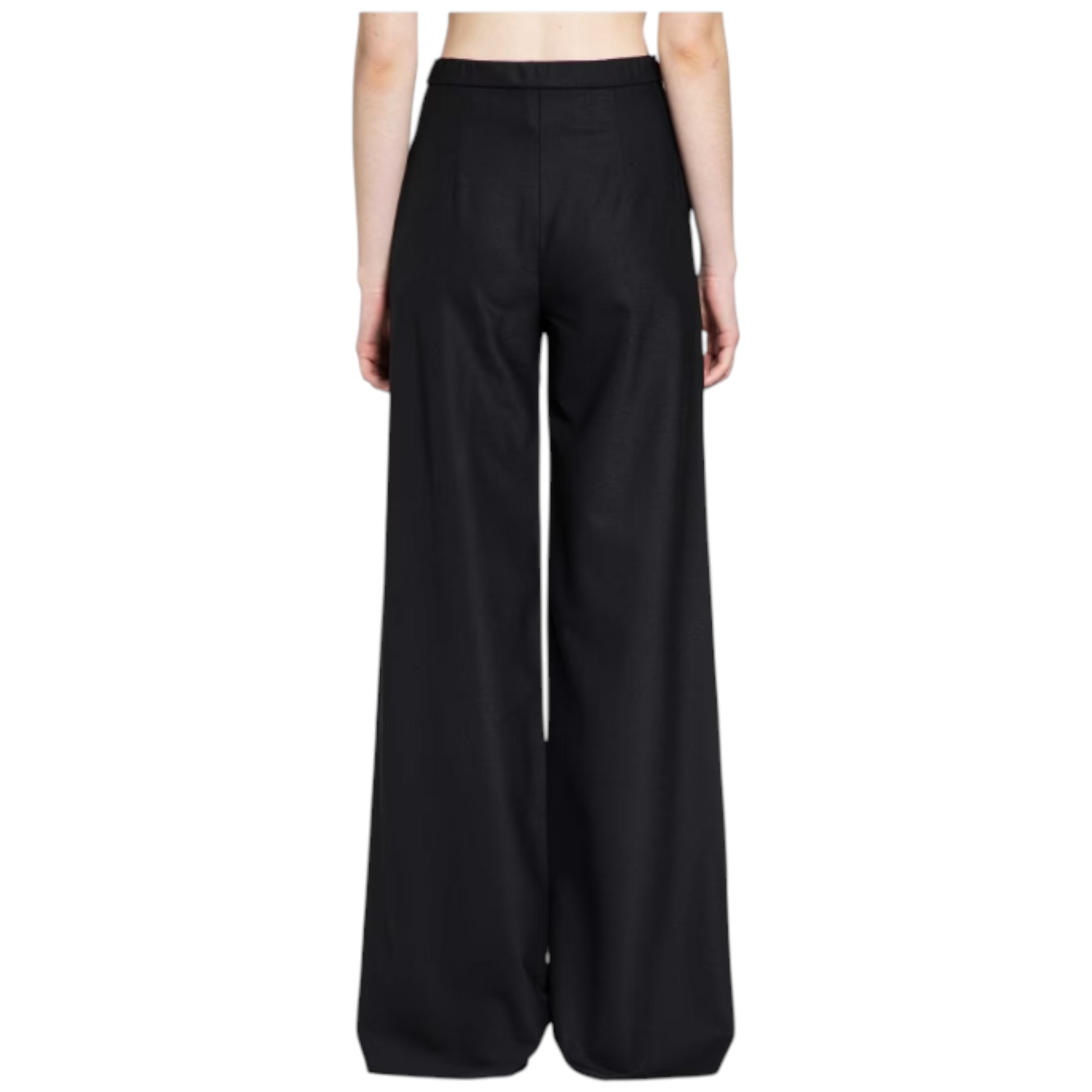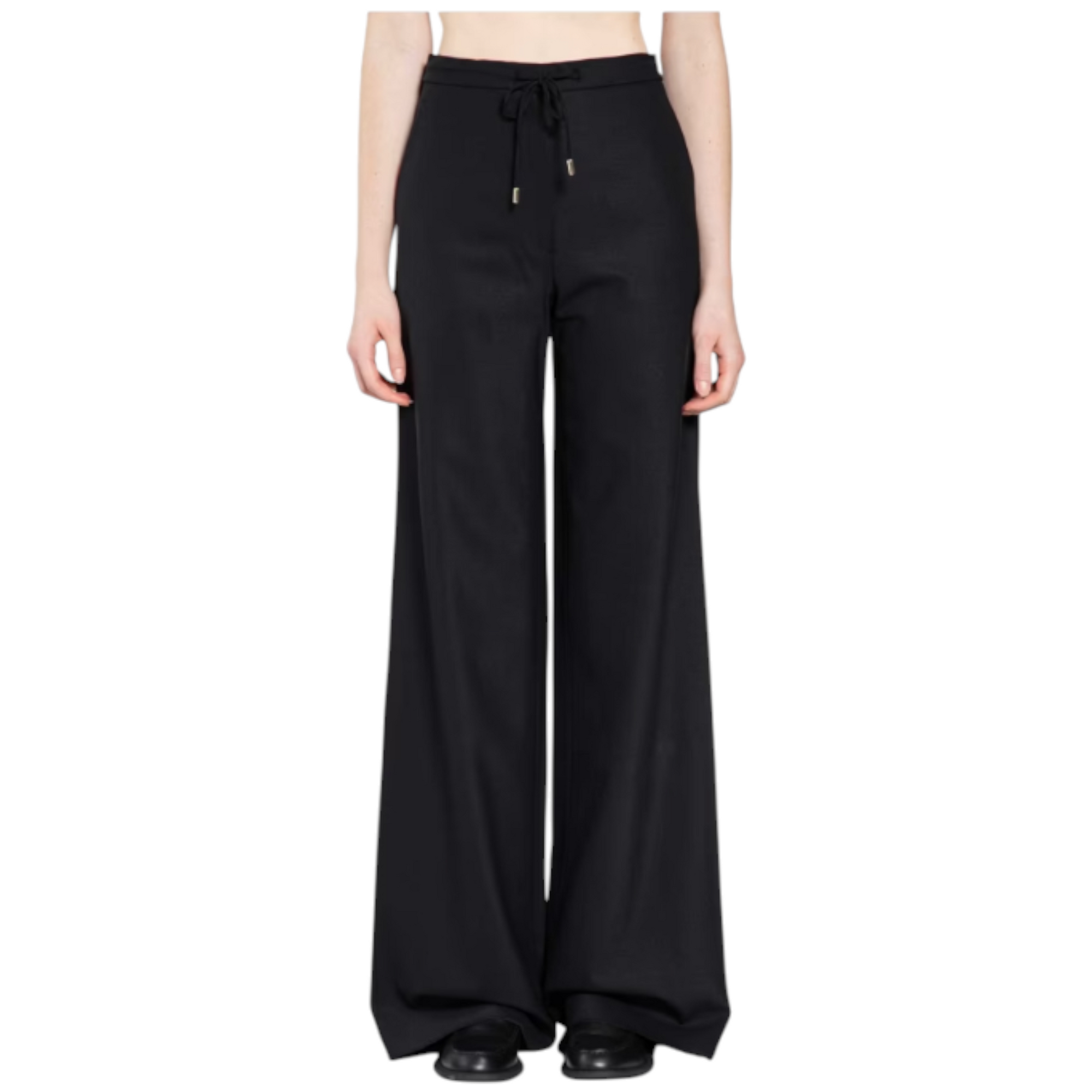 Lange bukser i stretch uldtwill med et afslappet, moderne udtryk. De har brede ben og en justerbar snøre i taljen, som giver en personlig og behagelig pasform. Bukserne er færdiggjort med skrålommer, skjult lynlås og hægte-lukning samt syede læg bagpå for let struktur.