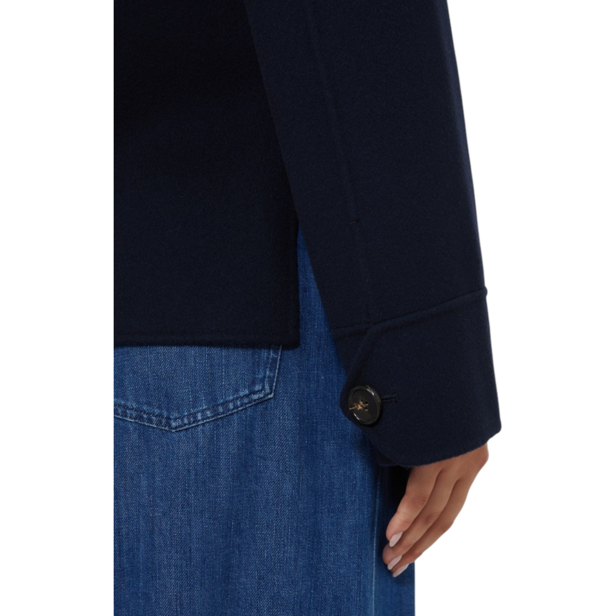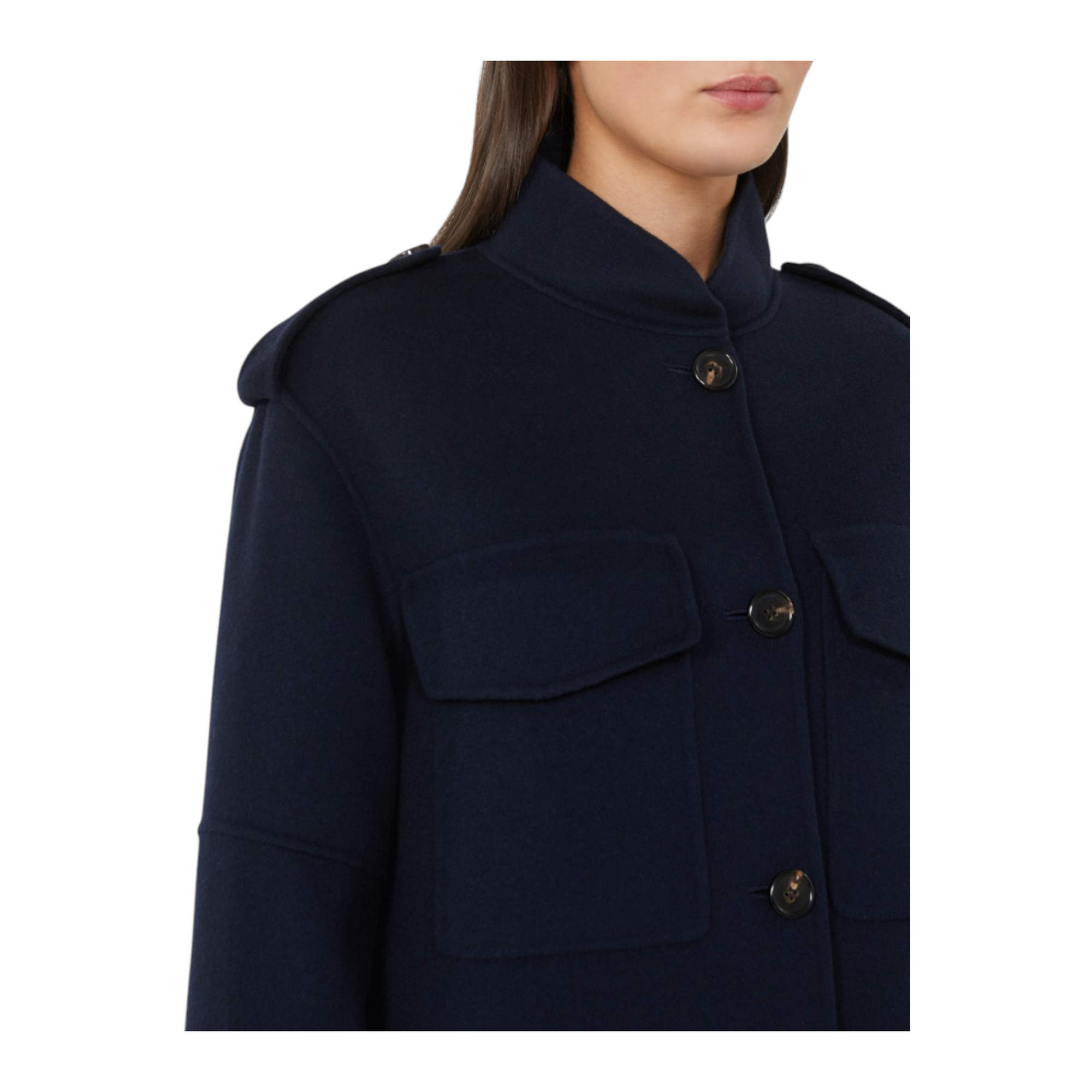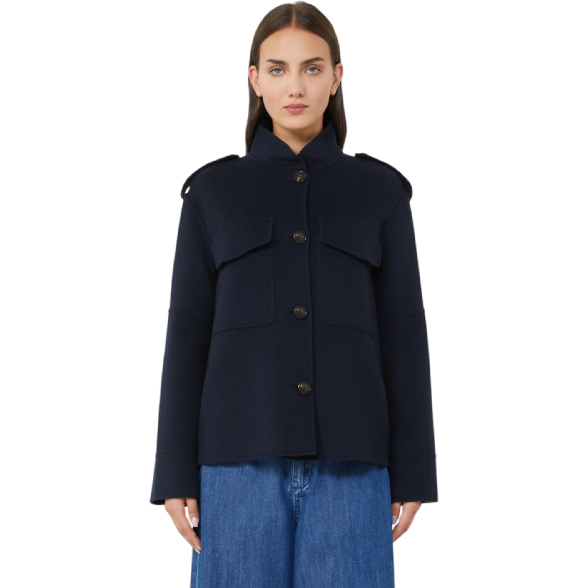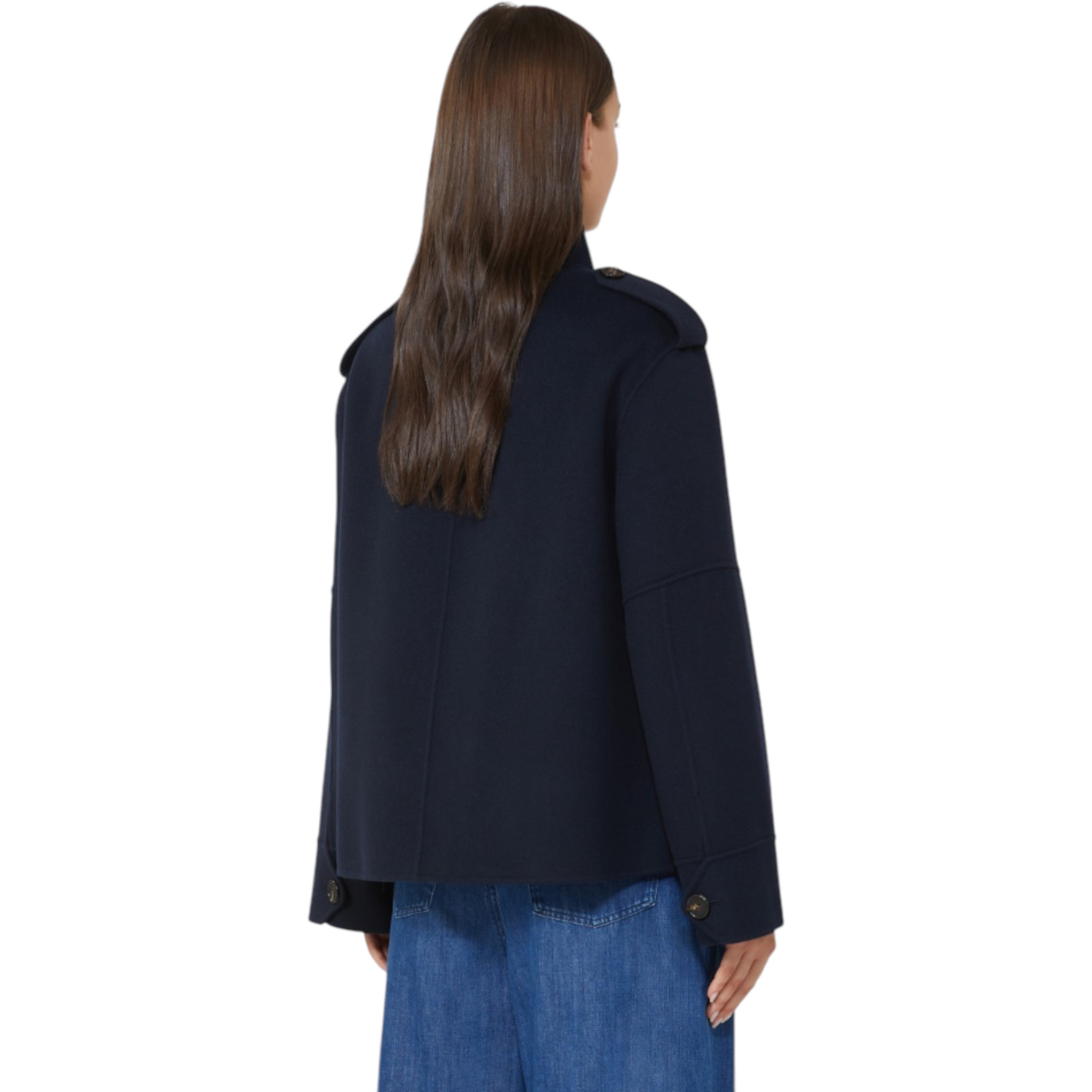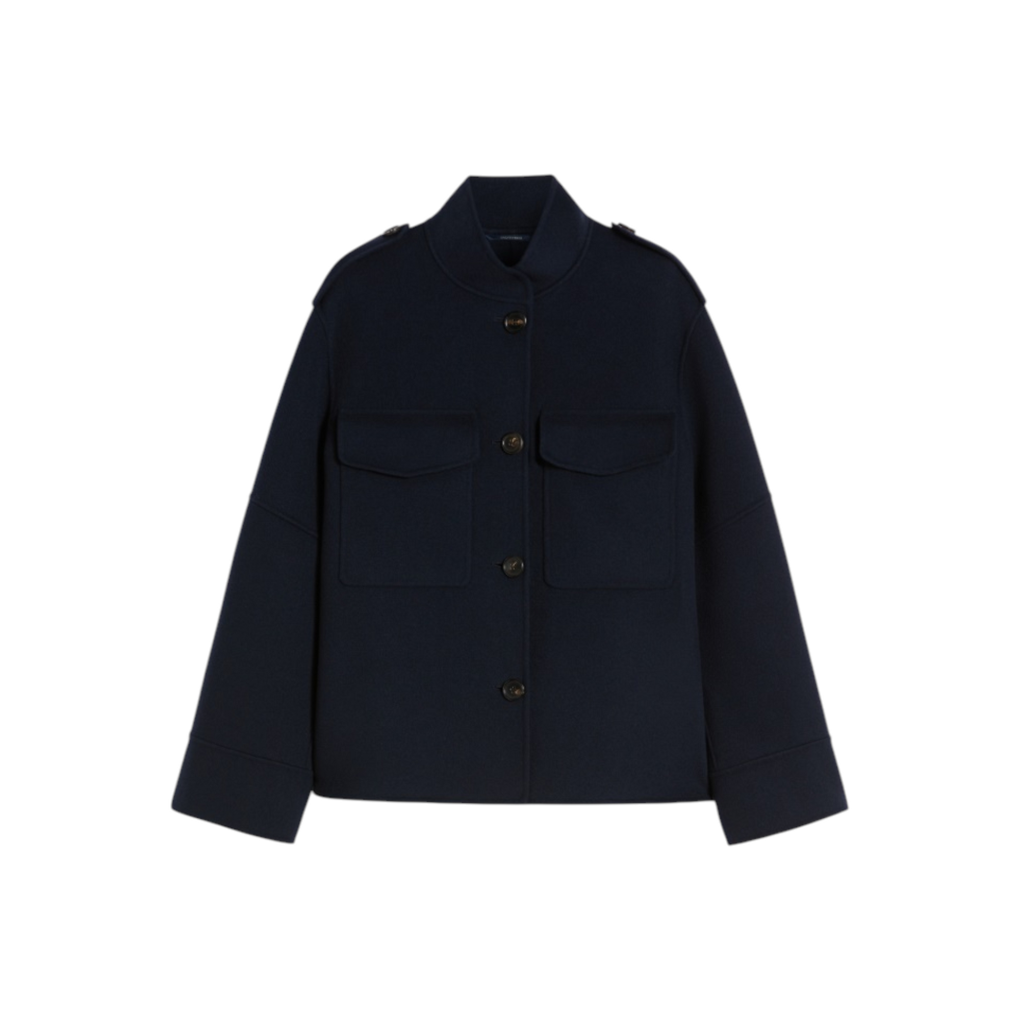 Eksklusiv håndsyet jakke i ren dobbeltvævet virgin wool med silkeærmer. Den korte, lige silhuet har sideslidser, stående krave og skulderstropper med epauletter. Lange ærmer med albuesøm, slids og hornknap ved manchetterne. Foran lukkes jakken med hornknapper og har brystlommer med klap. Delvist foret for et sofistikeret finish.