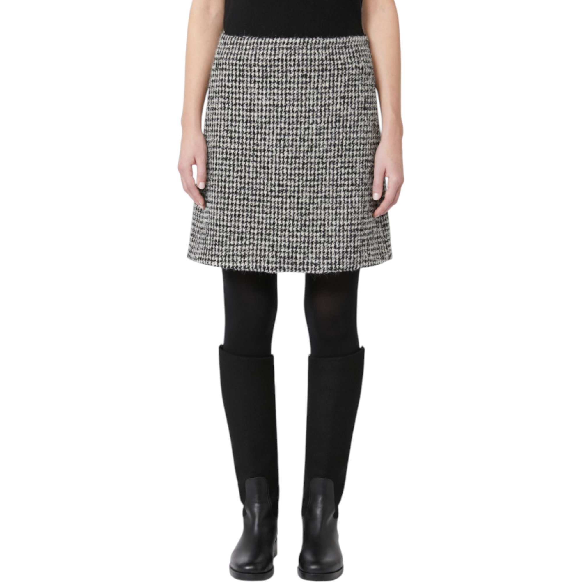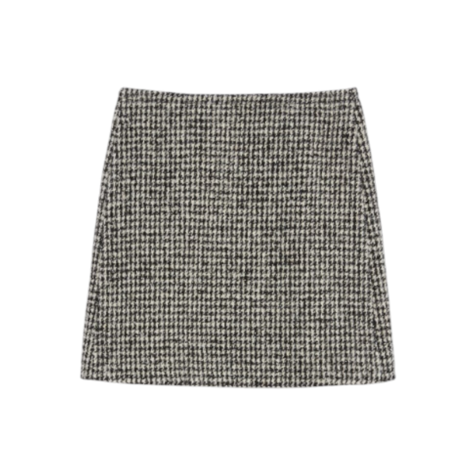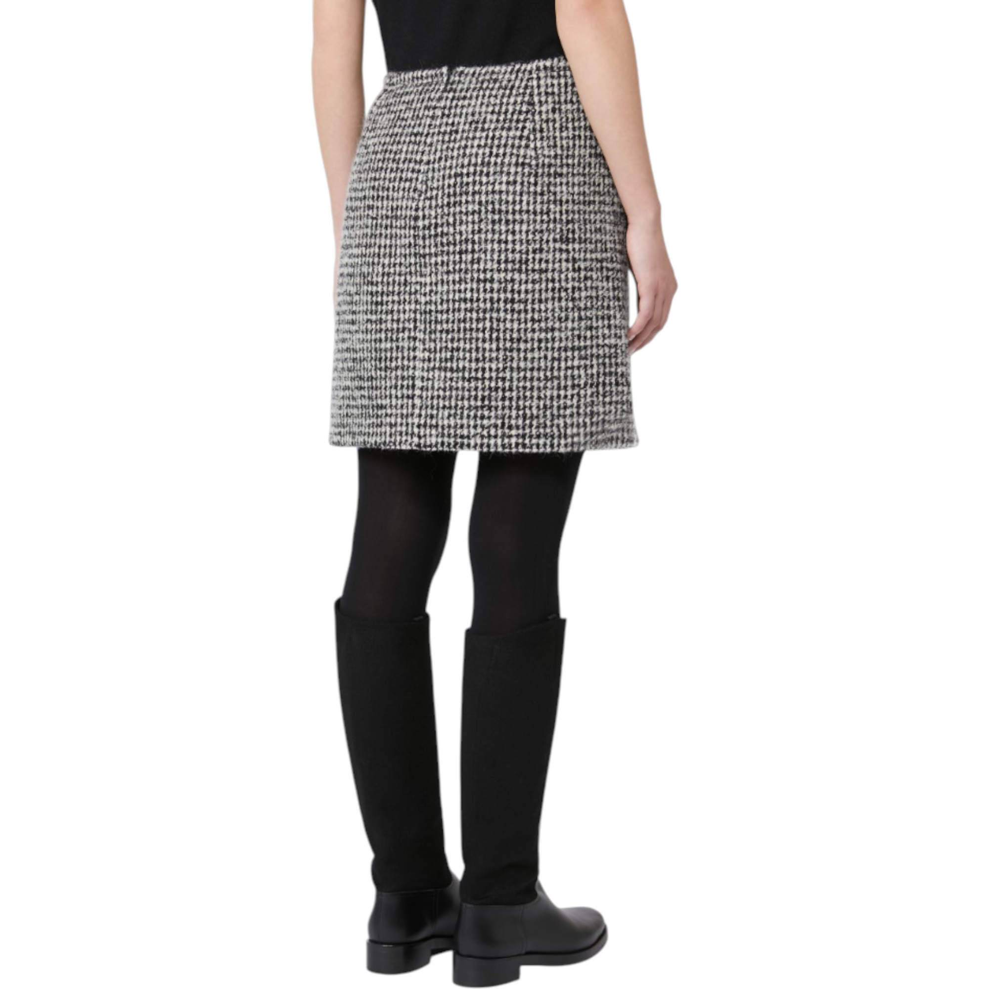 Mini-nederdel i bouclé med klassisk hundetandsmønster. A-formet pasform med mellemhøj talje og skjult lynlås bagpå. Taljen er formet med små indsnit, og modellen er fuldt foret for en flot silhuet. Materiale: 48 % ny uld, 18 % polyester, 14 % akryl, 11 % alpaka, 9 % polyamid. Foer: 100 % cupro, 100 % bomuld.