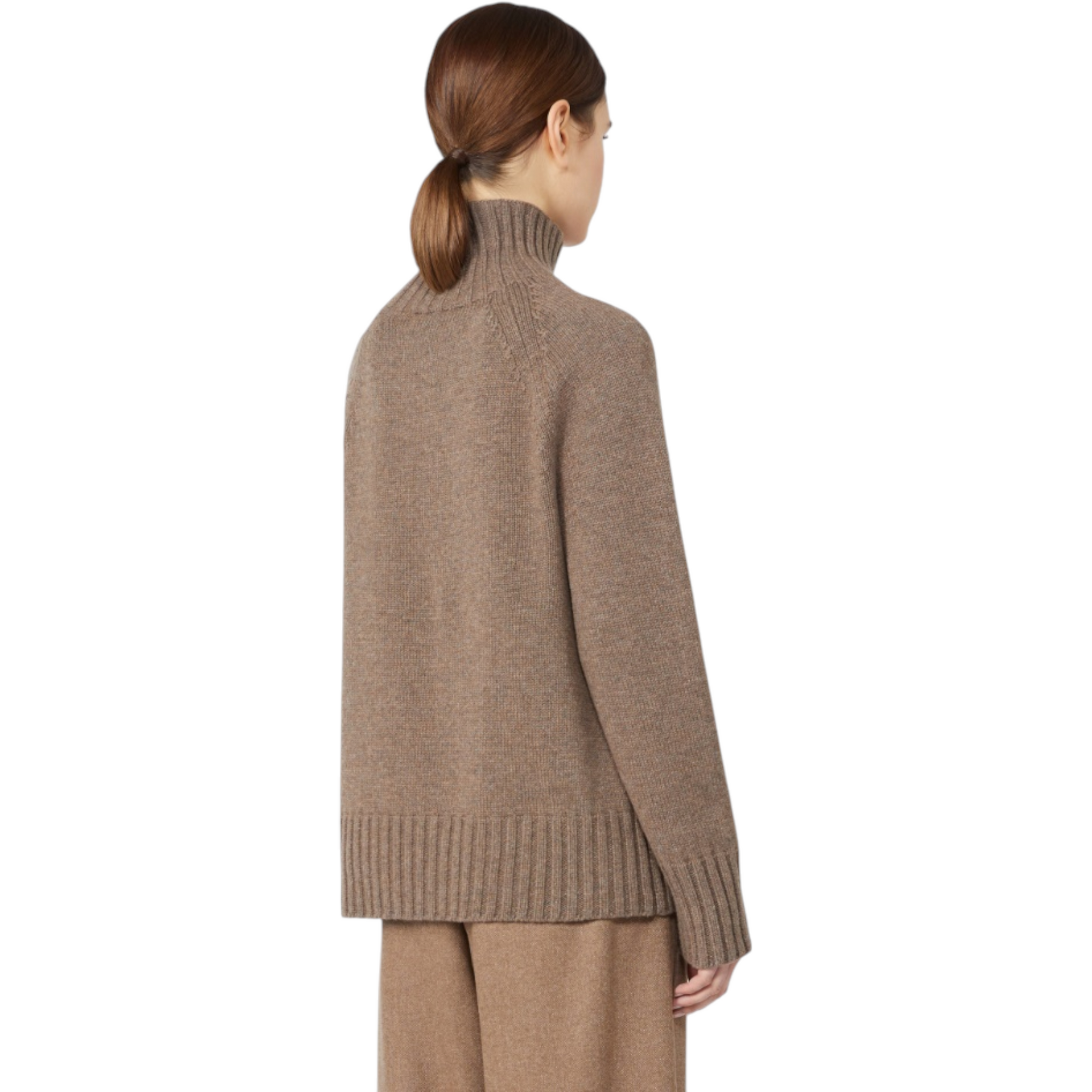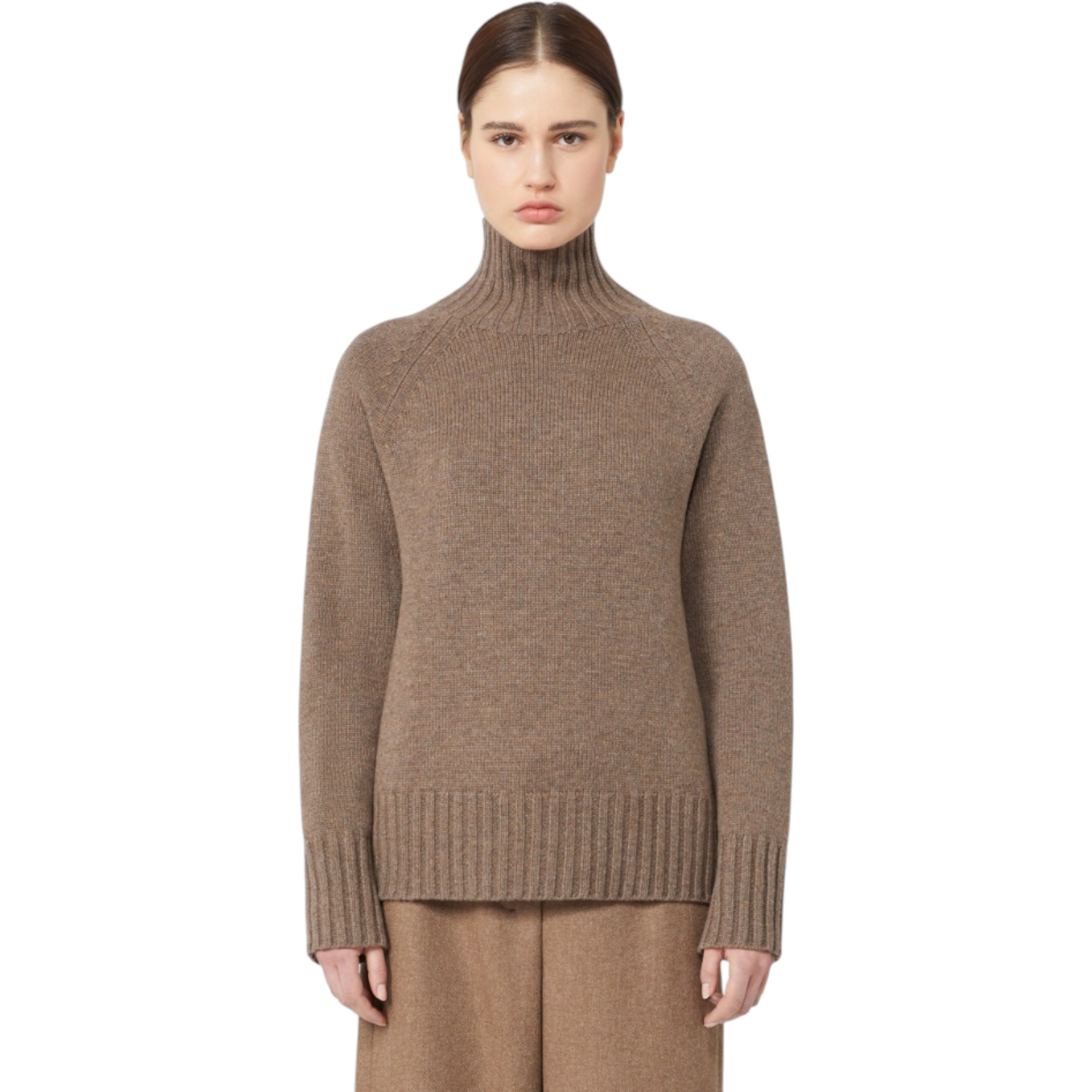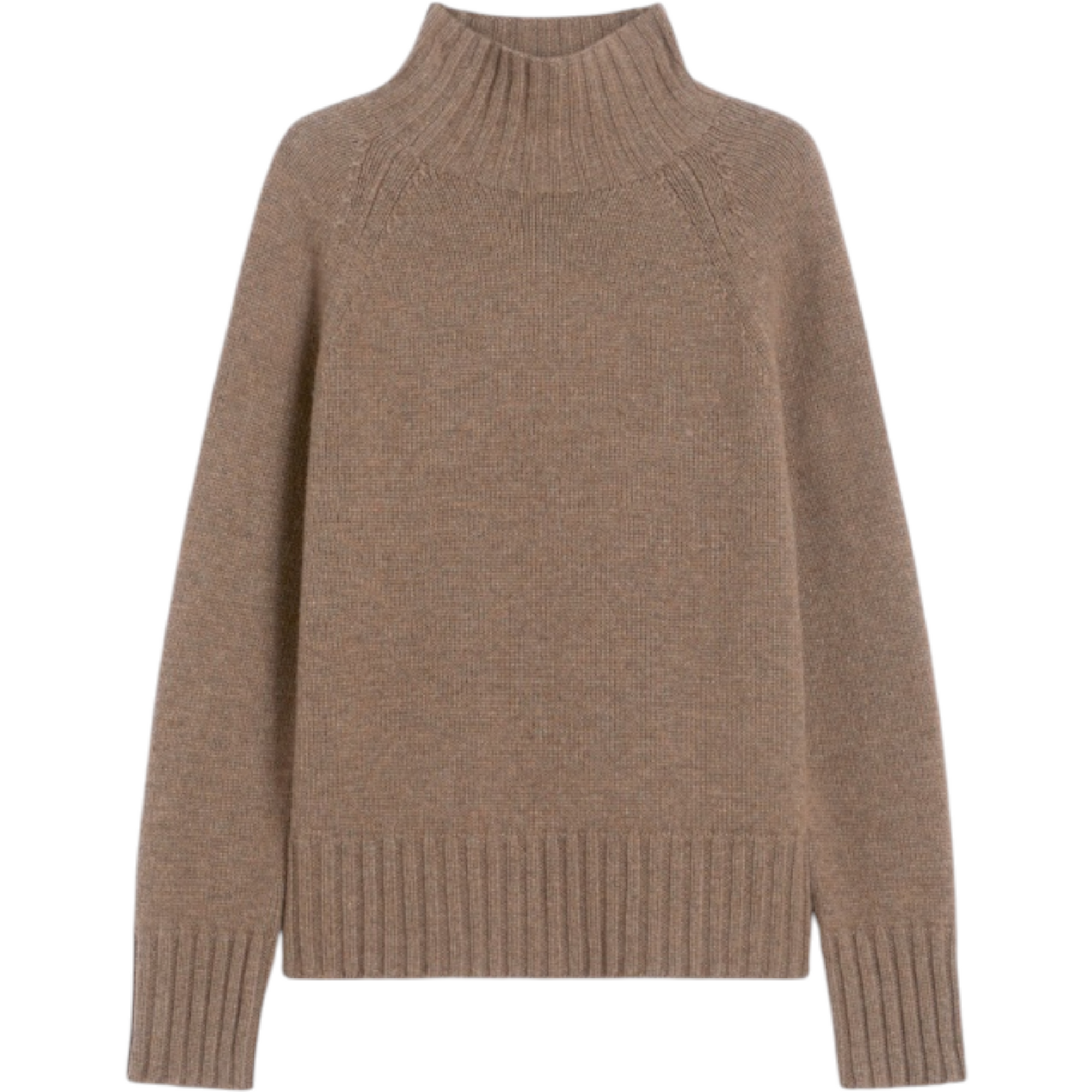 Klassisk og alsidig strik i uld- og cashmereblanding. Boxy pasform med høj hals, lange raglanærmer, ribkanter og lige afslutning.