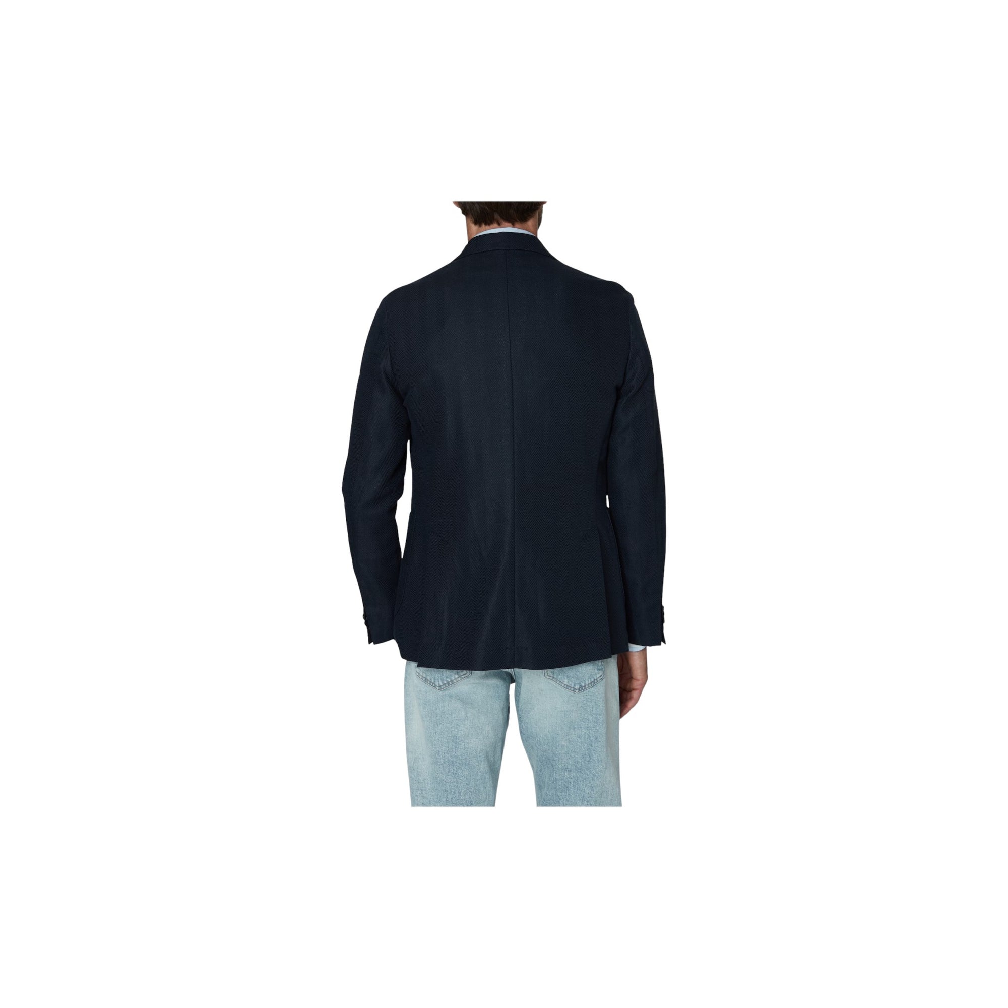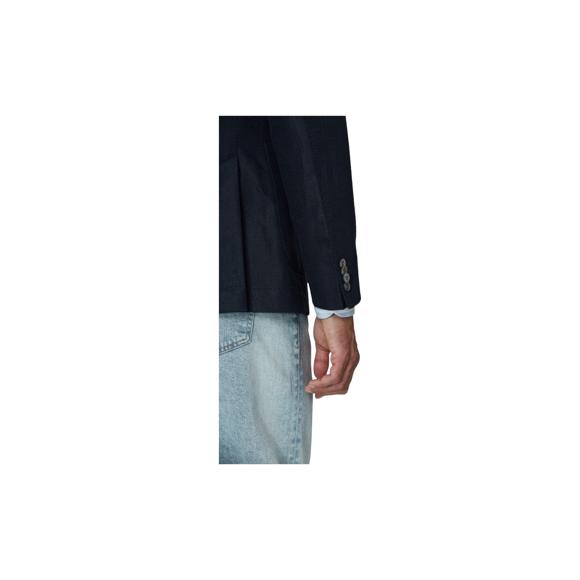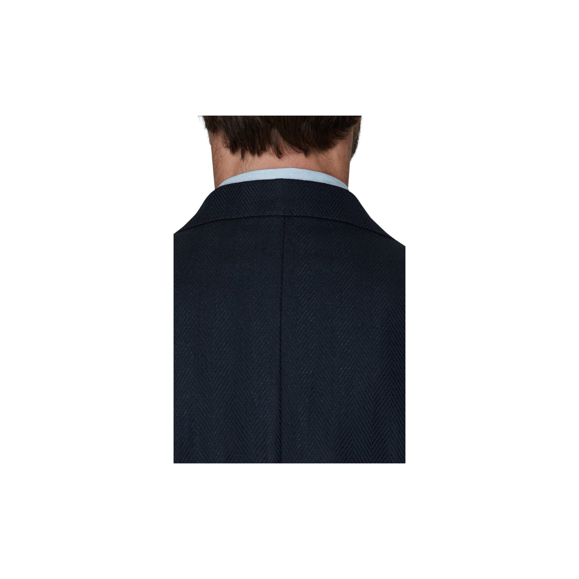 FARVE - MørkeblåSKULDER - UkonstrueretLOMMER - LapFORING - HalvforetLUKNING - EnkeltradetMATERIALE - BomuldMØNSTER - FiskebenSAMMENSÆTNING - Bomuld 65%, Hør 35%PASFORM - RegularMODELNAVN - Ferry -