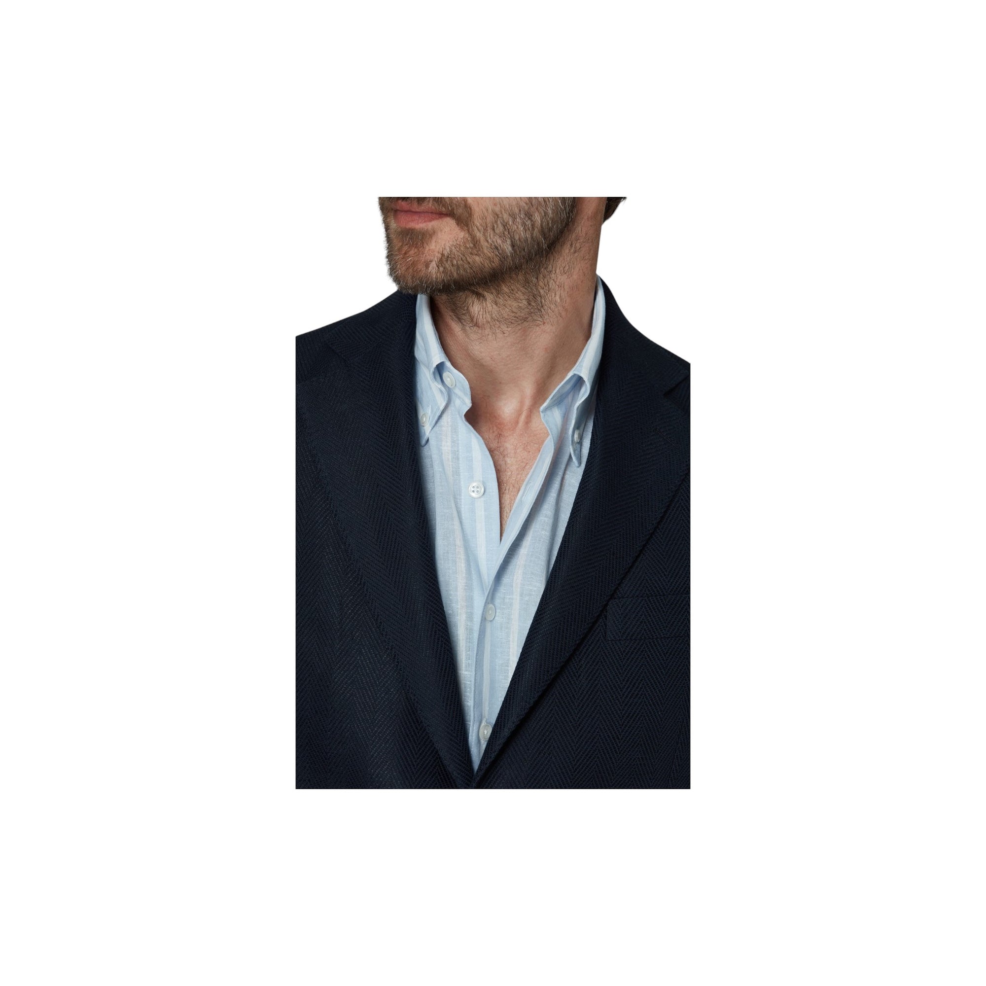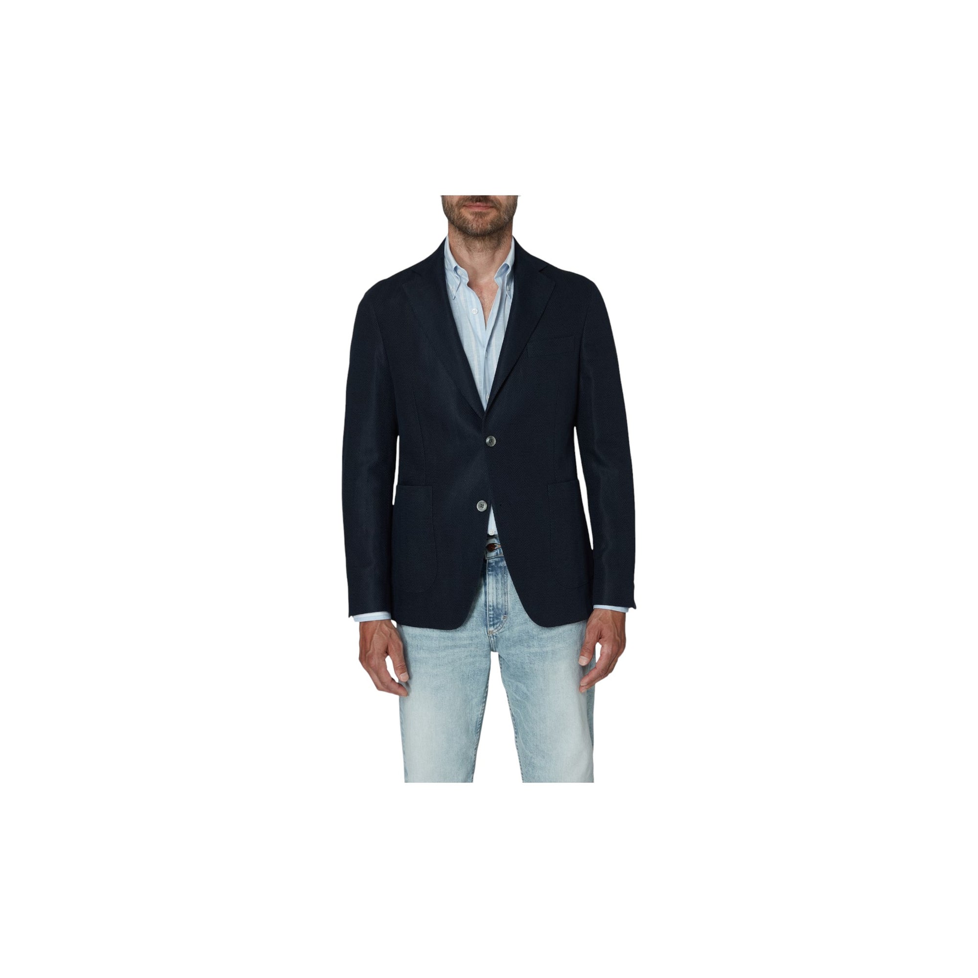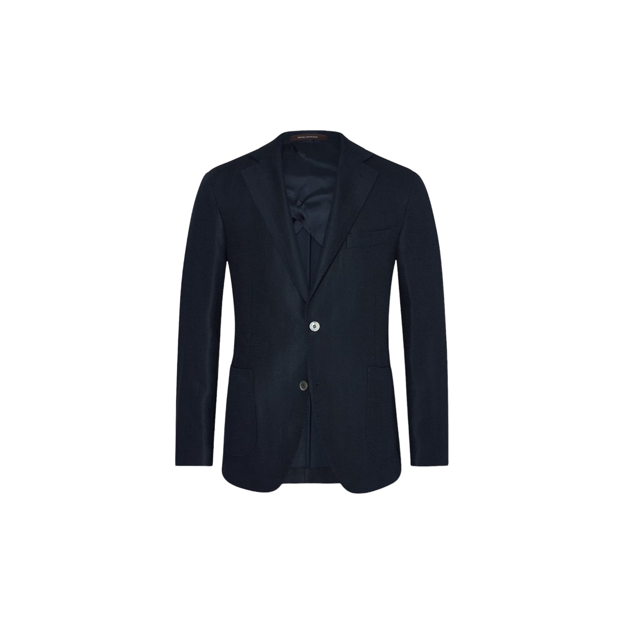 FARVE - MørkeblåSKULDER - UkonstrueretLOMMER - LapFORING - HalvforetLUKNING - EnkeltradetMATERIALE - BomuldMØNSTER - FiskebenSAMMENSÆTNING - Bomuld 65%, Hør 35%PASFORM - RegularMODELNAVN - Ferry -