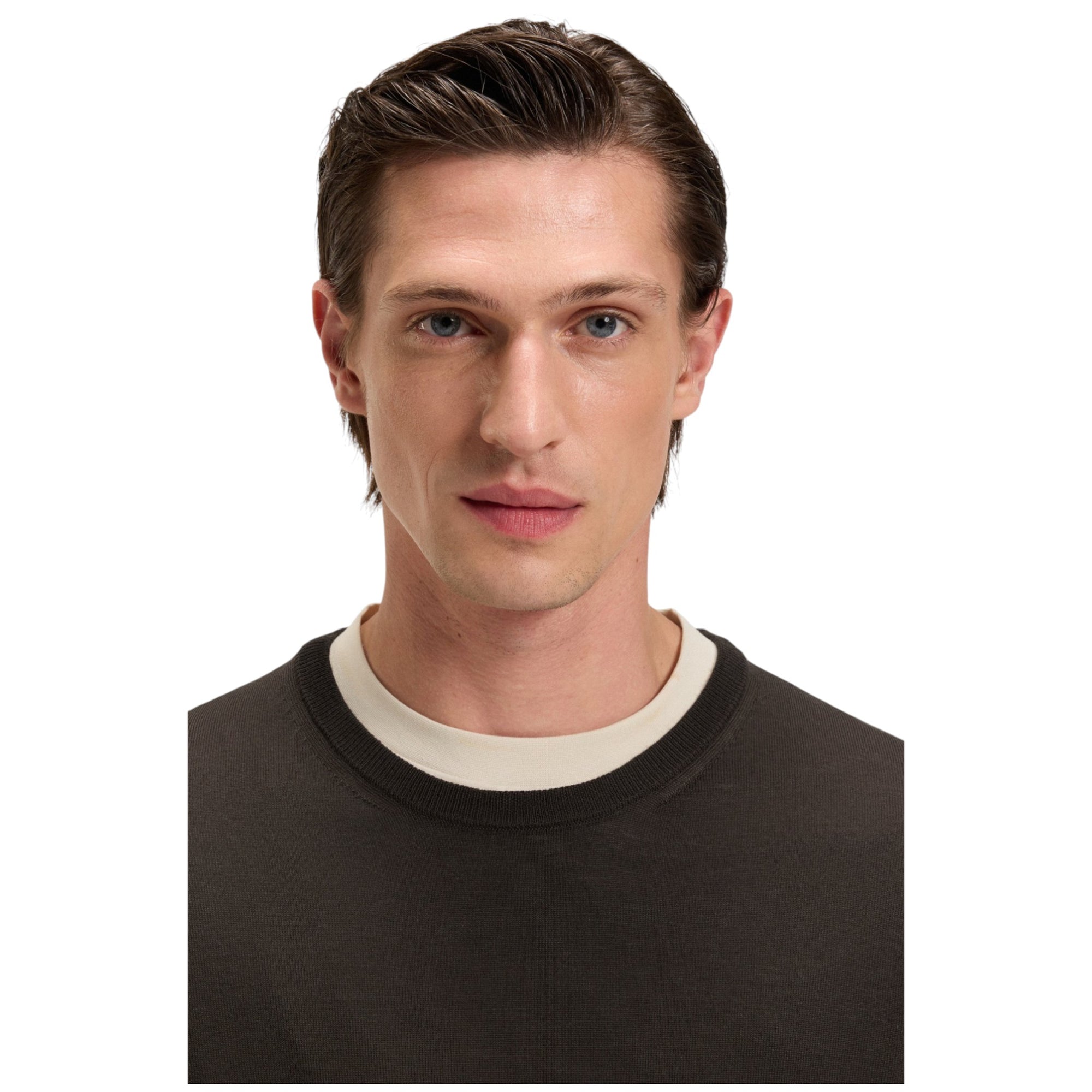 Detaljer som ribkanter ved hals, ærmer og forneden sikrer en elegant finish og holder formen vask efter vask. Den mørkebrune farve giver et eksklusivt og alsidigt look, der passer perfekt sammen med både jeans og chinos.