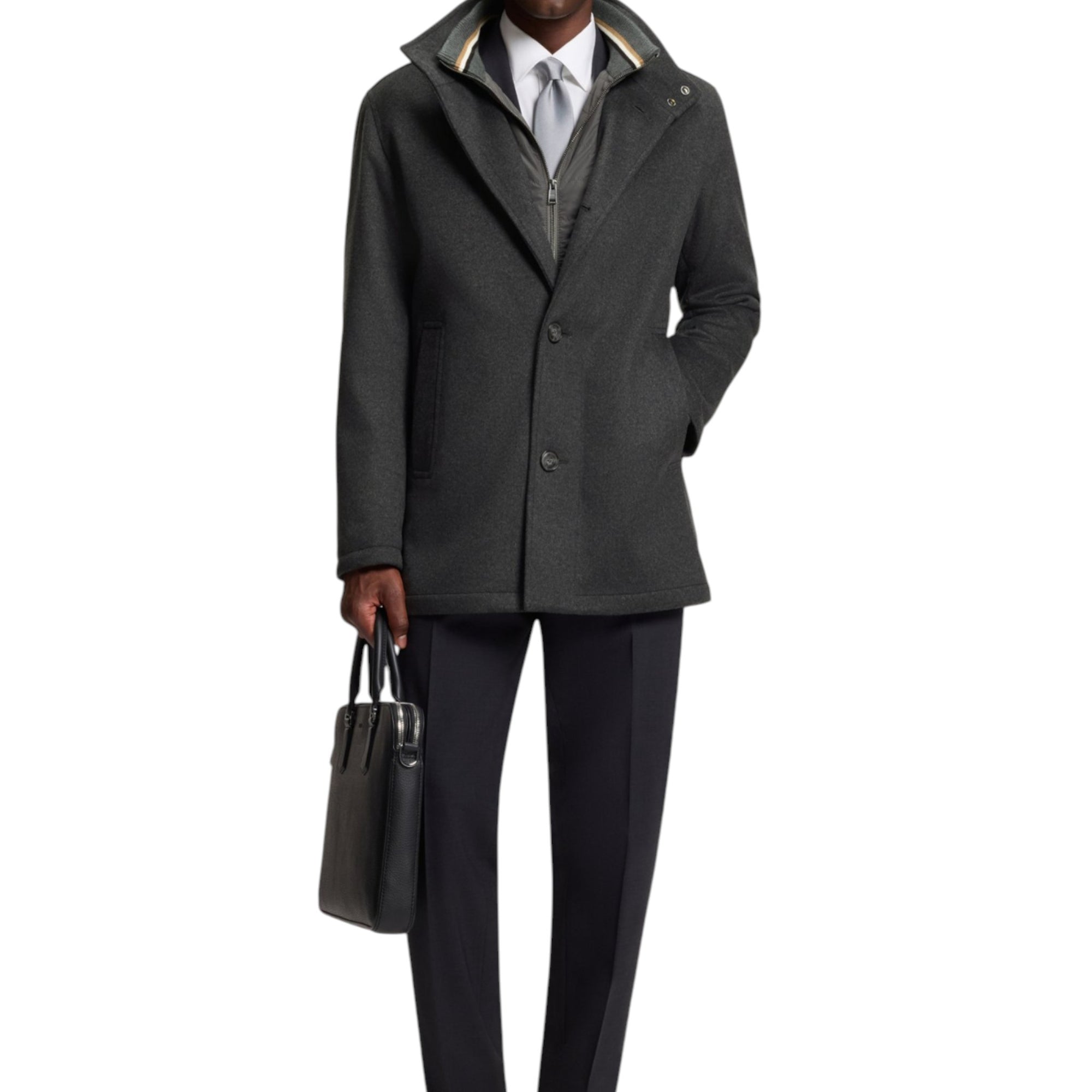 Denne grå frakke til mænd fra BOSS Menswear er fremstillet i en luksuriøs blanding af ny uld og kashmir, hvilket sikrer varme og en eksklusiv finish. Den afslappede pasform og det fuldt forede design gør frakken ideel til overgangsperioder og de kolde vinterdage.