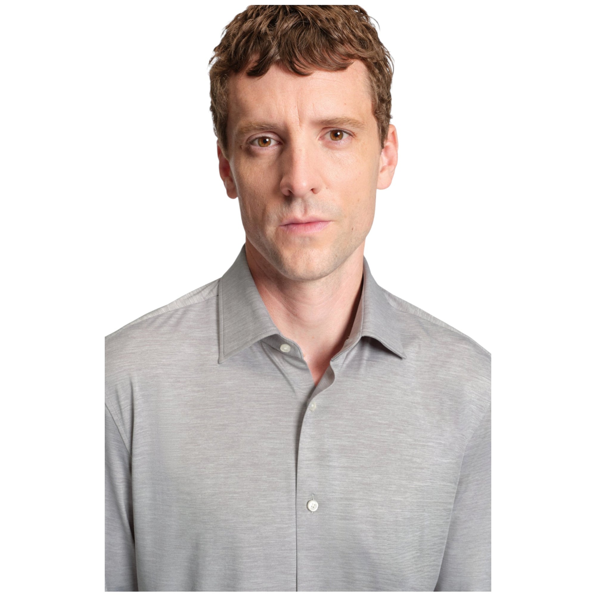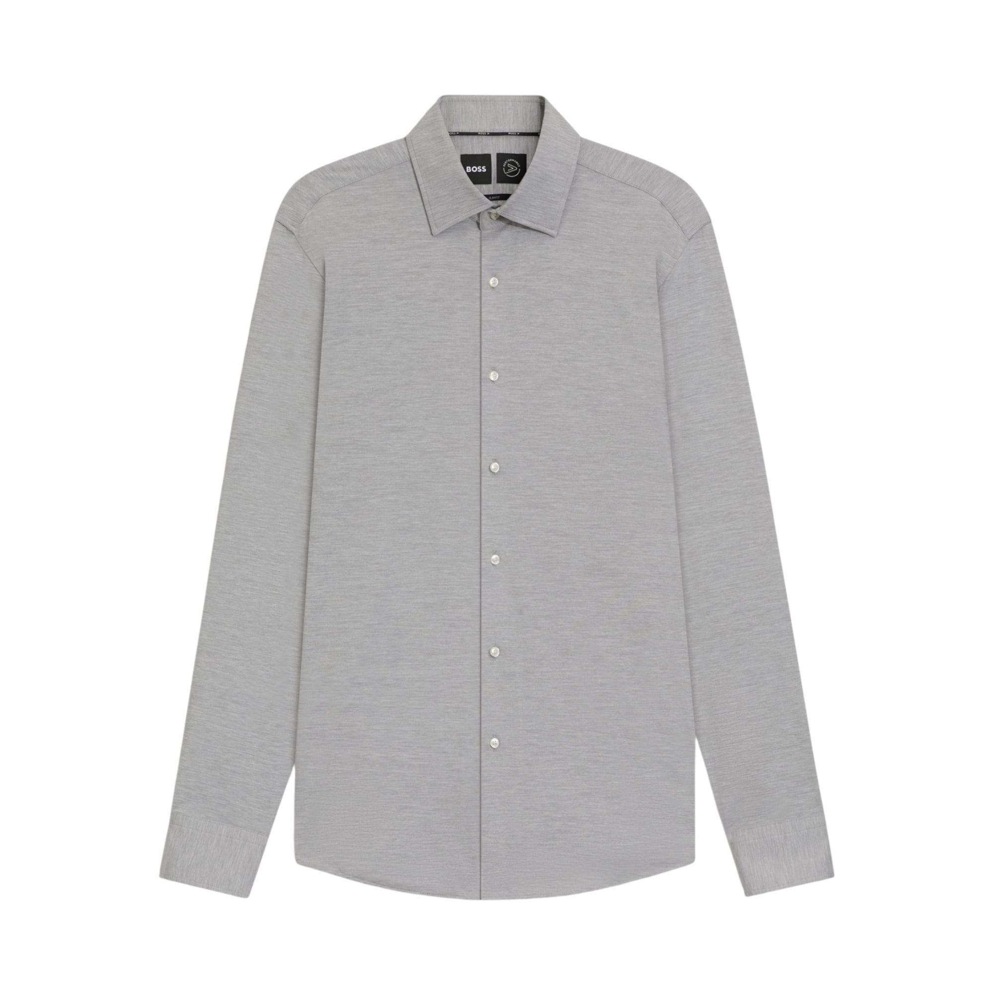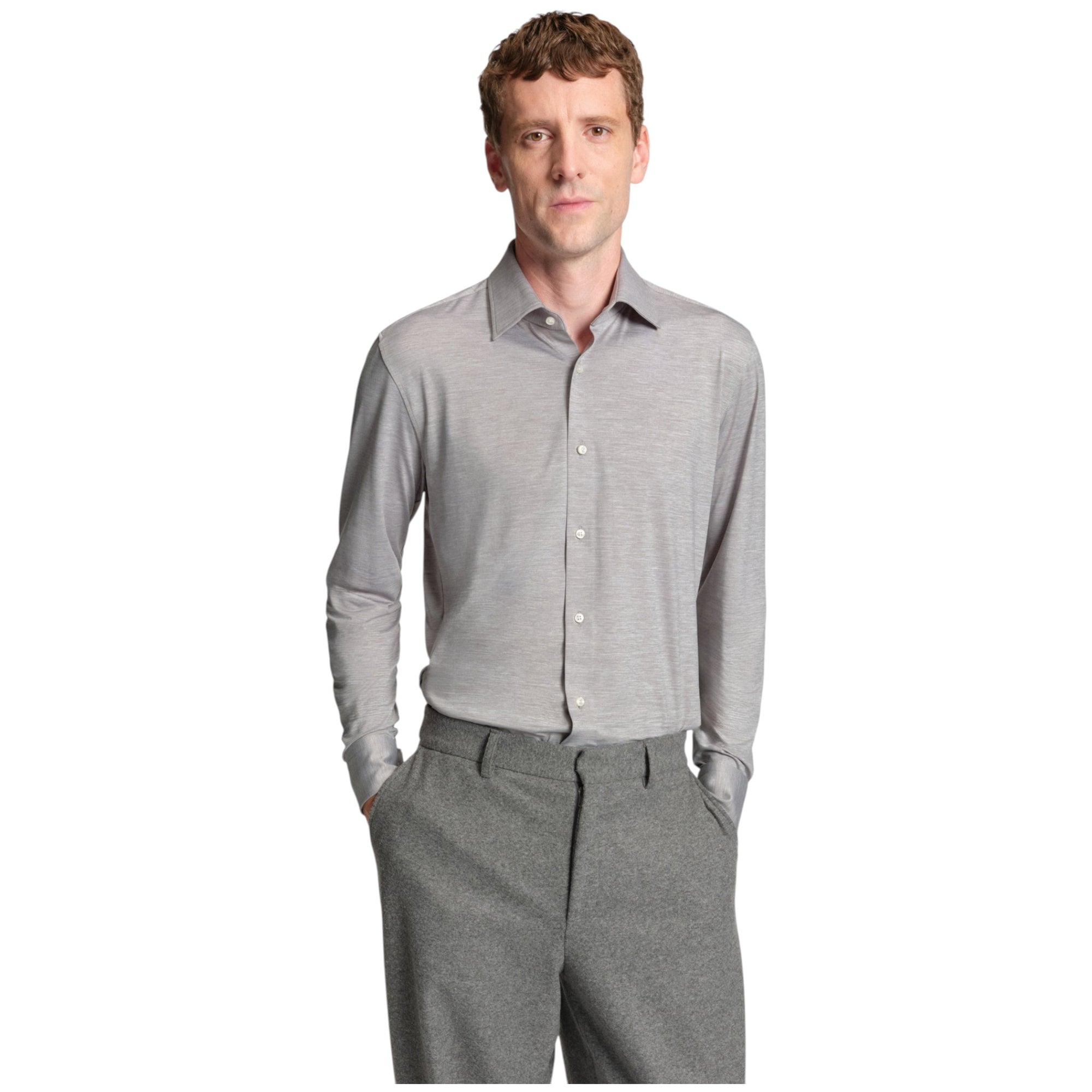 Den lysegrå farve gør skjorten nem at kombinere med både habitbukser og chinos, mens den klassiske Kent-krave og runde manchetter sikrer et tidløst og professionelt udseende. Den slanke pasform fremhæver kroppens silhuet uden at gå på kompromis med komforten.
