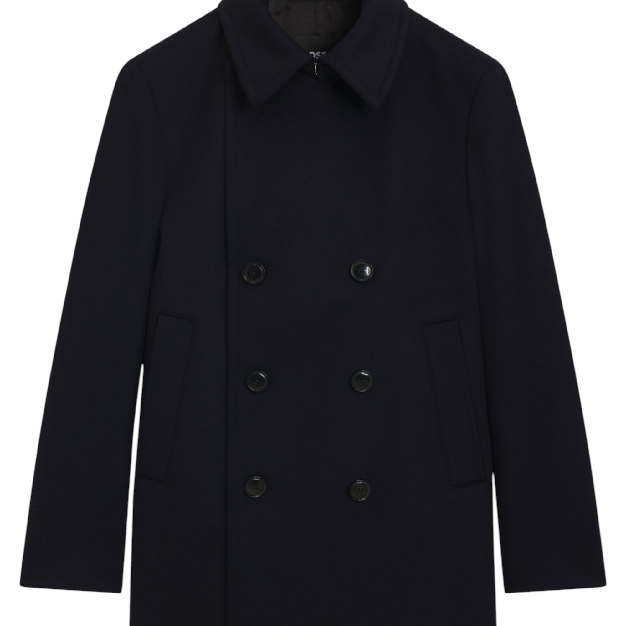 Denne dobbeltradede herrefrakke i navy er det ideelle valg til efterår og vinter. Brug den over en skjorte, blazer eller tynd strik – et alsidigt valg til både arbejde og fritid.
