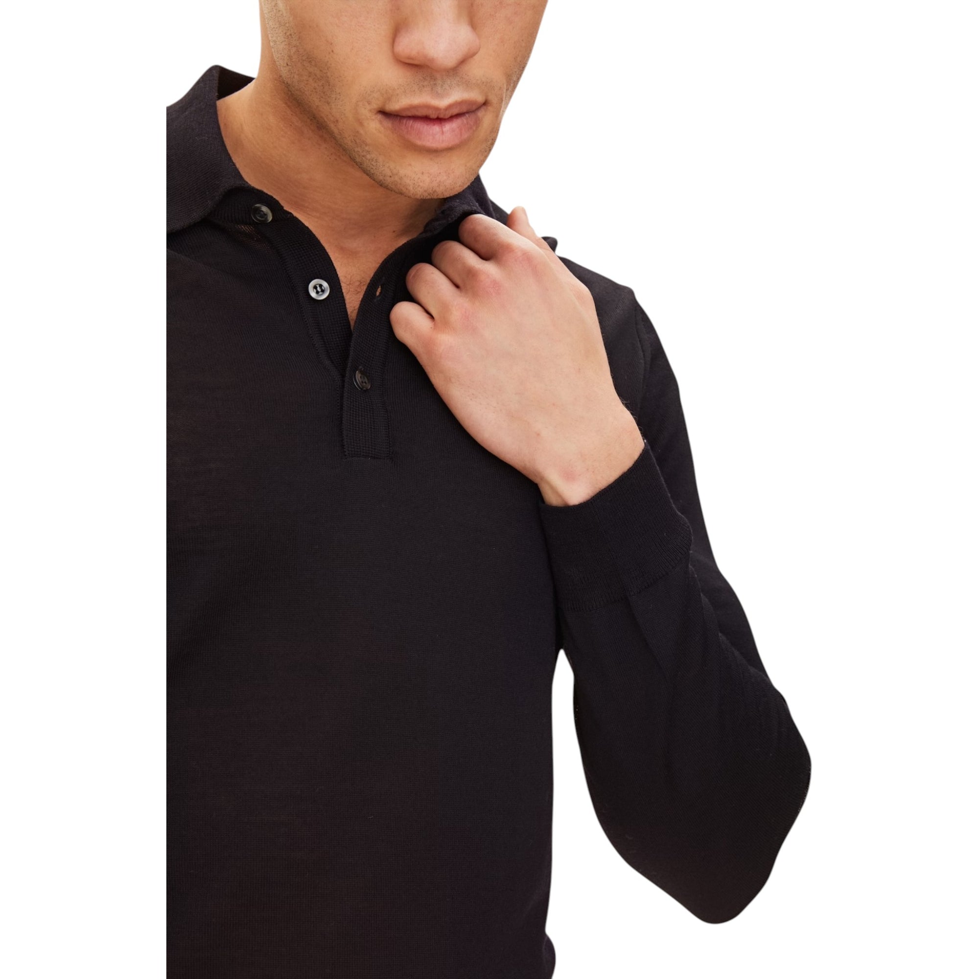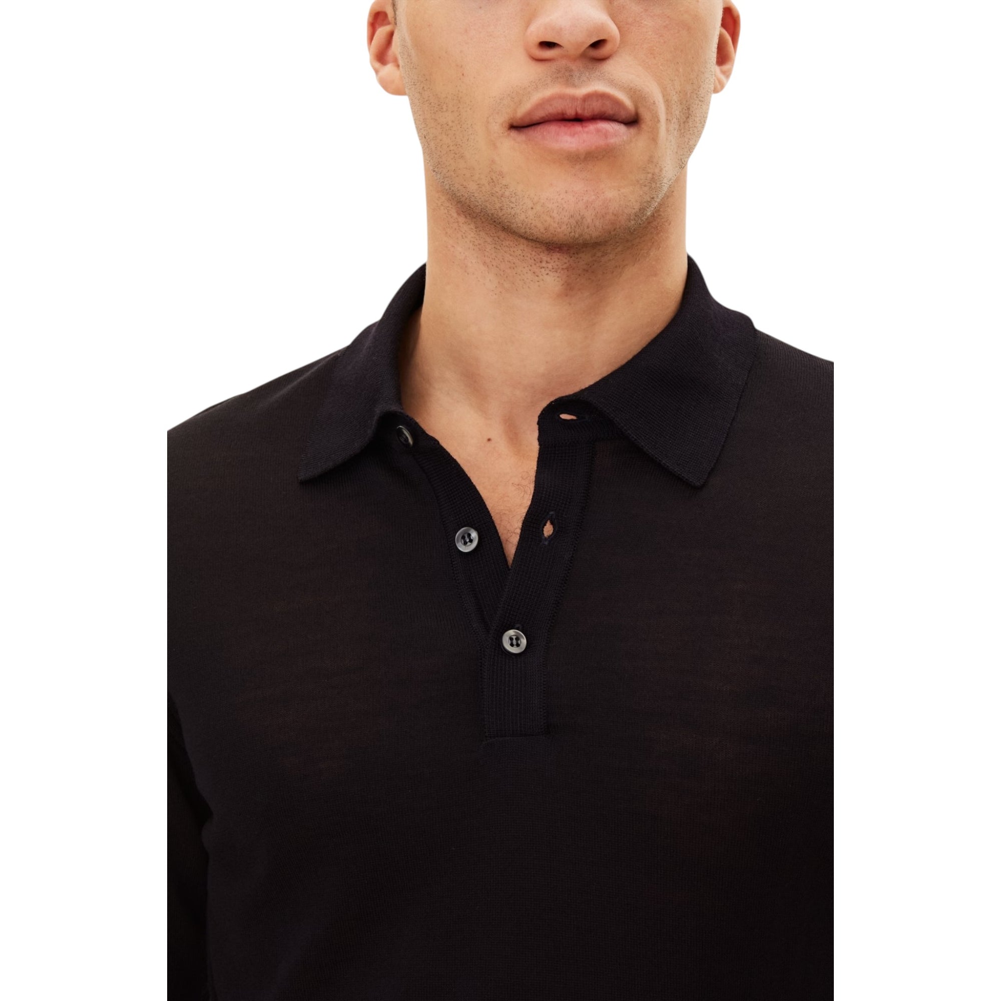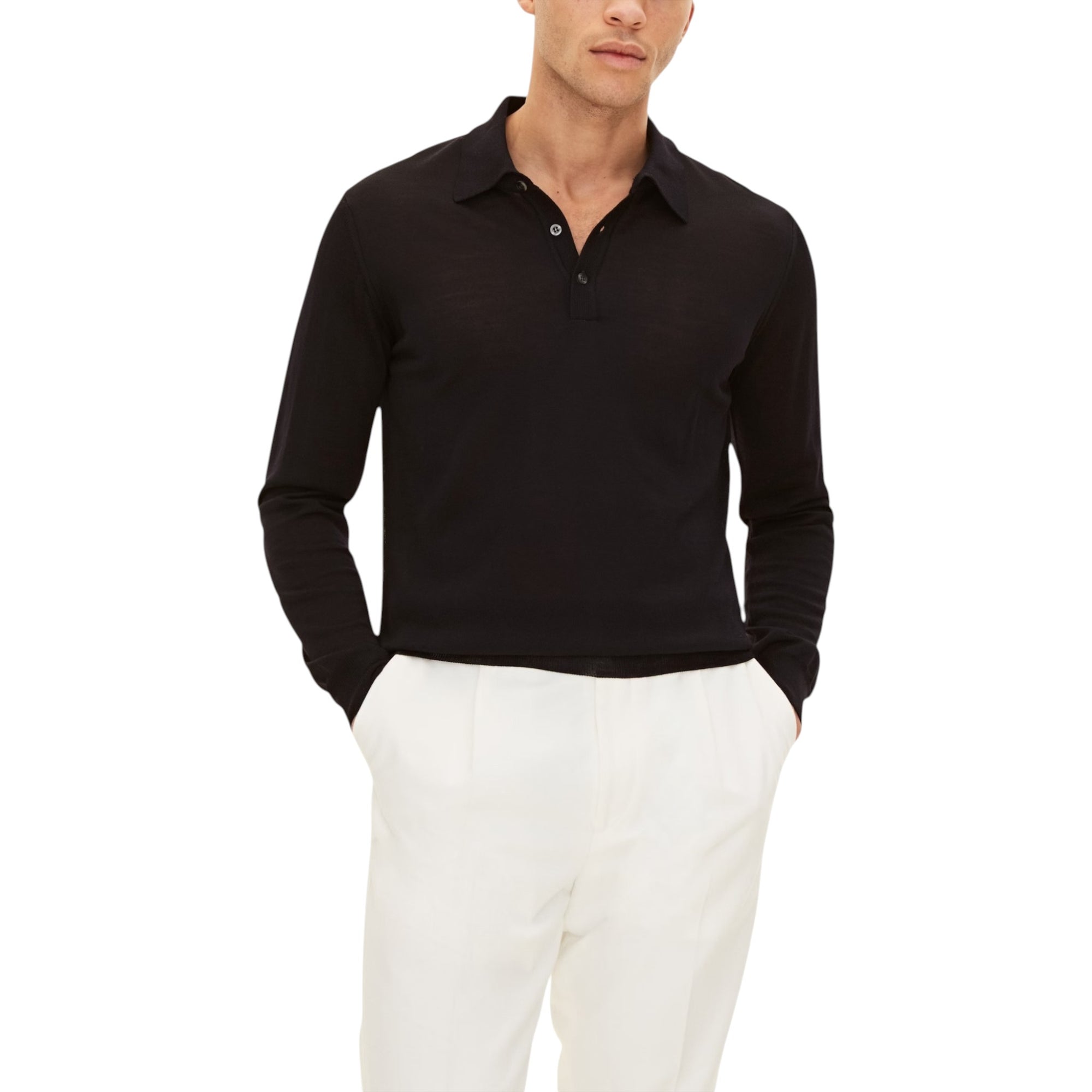 Den fine 14gg-strik og den strukturerede krave med tre knapper giver et skarpt, men afslappet udtryk – perfekt under en blazer eller alene med et par chinos.