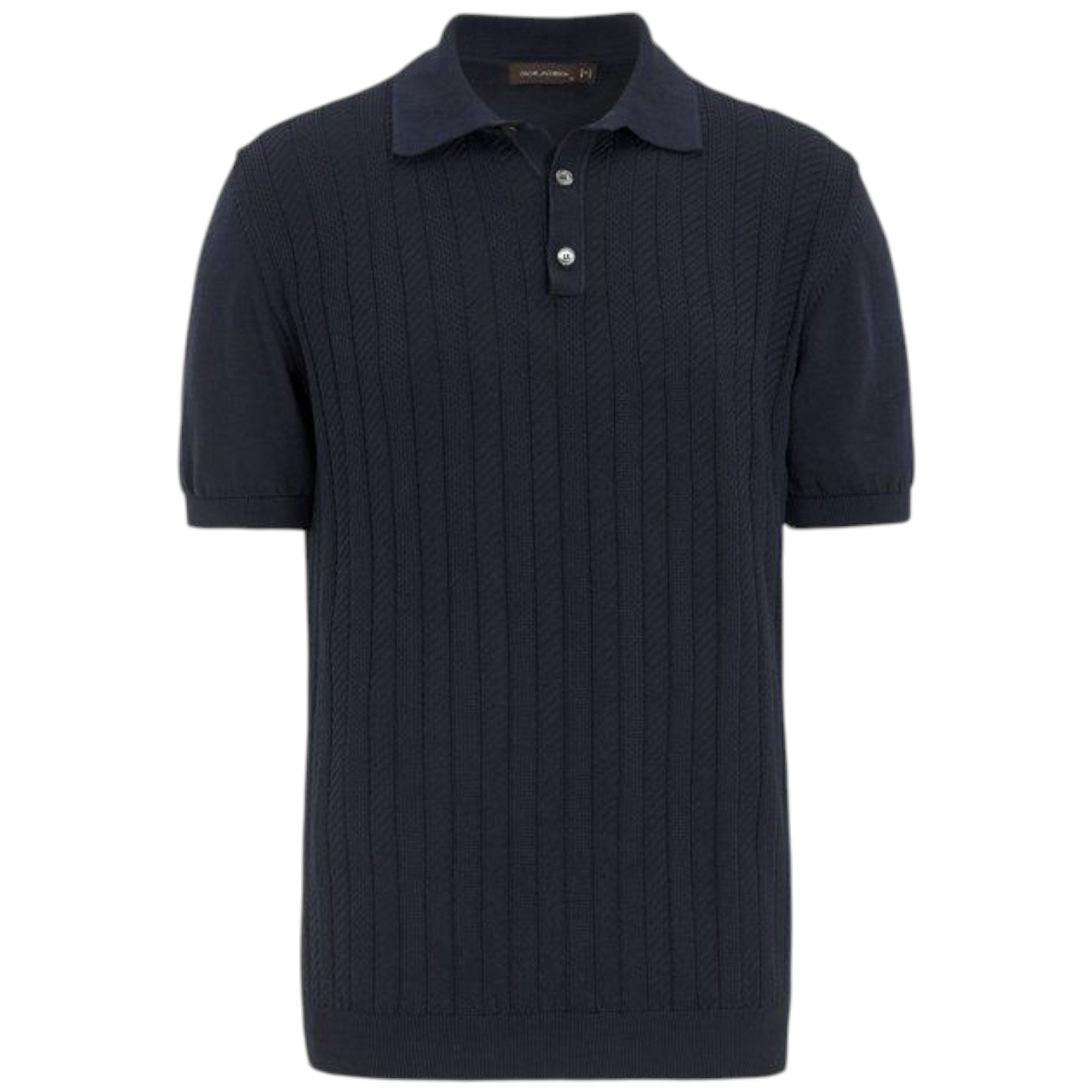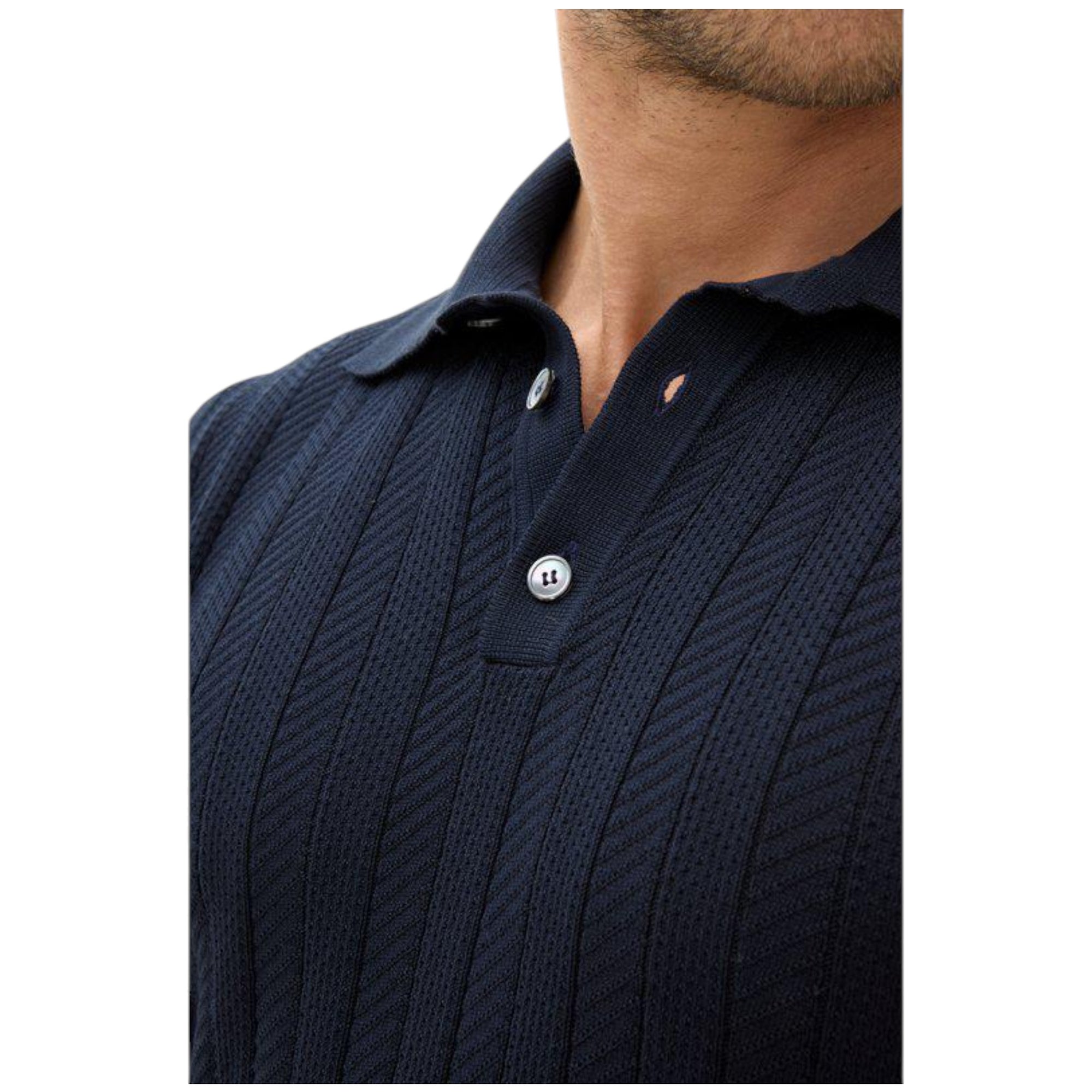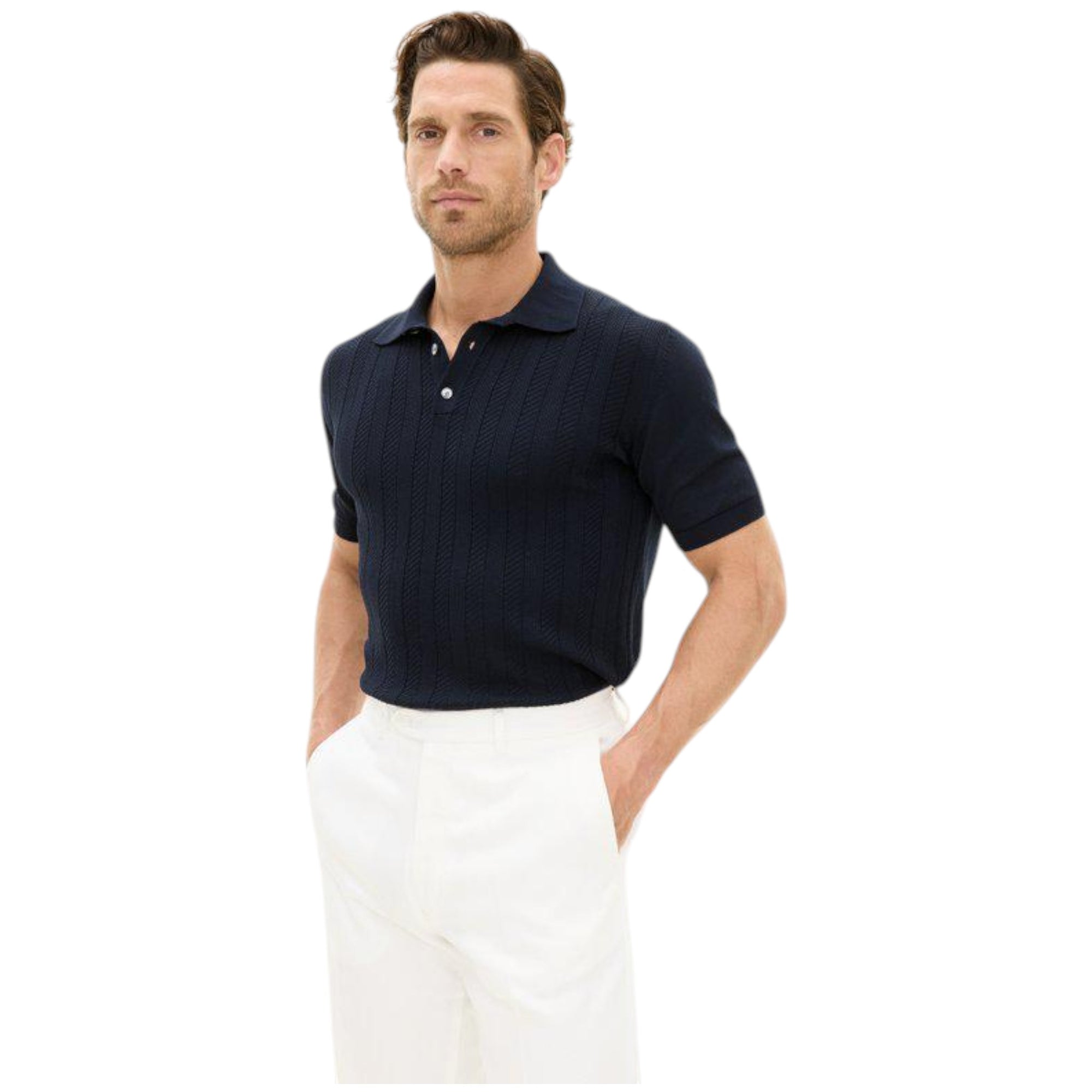 Den navy strukturerede polo skjorte kombinerer klassisk elegance med moderne design. Fremstillet i 100% bomuld og strikket i 12gg, giver poloen en raffineret struktur og en behagelig, let kvalitet.