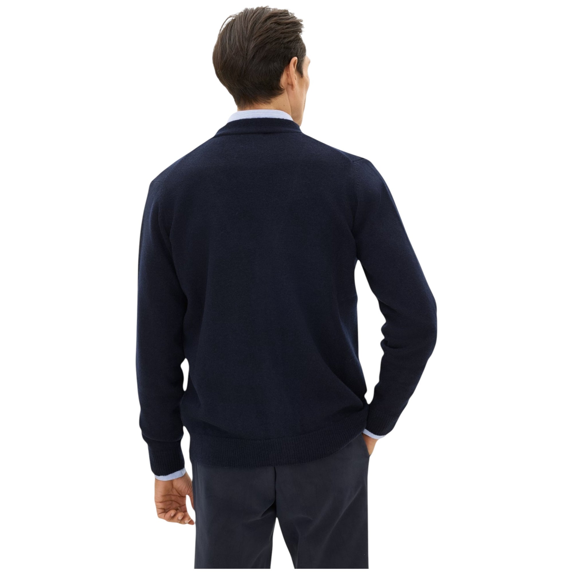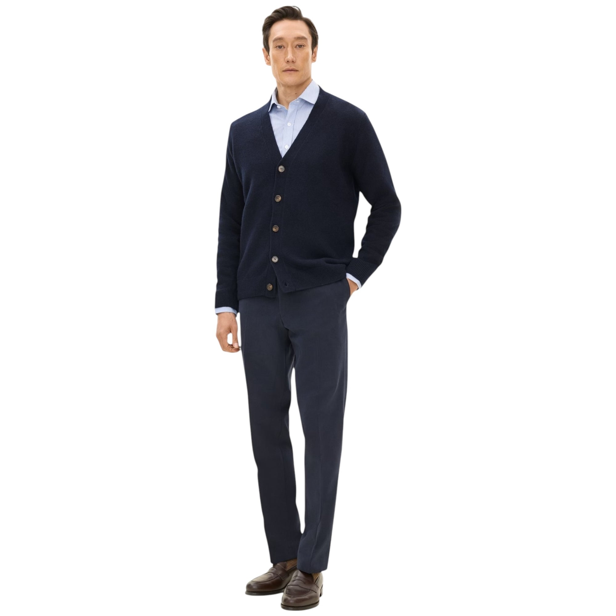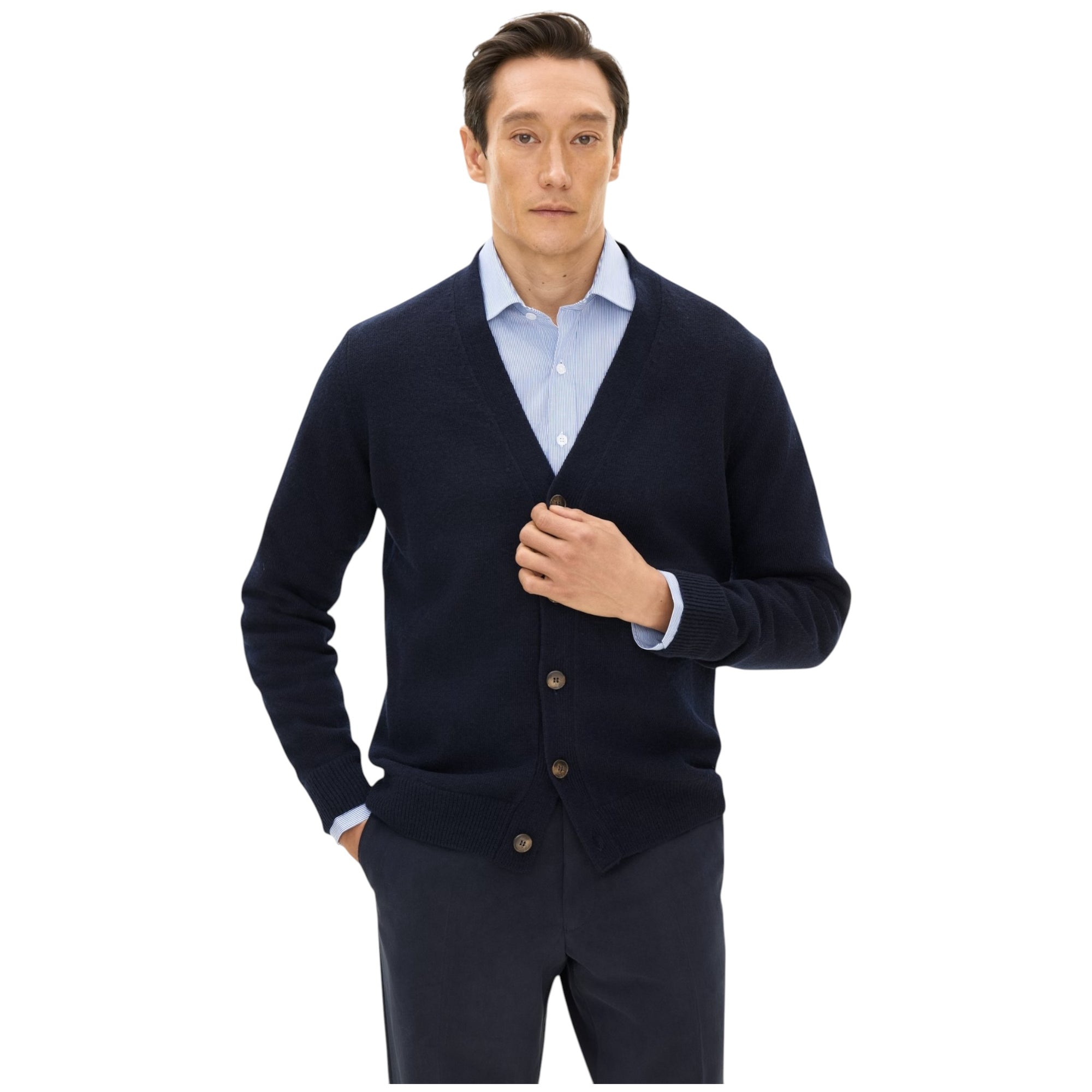 Opgrader garderoben med vores Eduardo Regular Fit Cardigan i navy – en tidløs klassiker, der kombinerer komfort, kvalitet og stil. Denne mørkeblå cardigan til mænd er strikket i en blød lammeuldsblanding (80% uld, 20% polyamid), der giver en luksuriøs fornemmelse og fremragende holdbarhed.