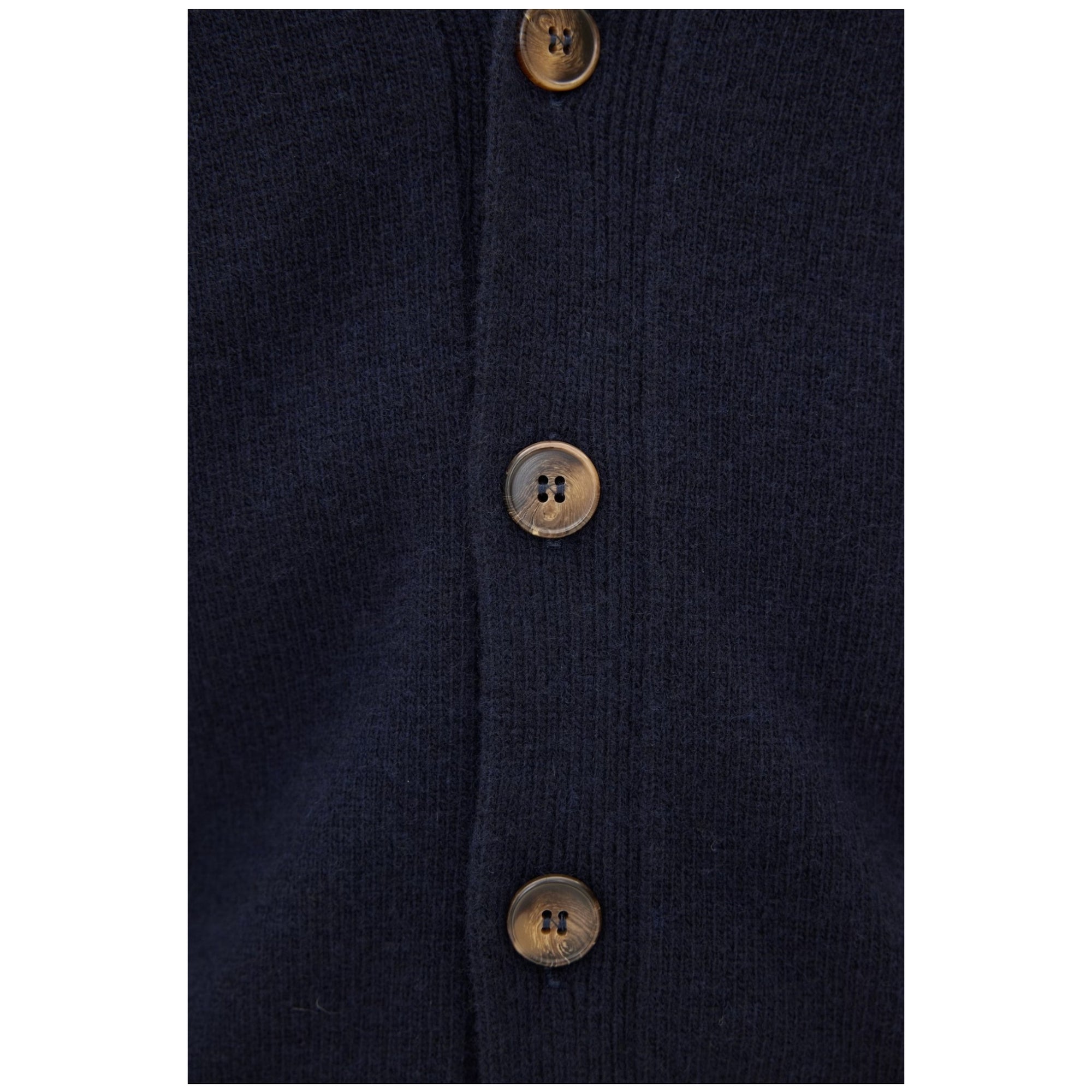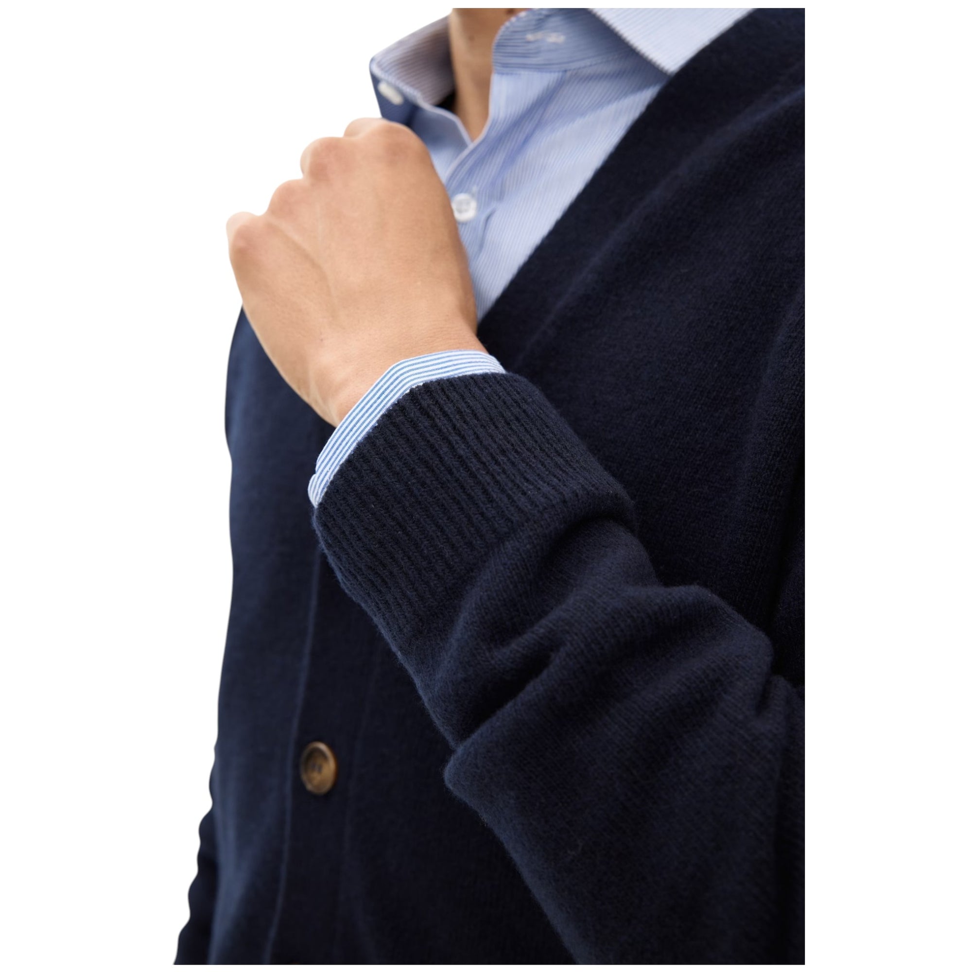 Cardiganen har en klassisk V-hals, brune knapper foran og en 1x1 ribkant ved ærmer og forneden, som sikrer et elegant og velsiddende look. Den regular fit pasform gør den ideel over både skjorter og t-shirts – perfekt til både arbejde og fritid.
