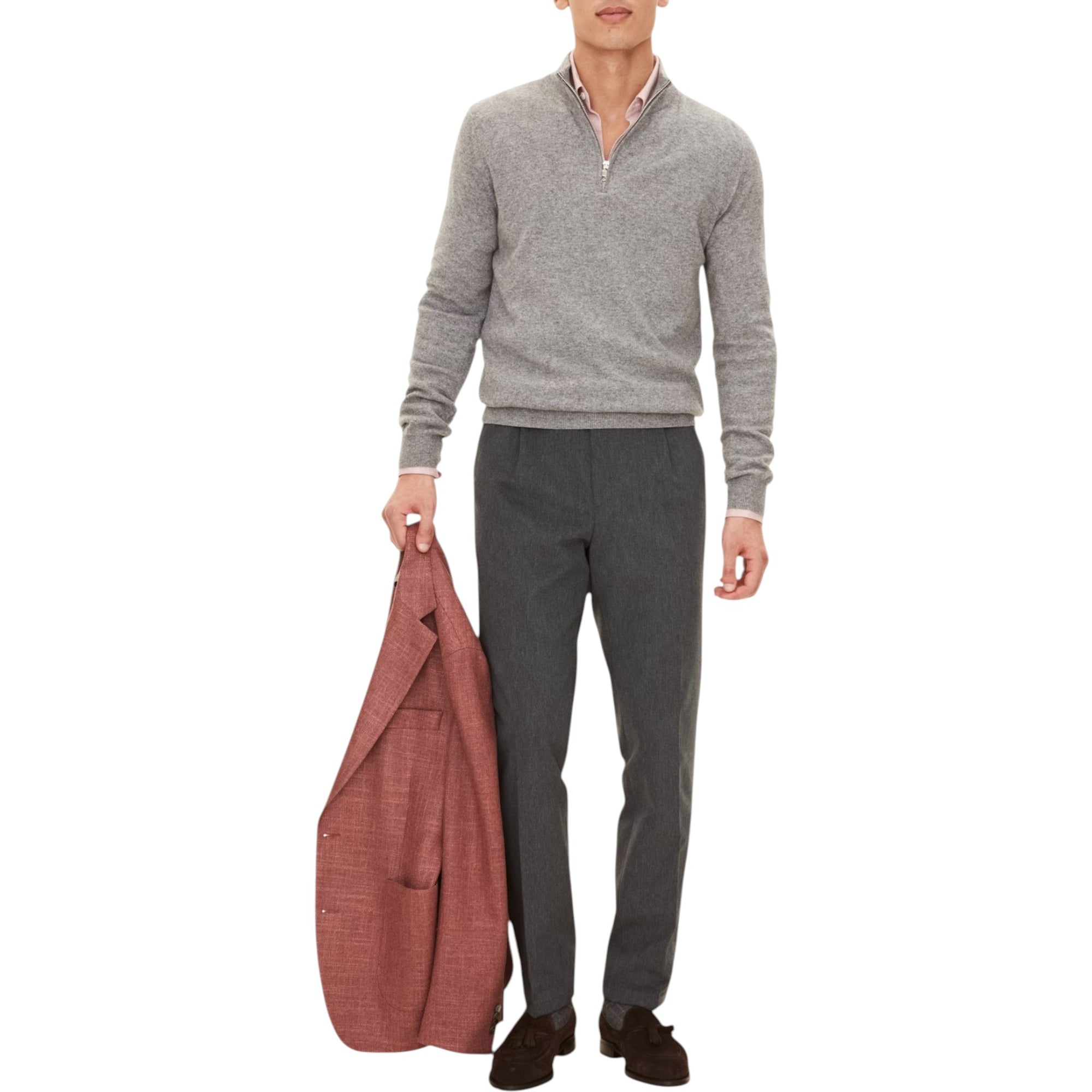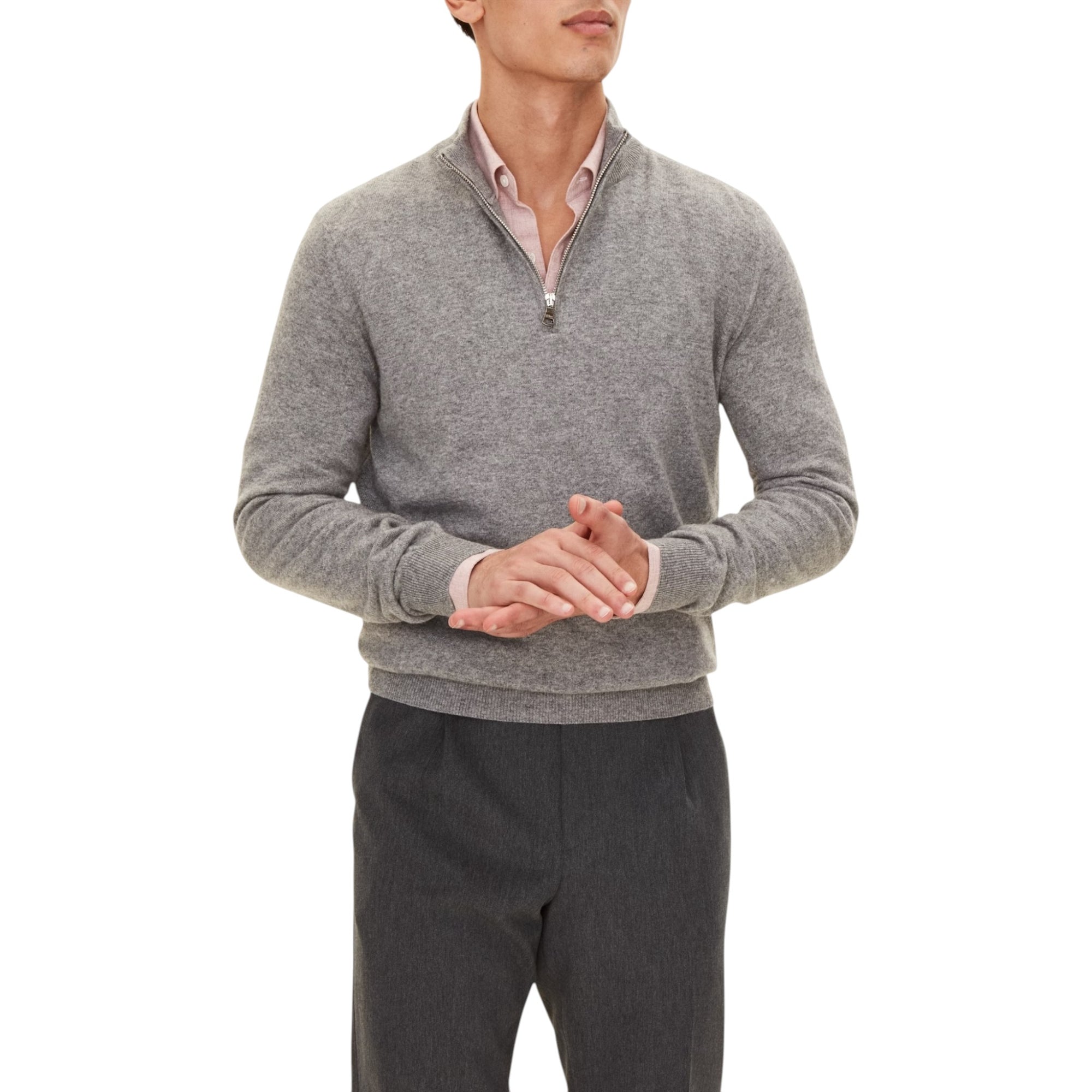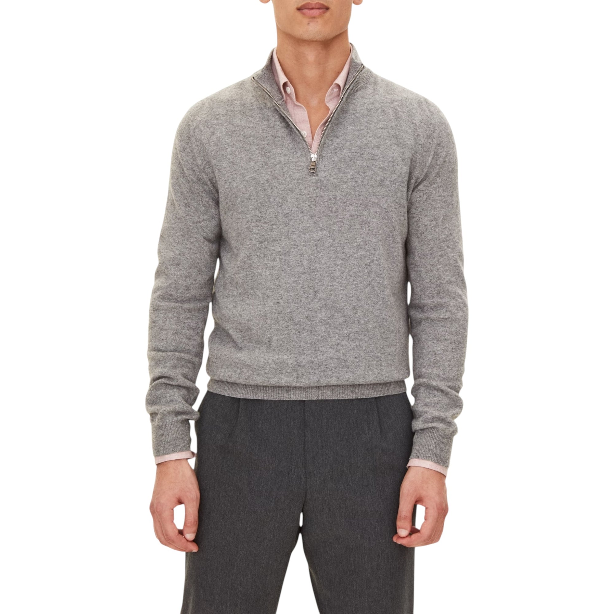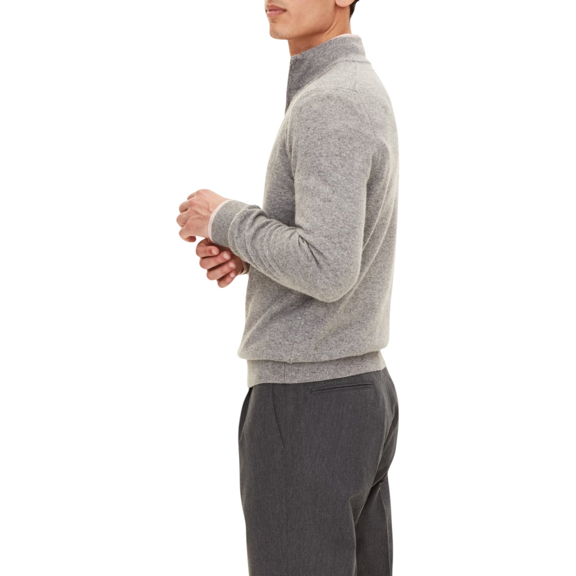 Denne trøje er ideel til dig, der søger en stilren og komfortabel herretrøje i uld og kashmir. Den egner sig både til afslappede hverdagsoutfits og mere formelle lag-på-lag looks med skjorte under. Half-zip designet gør den alsidig og let at style – lyn op for et mere casual udtryk eller lyn helt op for en poleret finish.