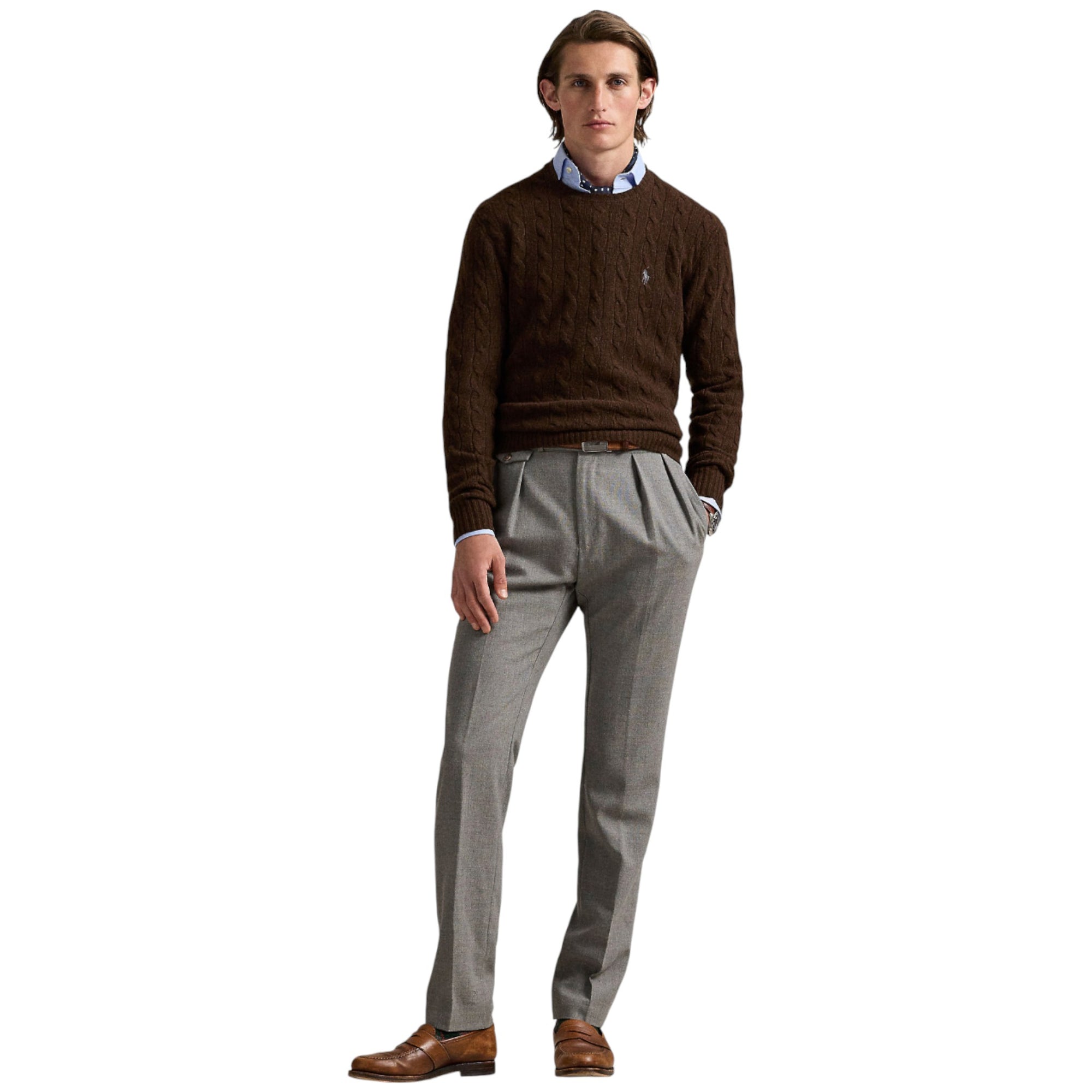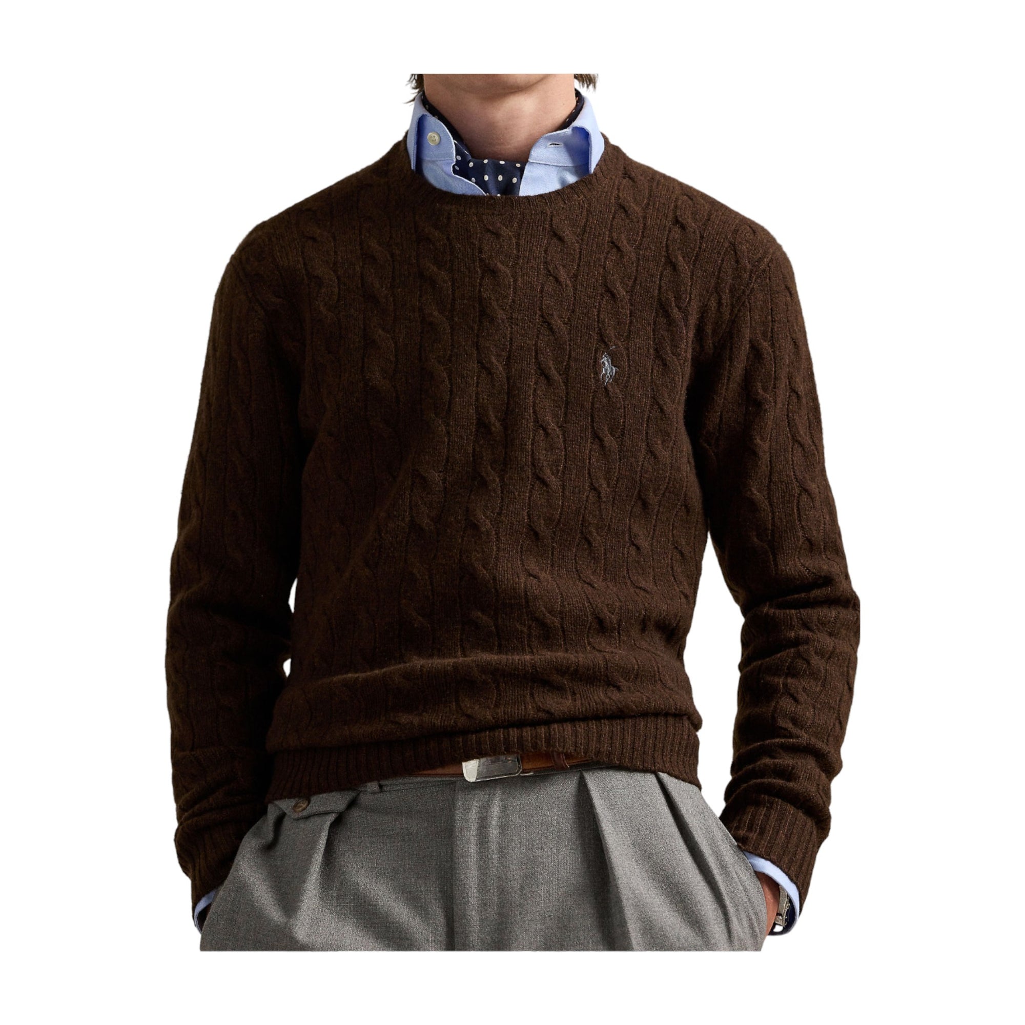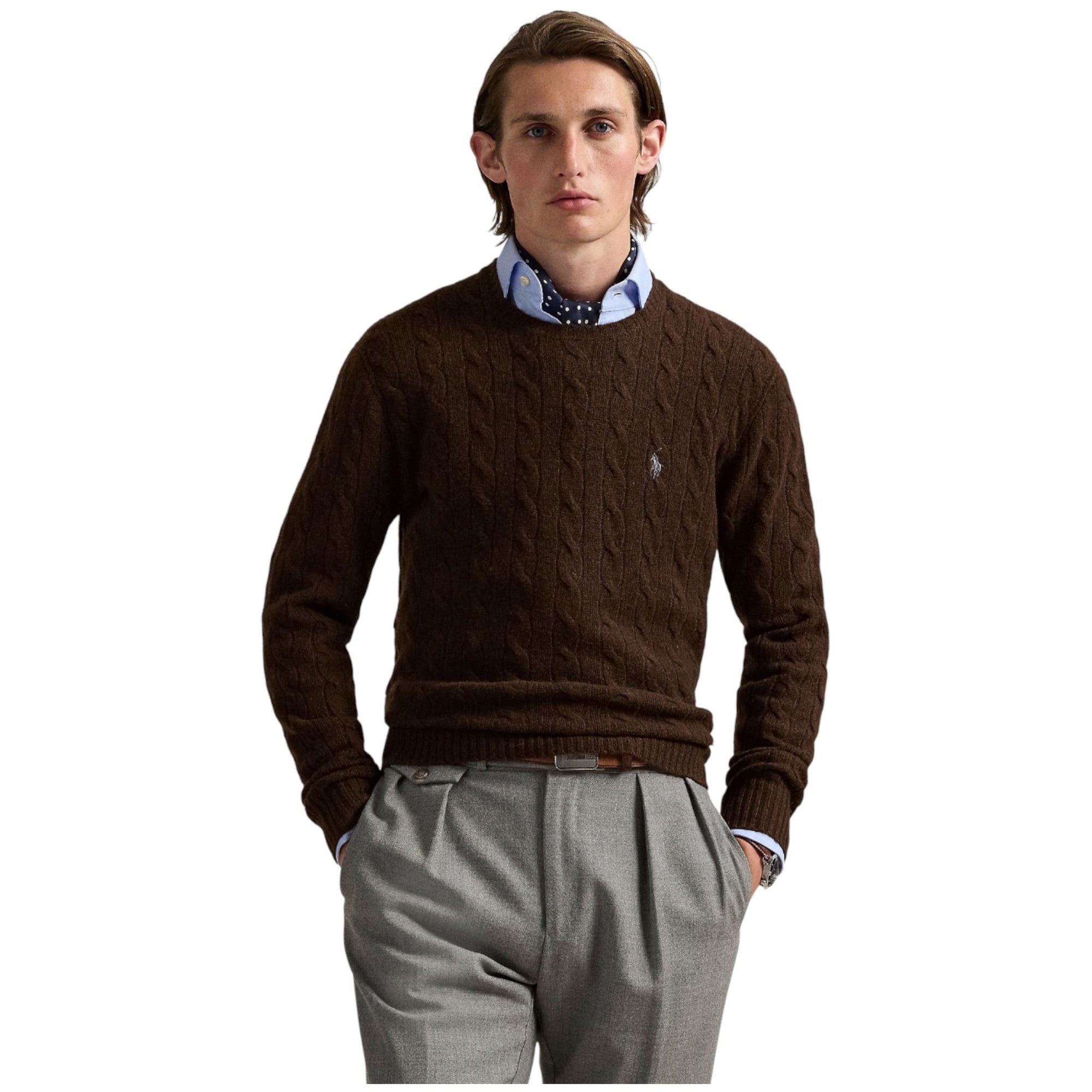 Denne mørkebrune kabelstrikkede sweater fra Ralph Lauren er en opdateret version af brandets ikoniske design – nu strikket i en blød og eksklusiv blanding af italiensk uld og cashmere. En elegant og varm trøje, der løfter enhver garderobe med sit klassiske udtryk og luksuriøse komfort.Materiale og kvalitet