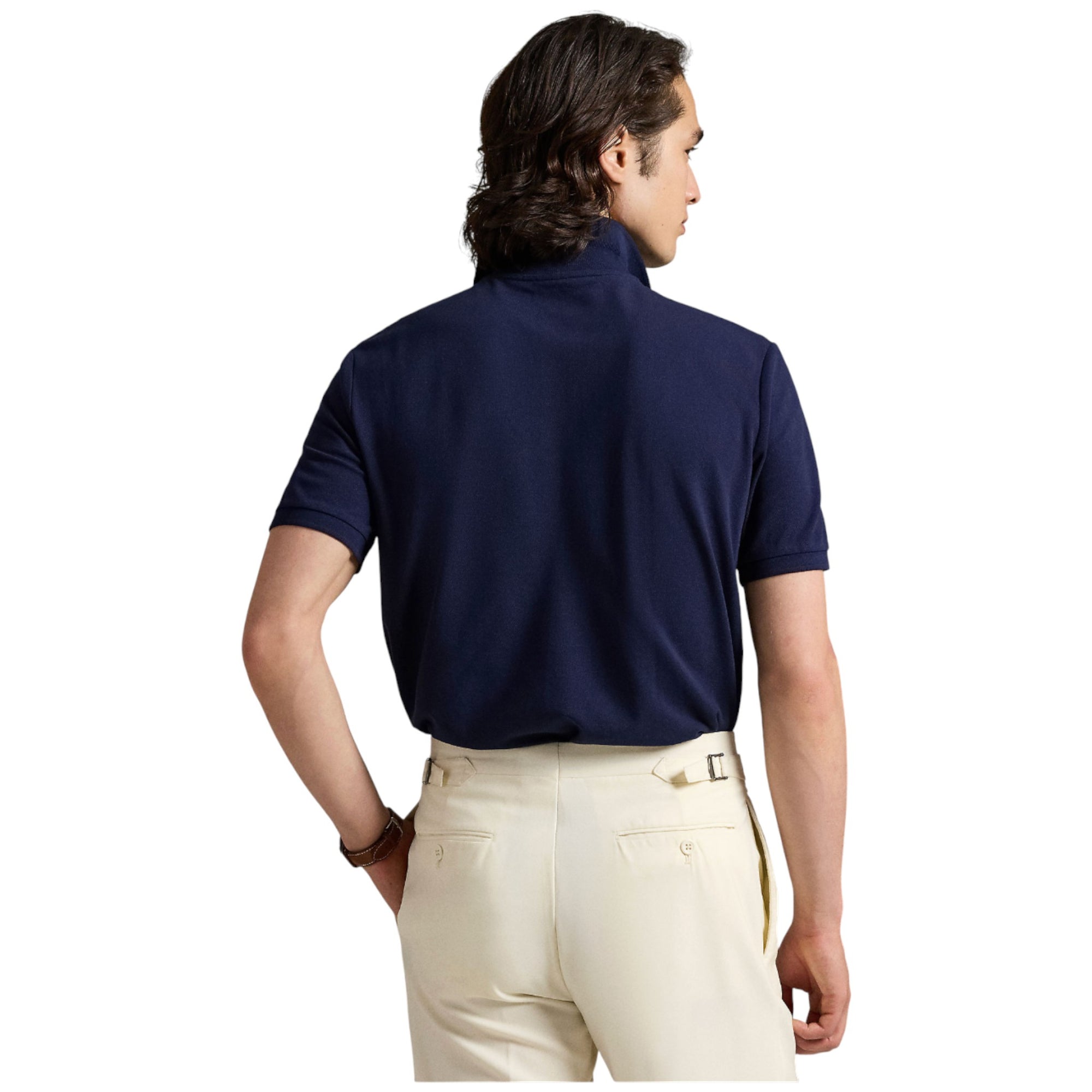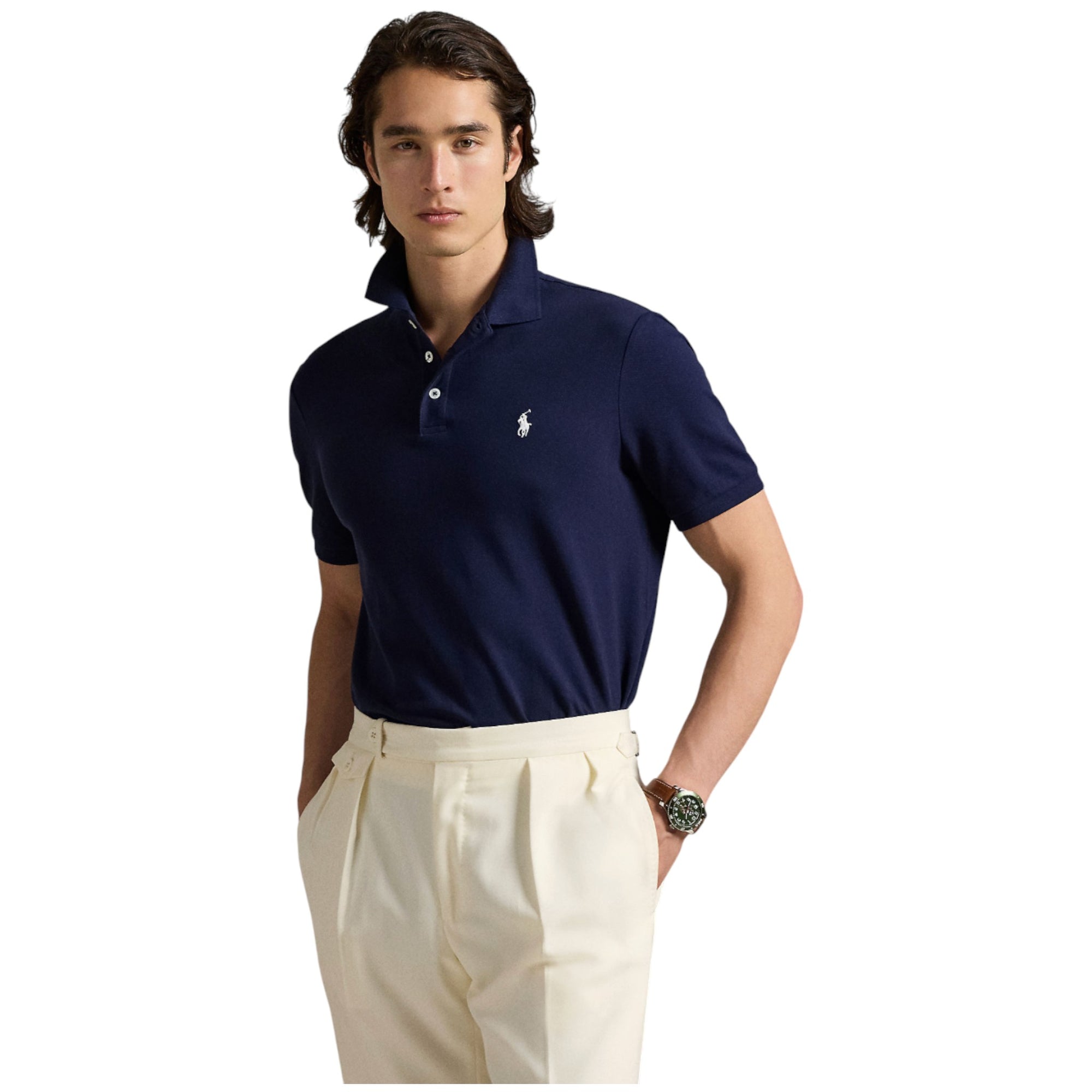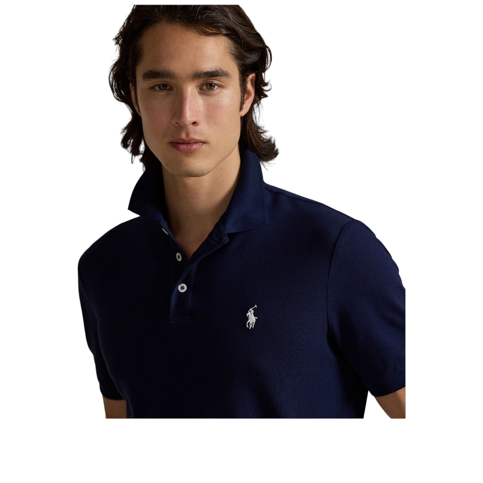 Designet kombinerer et skarpt, moderne snit med Ralph Laurens velkendte håndværk. Den elegante navy-blå farve gør poloen alsidig til både hverdag og mere polerede looks. Detaljen med ægte perlemorsknapper ved stolpelukningen understreger den eksklusive kvalitet, du kun finder hos Ralph Lauren.