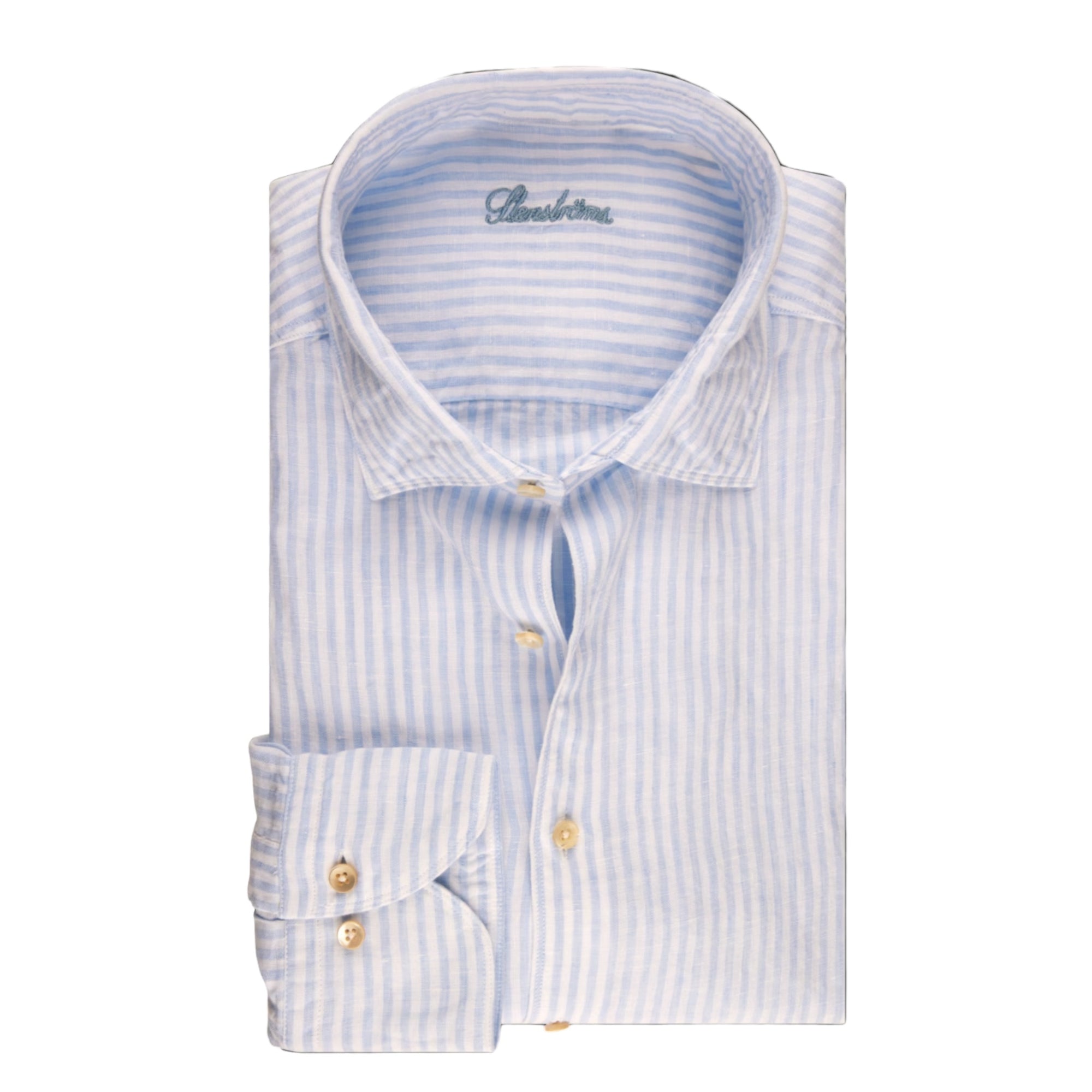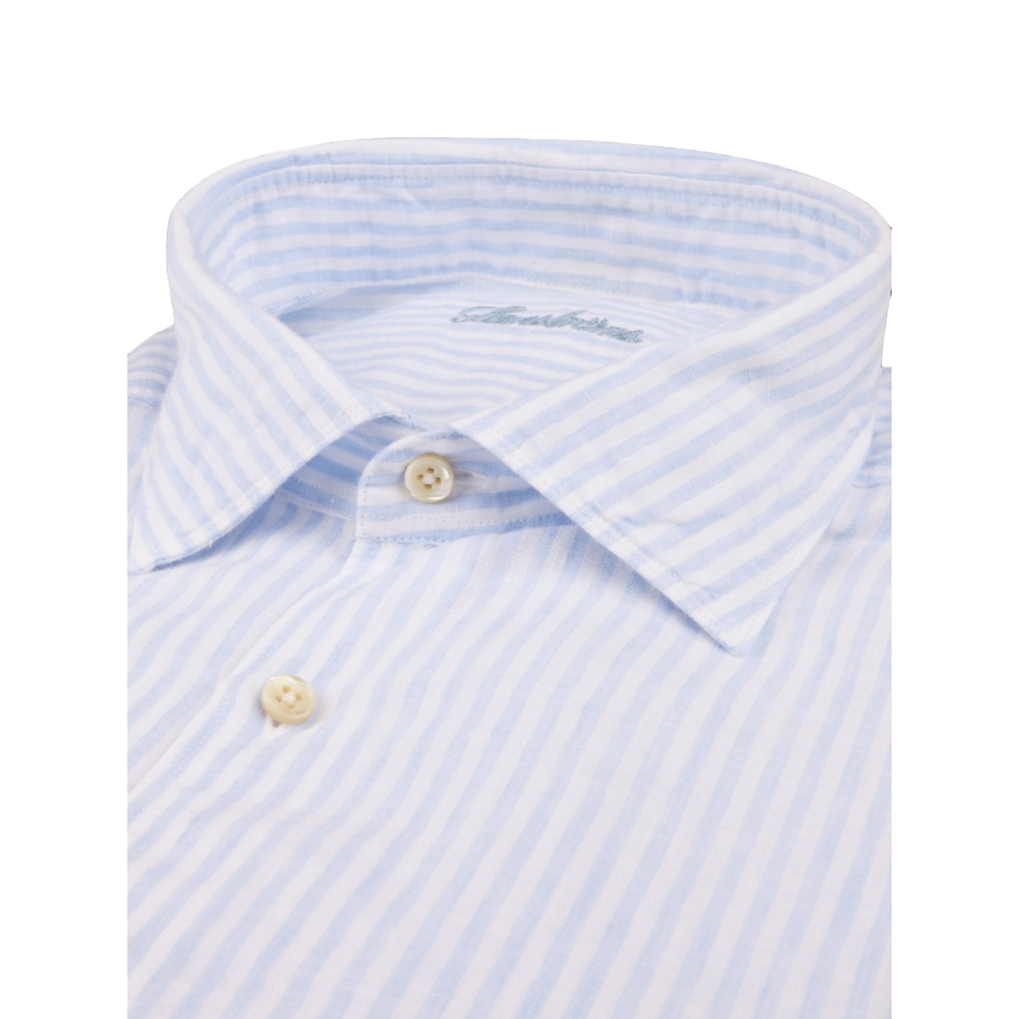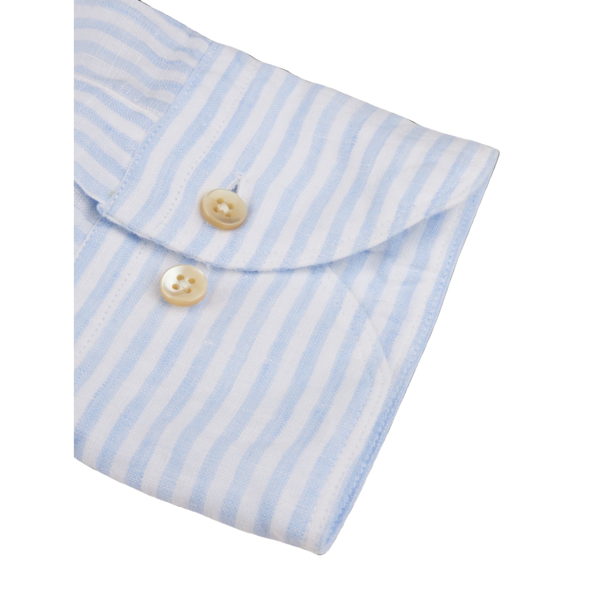 This striped shirt is made of linen and is detailed with mother of pearl buttons, single cuffs and a cut away collar.