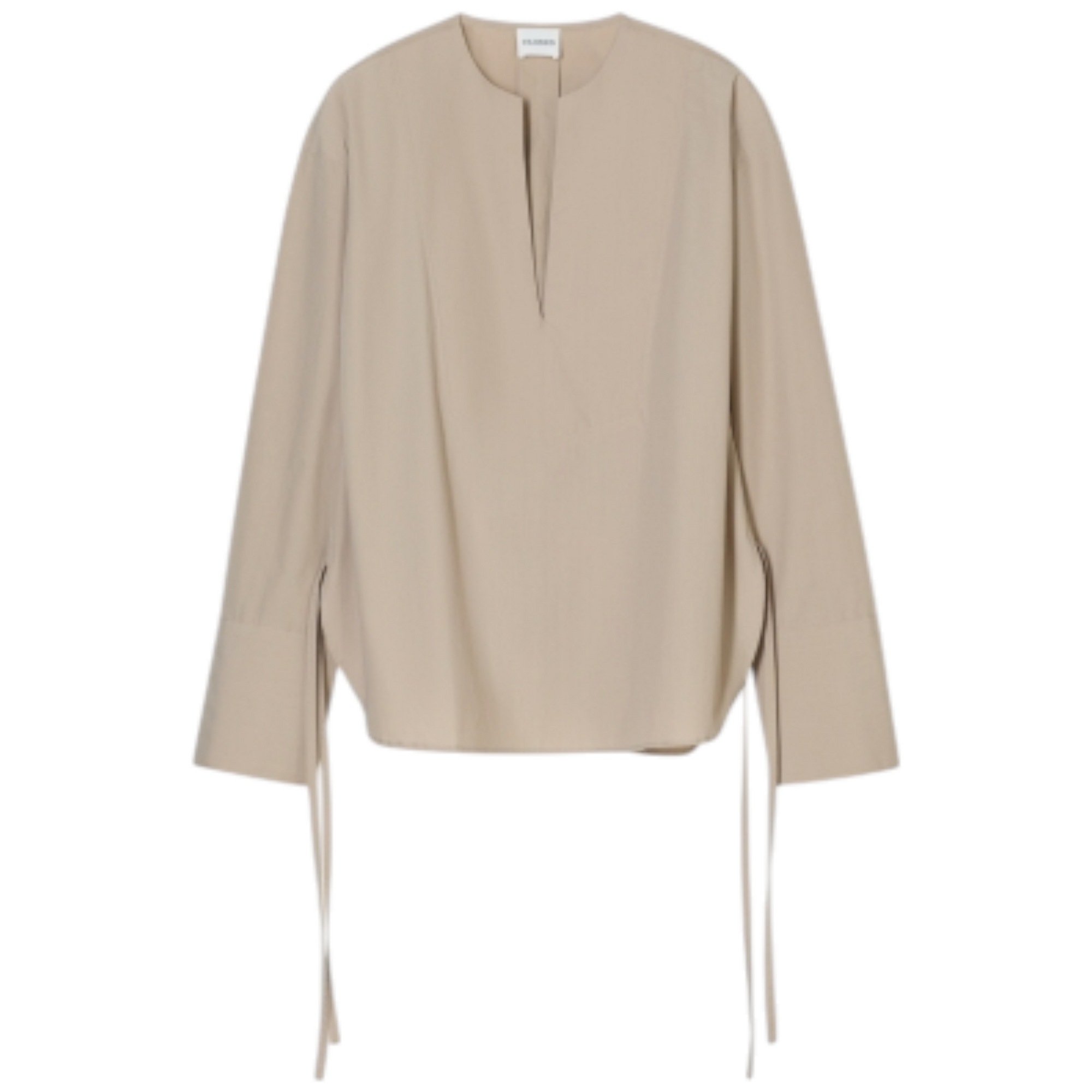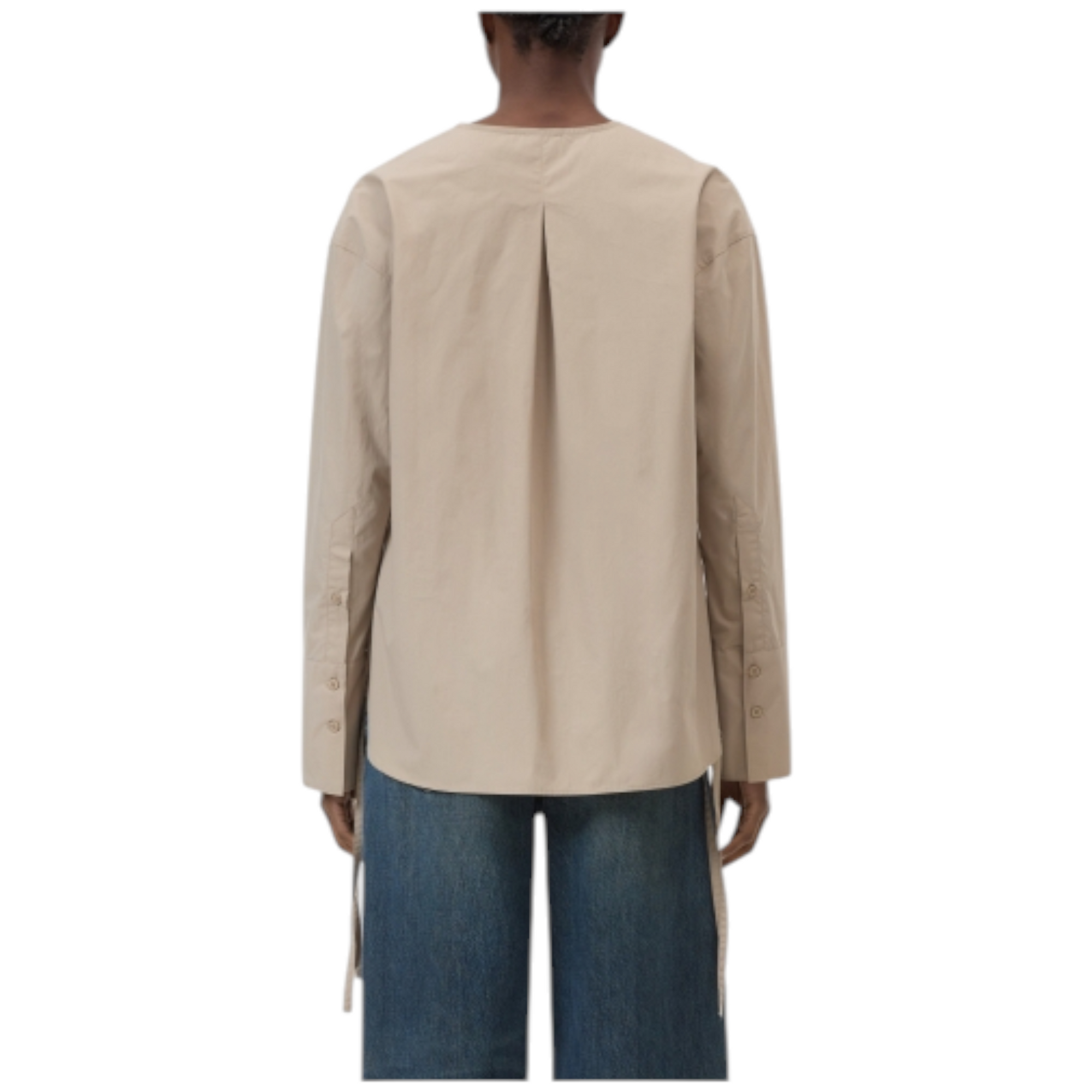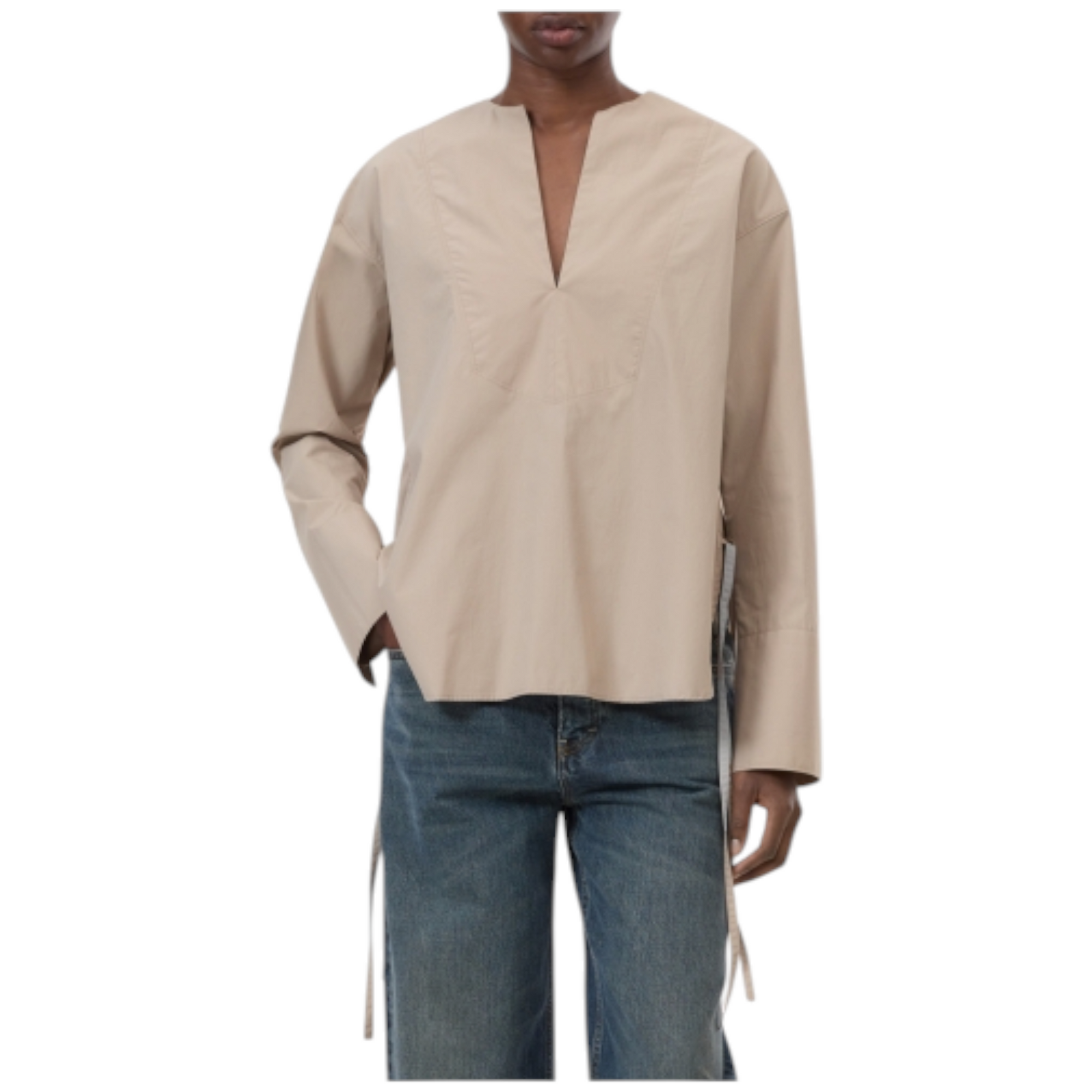 En elegant skjorte med afslappet silhuet, kraveløst design og et rent frontpanel. Fremstillet i kompakt poplin af 100% økologisk bomuld med en let, papiragtig struktur. Detaljer som sidesnører, buet søm, høje manchetter og læg bagpå fuldender det raffinerede udtryk. Fremstillet i Portugal.