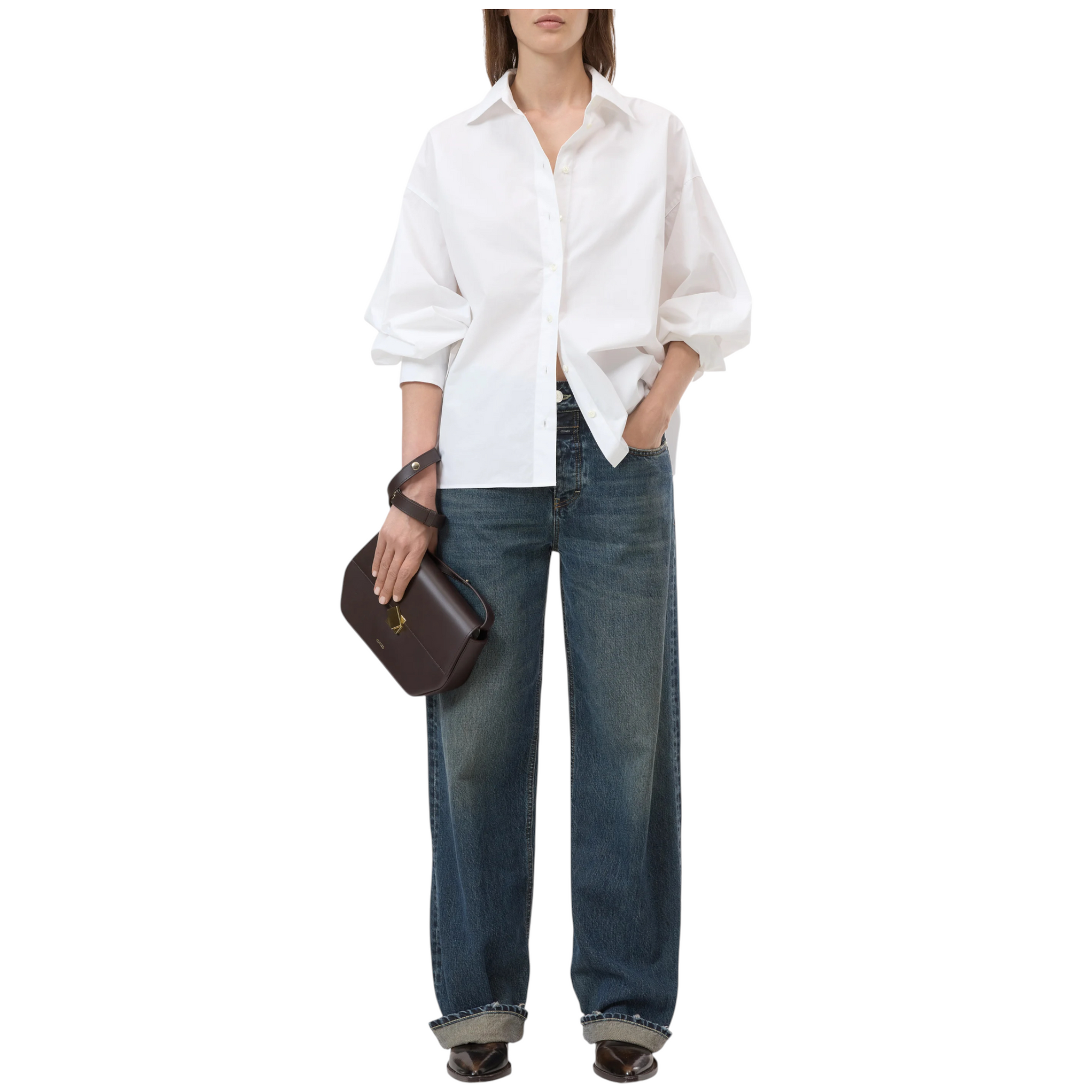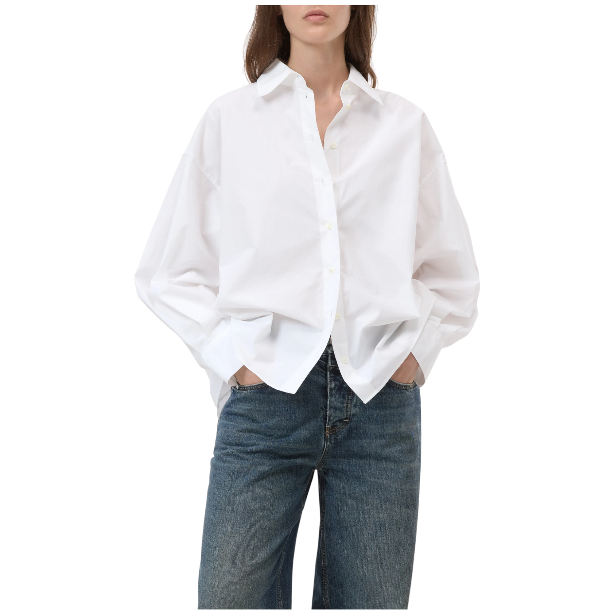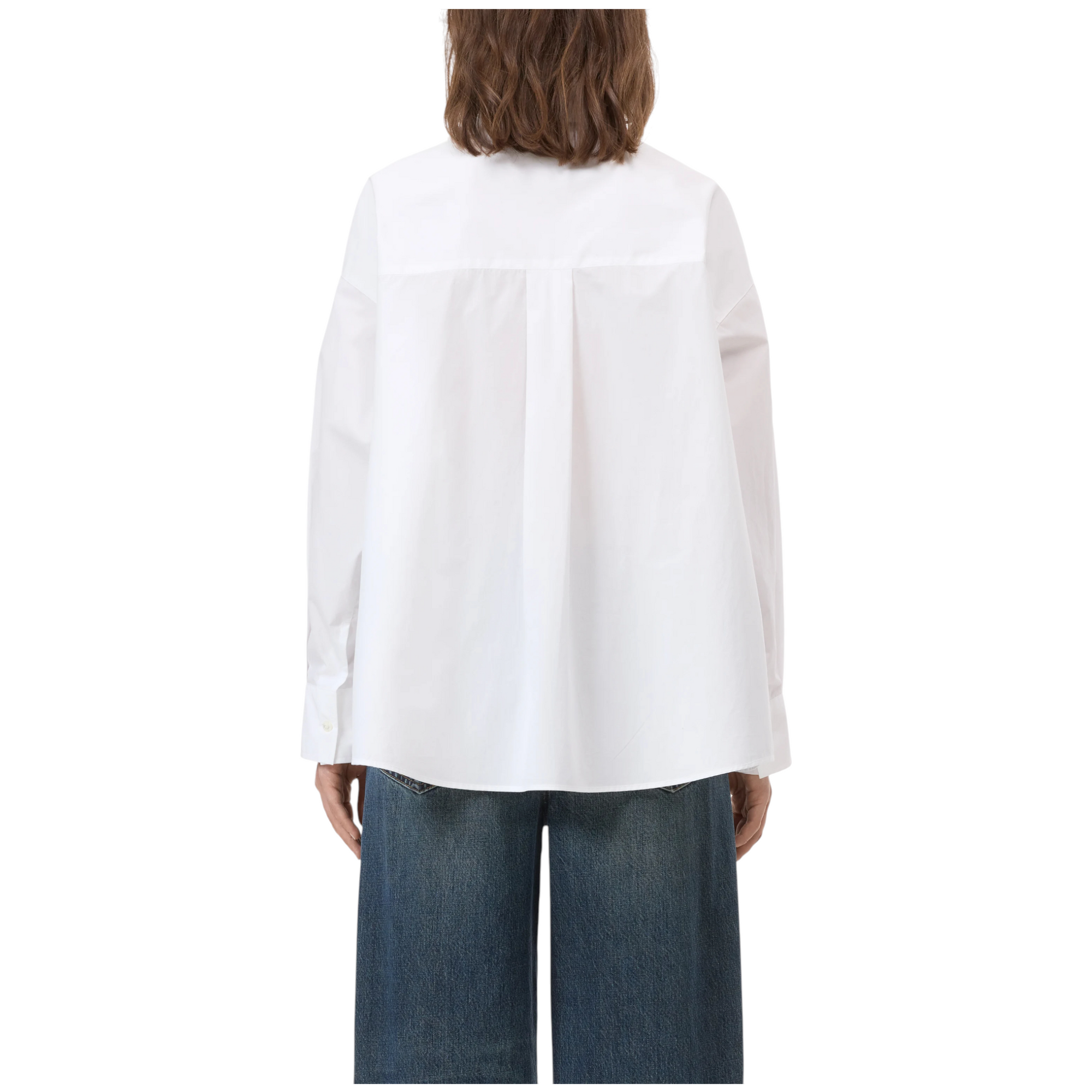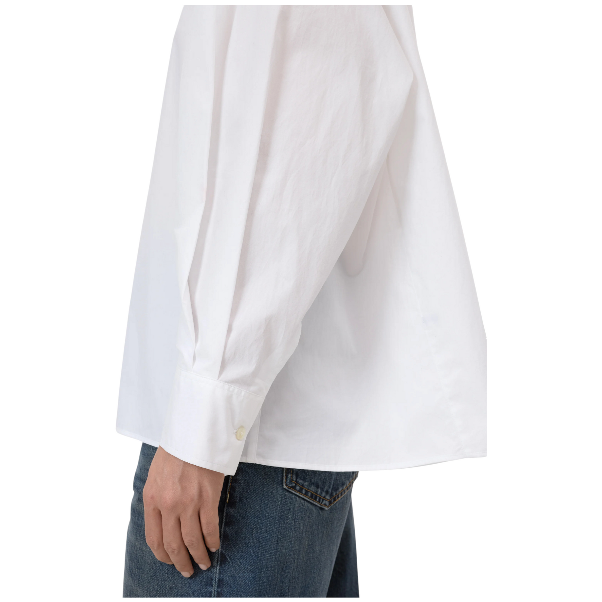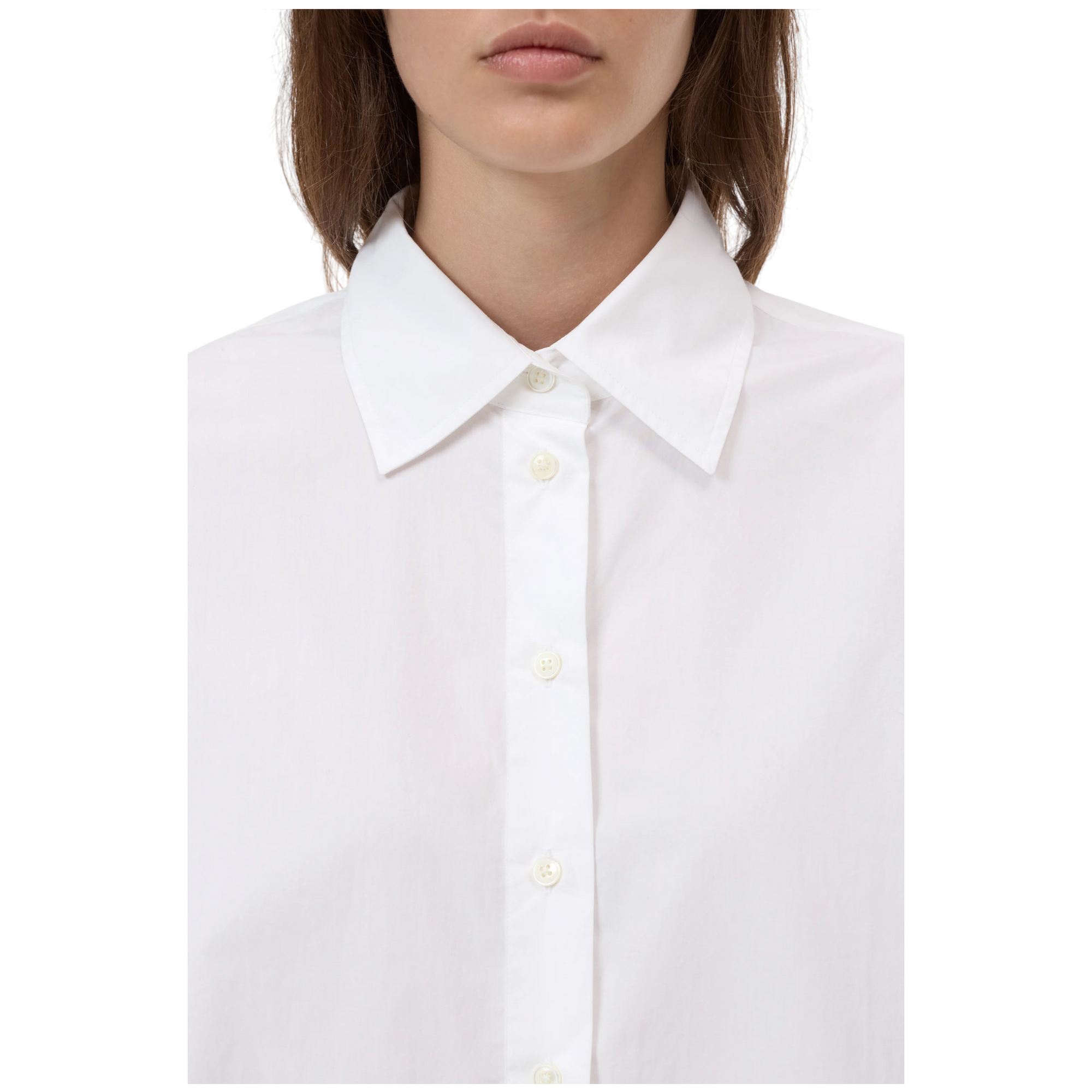 En afslappet og moderne skjorte med kapelignende silhuet, fremstillet i en kompakt økologisk bomuldspoplin med let papiragtig struktur. Skjorten har spids krave, dropped shoulders og smukke perlemorsknapper. En bred læg bagpå giver volumen og et elegant fald.-