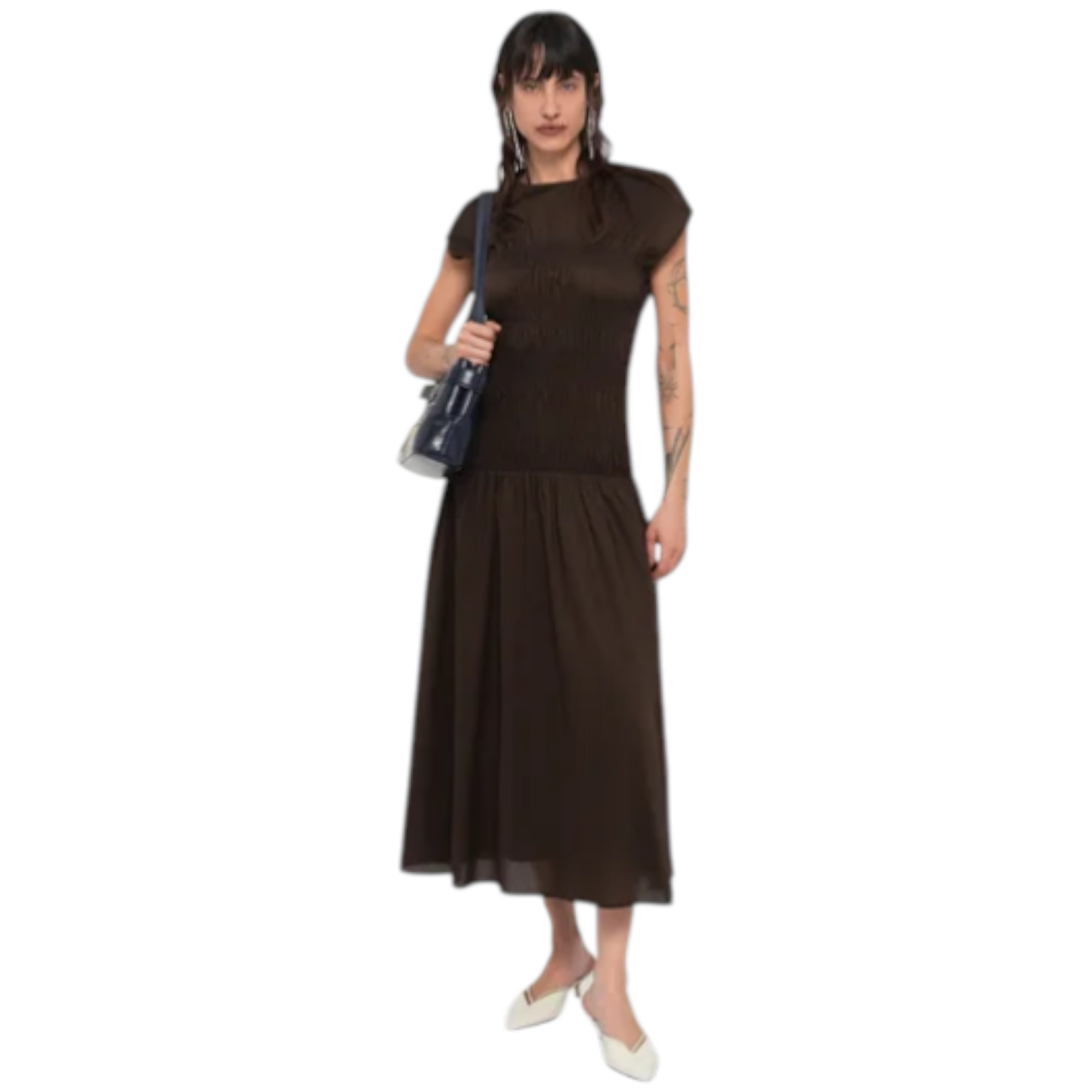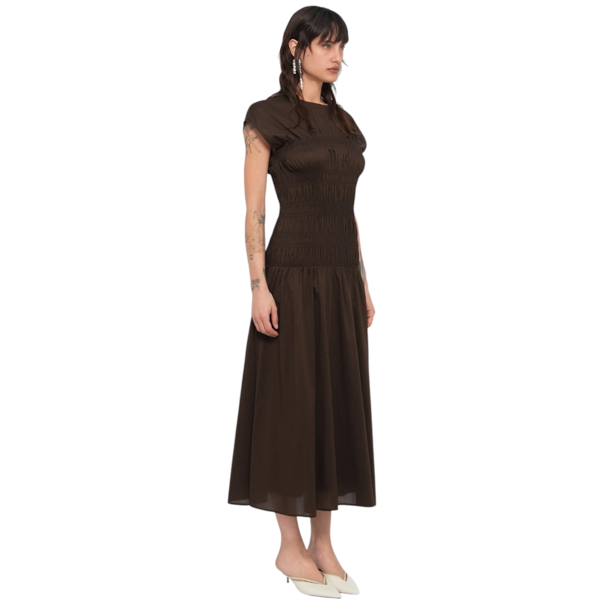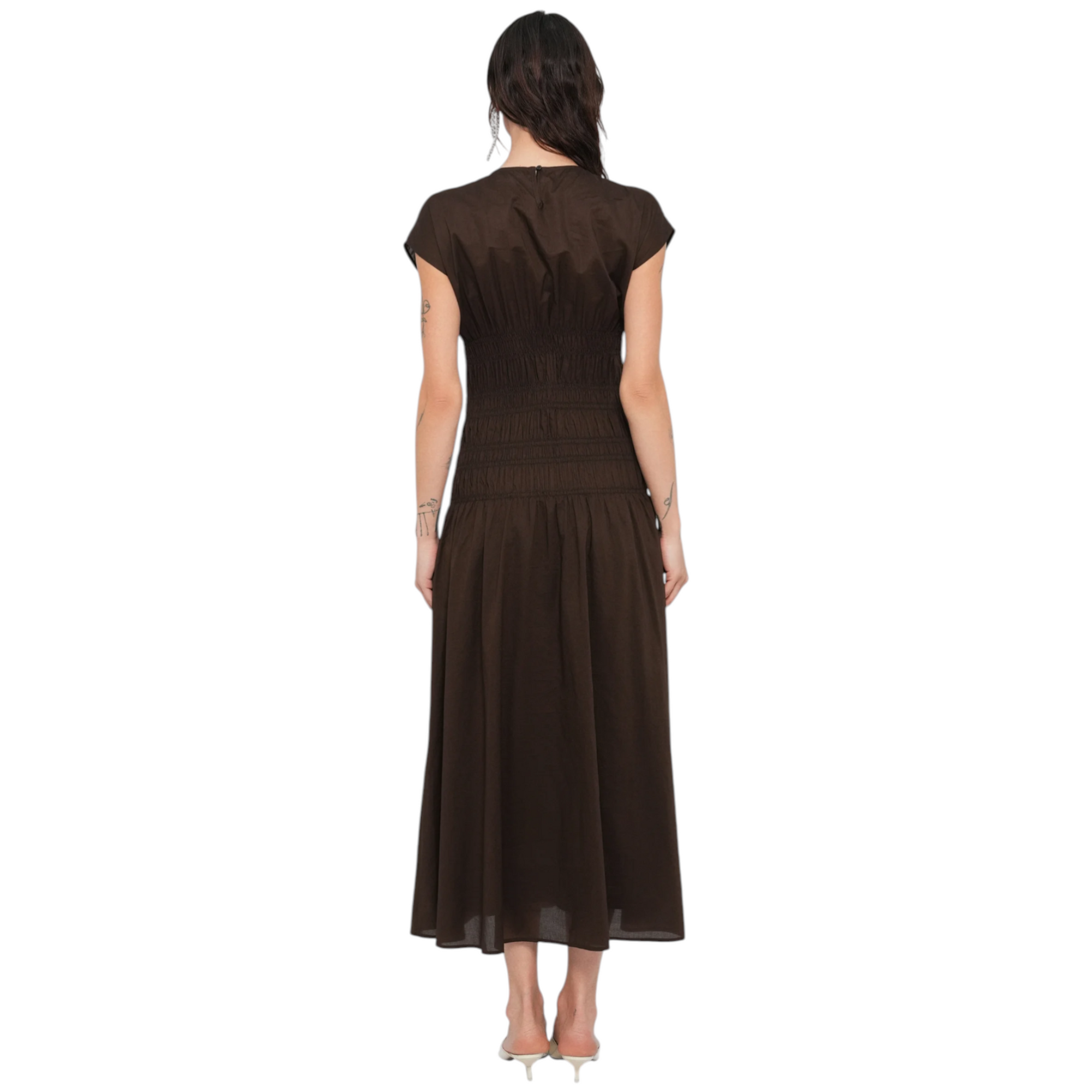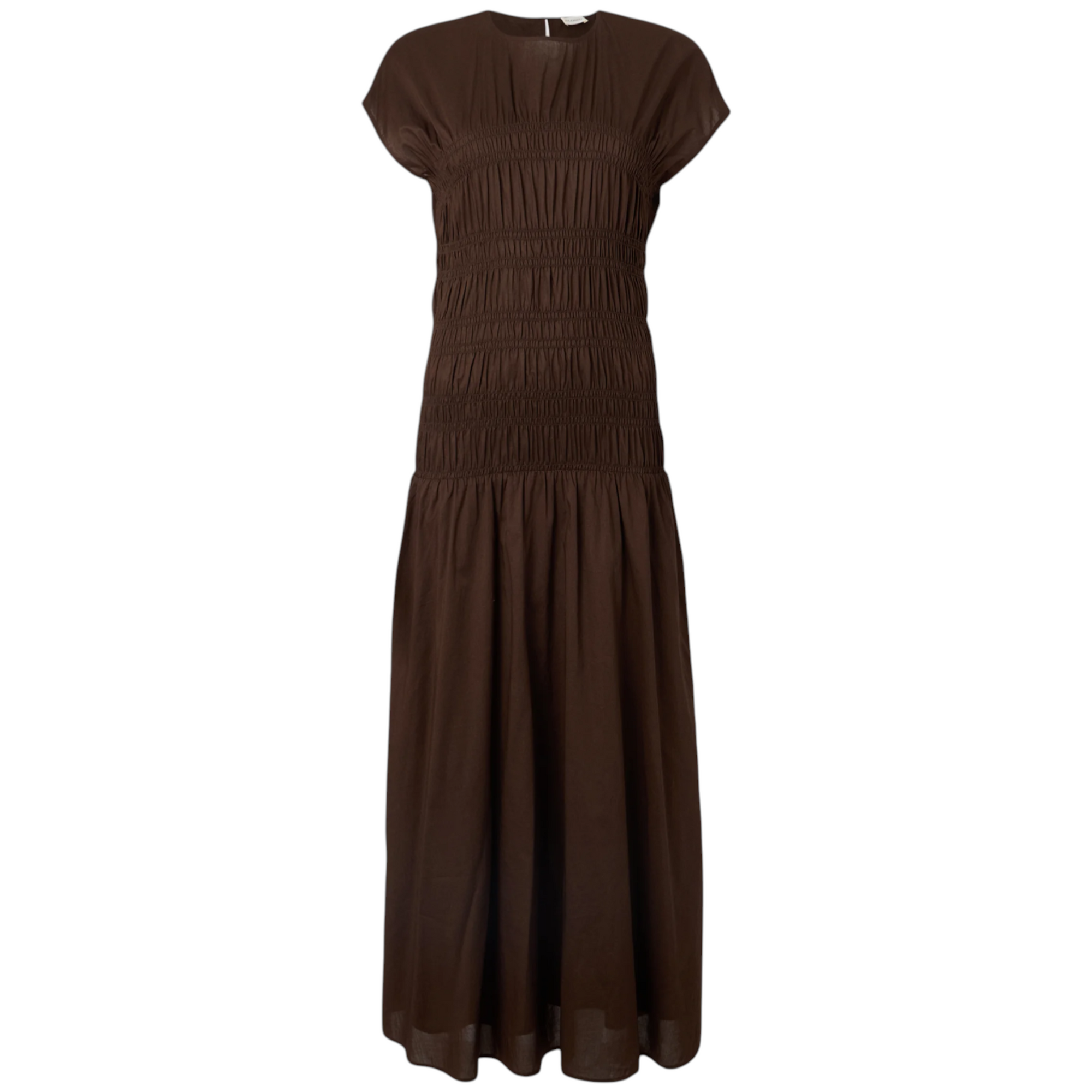 Feminim og cool Smocket maxikjole i 100% bomuld i farven maple brown. Designet med rund hals, knaplukning og inderslip. Kjolen har regular fit med figursyet silhuet og læg-/smockdetaljer, der giver et elegant fald. Calf-længde. Normal i størrelsen.