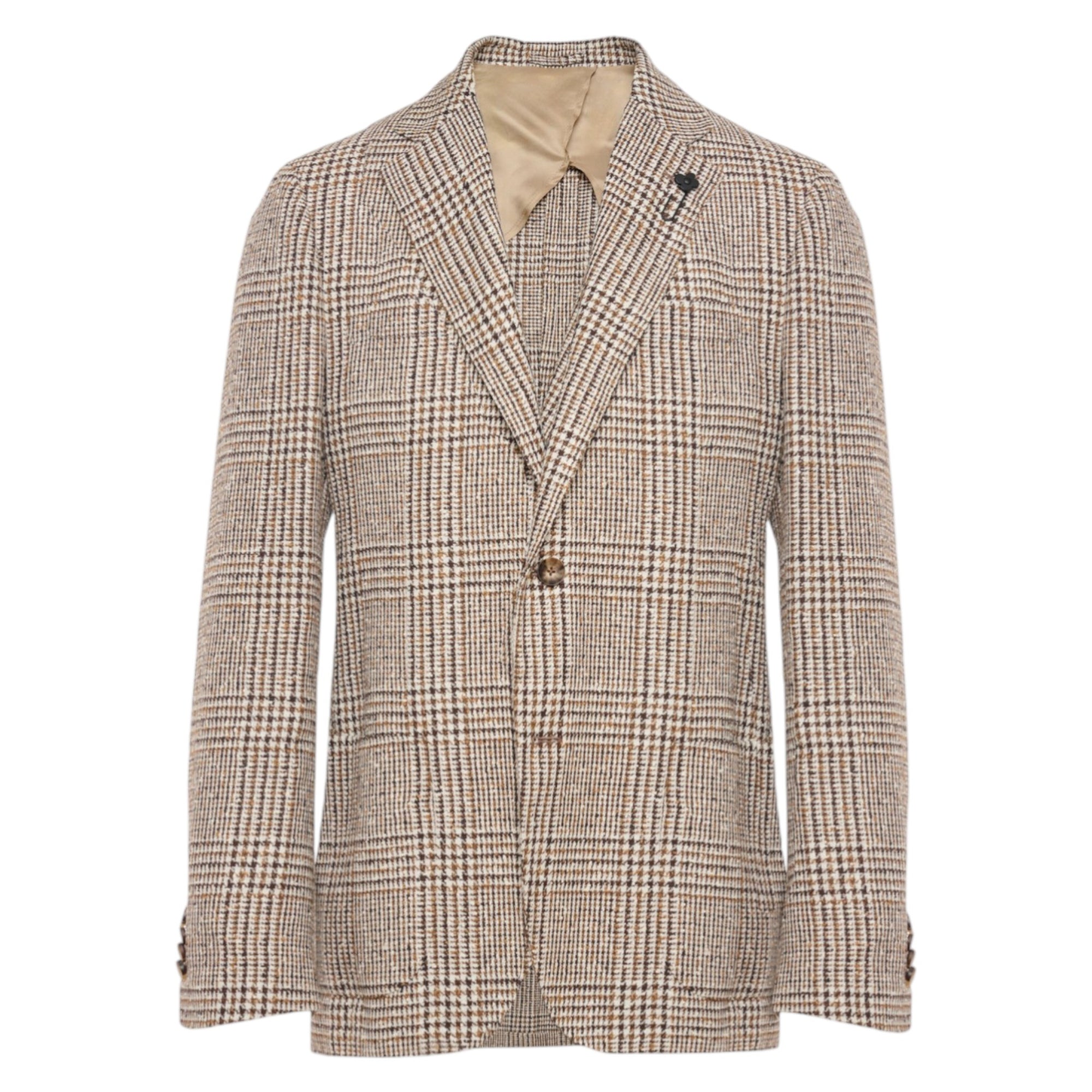 Denne elegante blazer fra Lardini forener klassisk italiensk skrædderkunst med lette sommermaterialer. Det beige ternede design giver et sofistikeret og tidløst udtryk, perfekt til både business casual og sommerens formelle begivenheder.