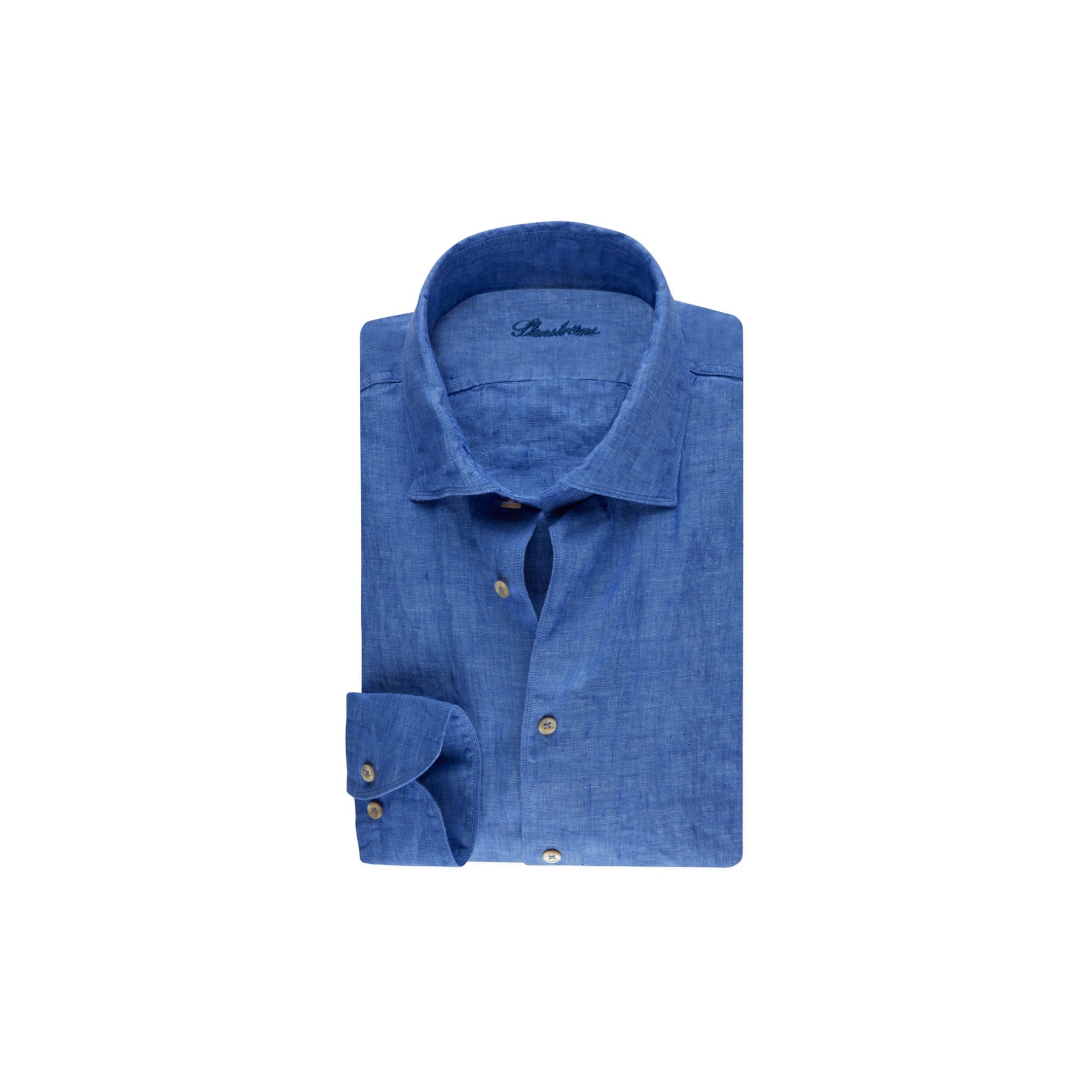 Shirt made from linen and cut in a fitted body model. The shirt is detailed white mother of pearl buttons, single cuffs and a cut away collar.