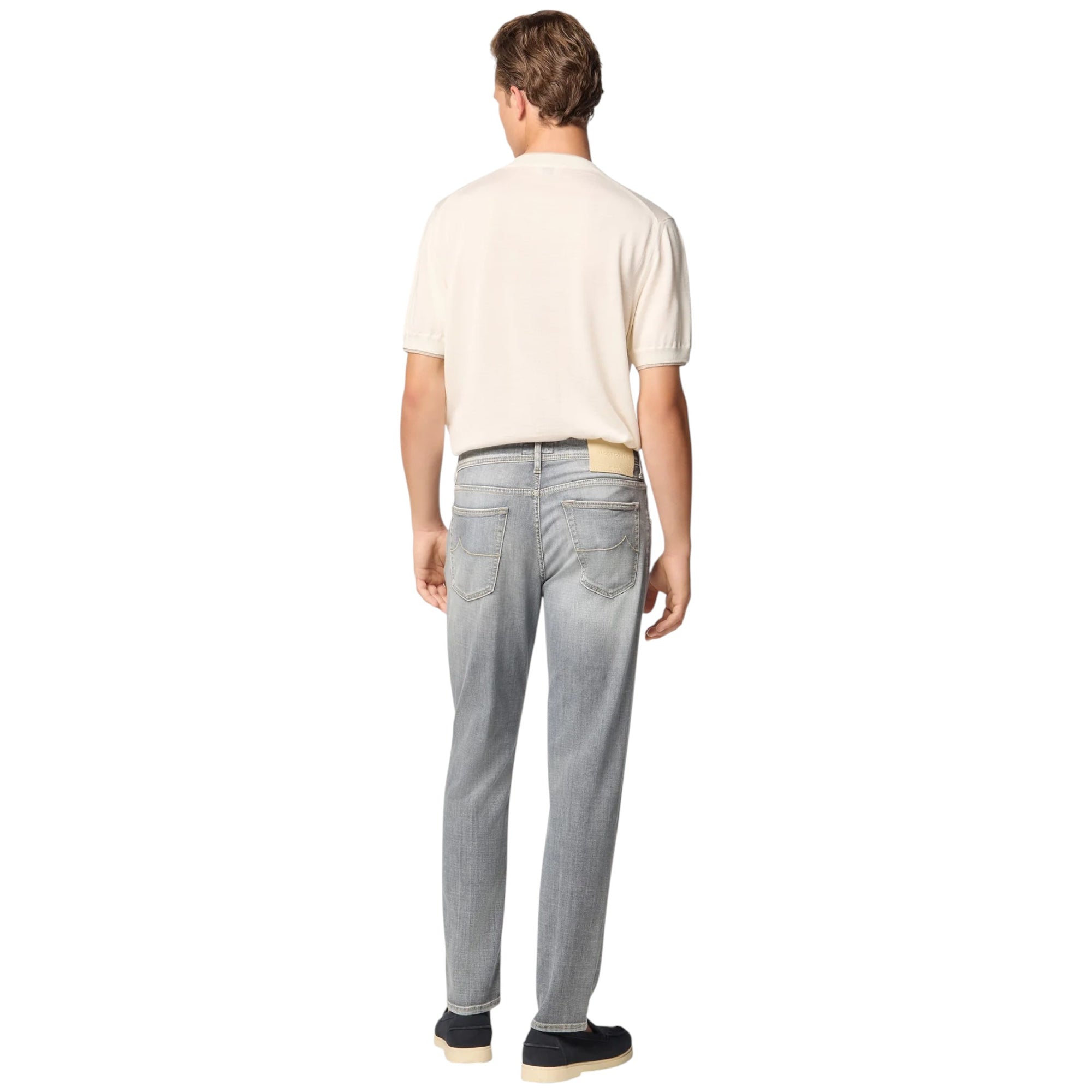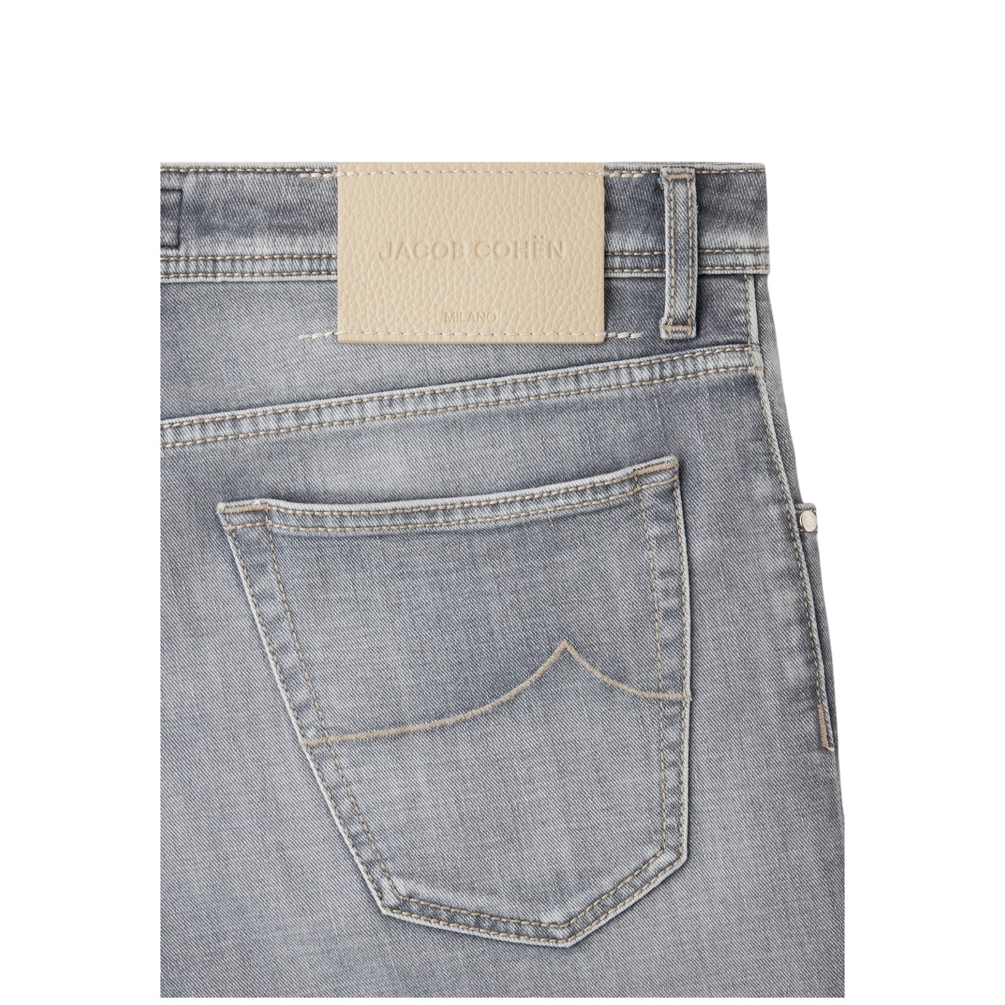 Bagsiden prydes af et lys beige hjorteskinds-patch med hot-stamped logo, mens knappen har et unikt design med koncentriske motiver og et elegant nikkel-tone print. Indvendigt er jeansene broderet med både stilnavn og et citat fra brandets grundlægger, og modellen leveres med bandana i bomuld samt sytråd—klassiske signaturtilbehør fra Jacob Cohën.