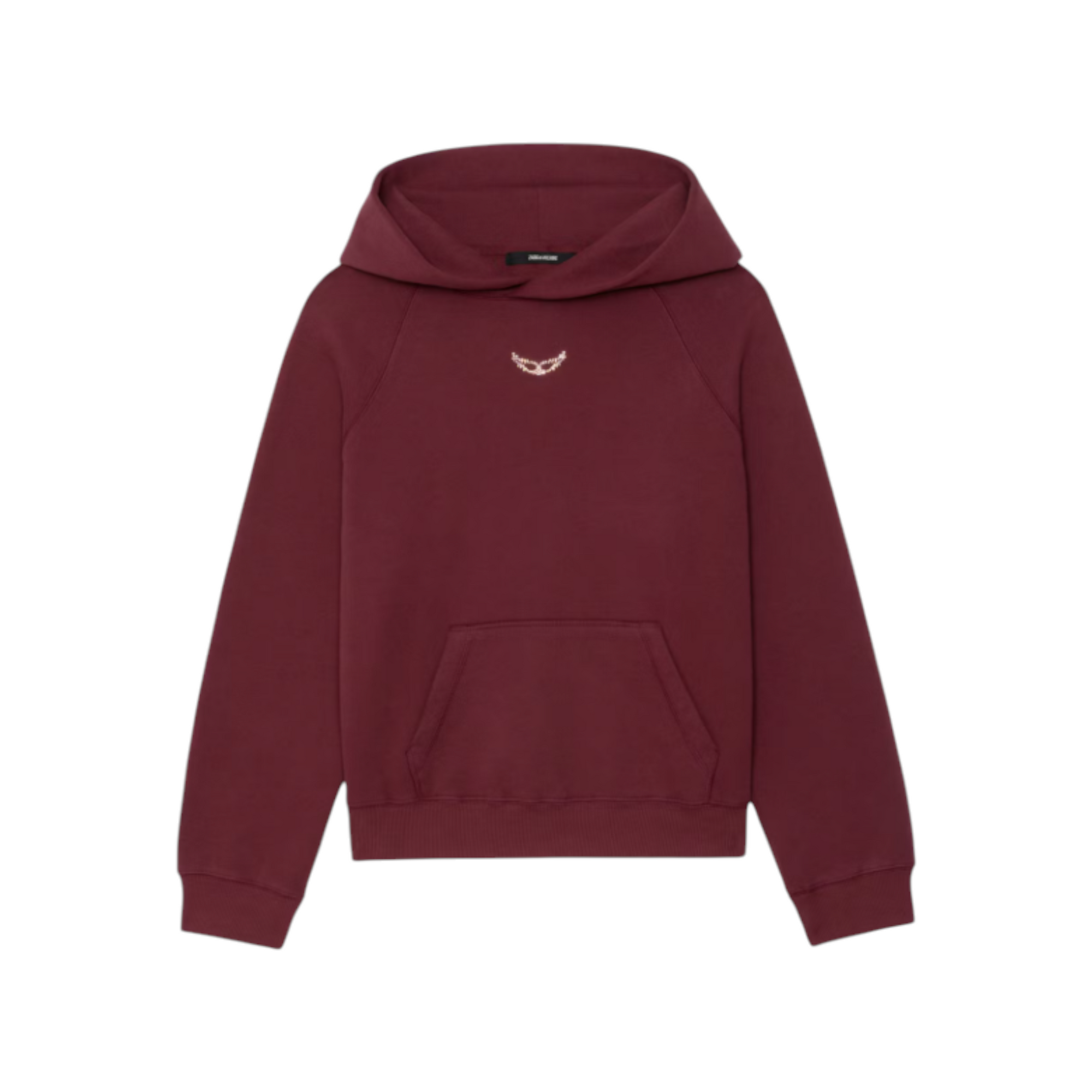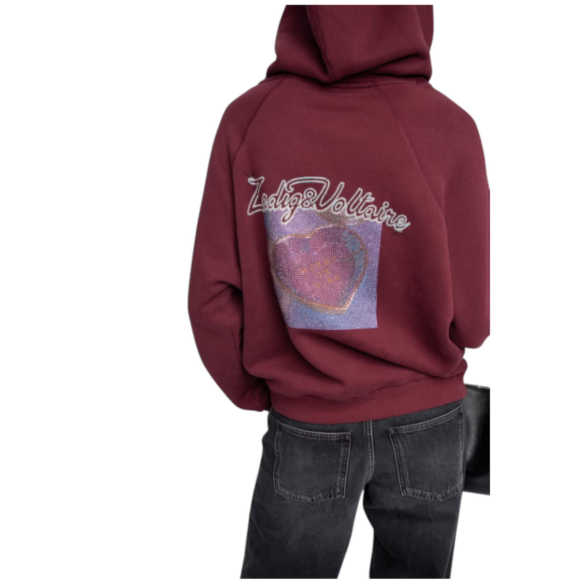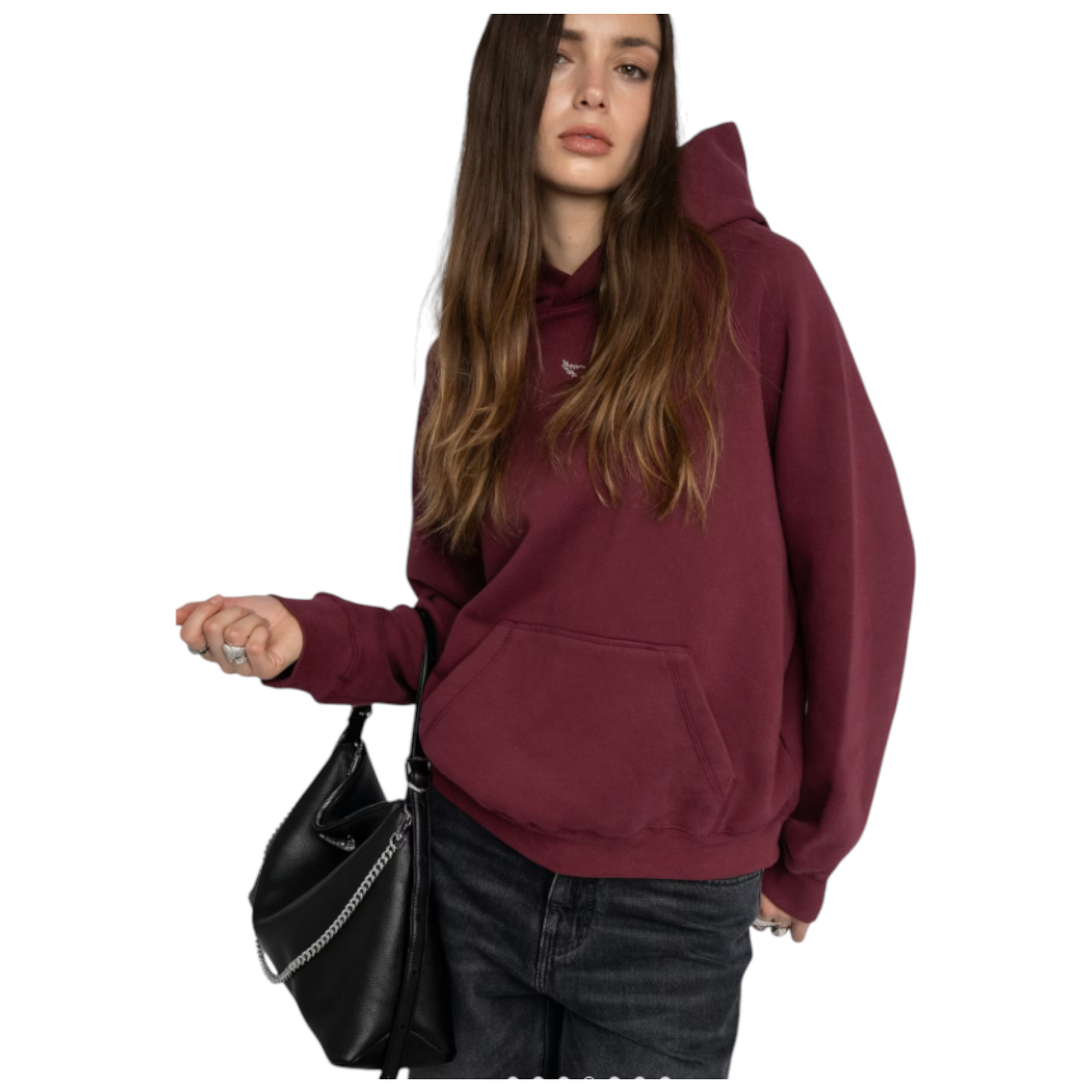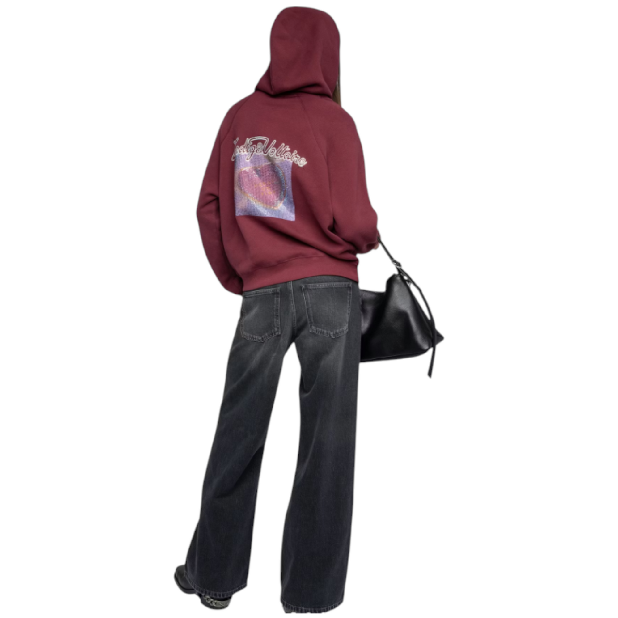 Georgy Sweatshirt i farven Burgundy er en cool hættetrøje i bomuld med print og rhinsten på ryggen. Den har hætte, rund hals, lange ærmer og en praktisk frontlomme. Pasformen er løs – ønsker du et mere tætsiddende look, kan du gå en størrelse ned.