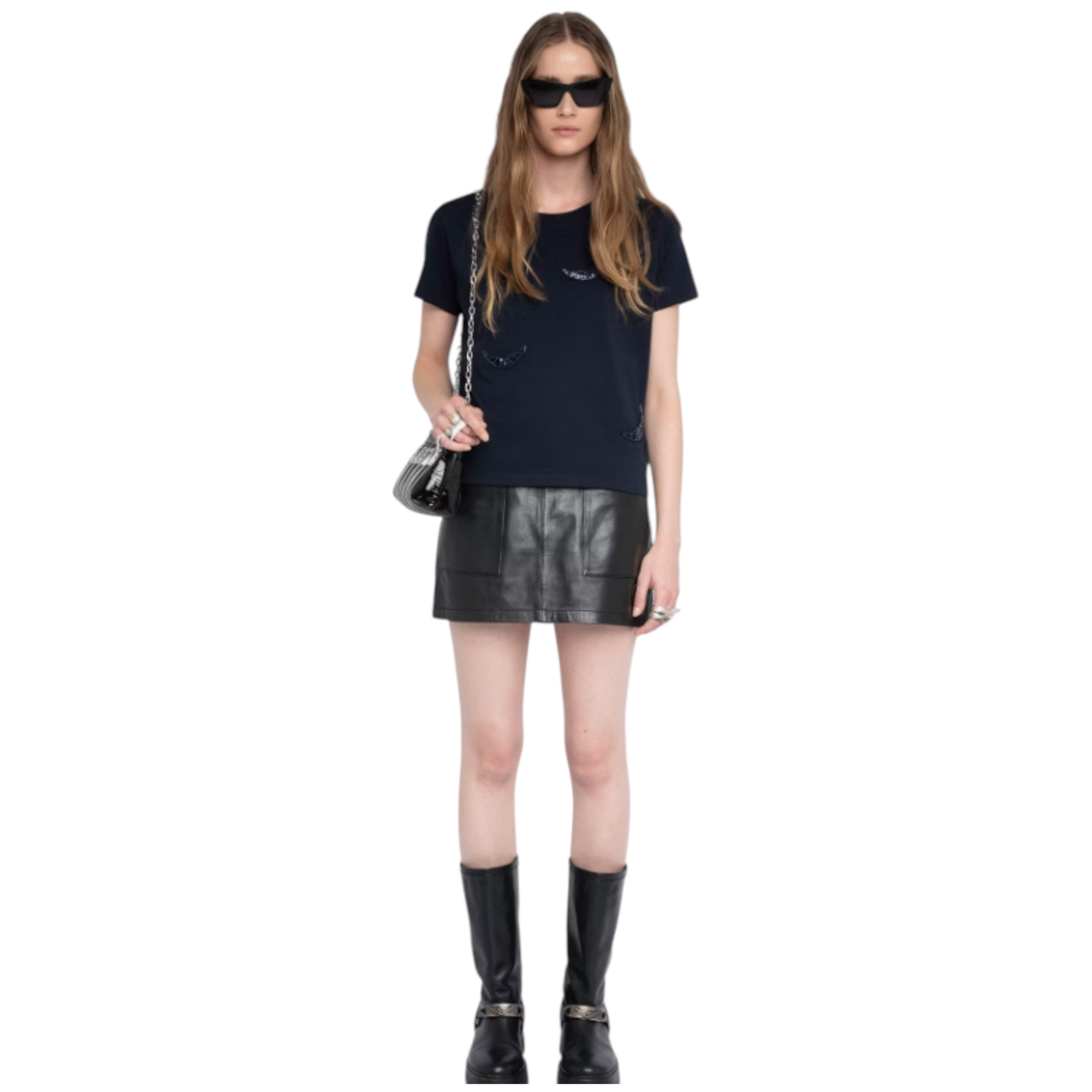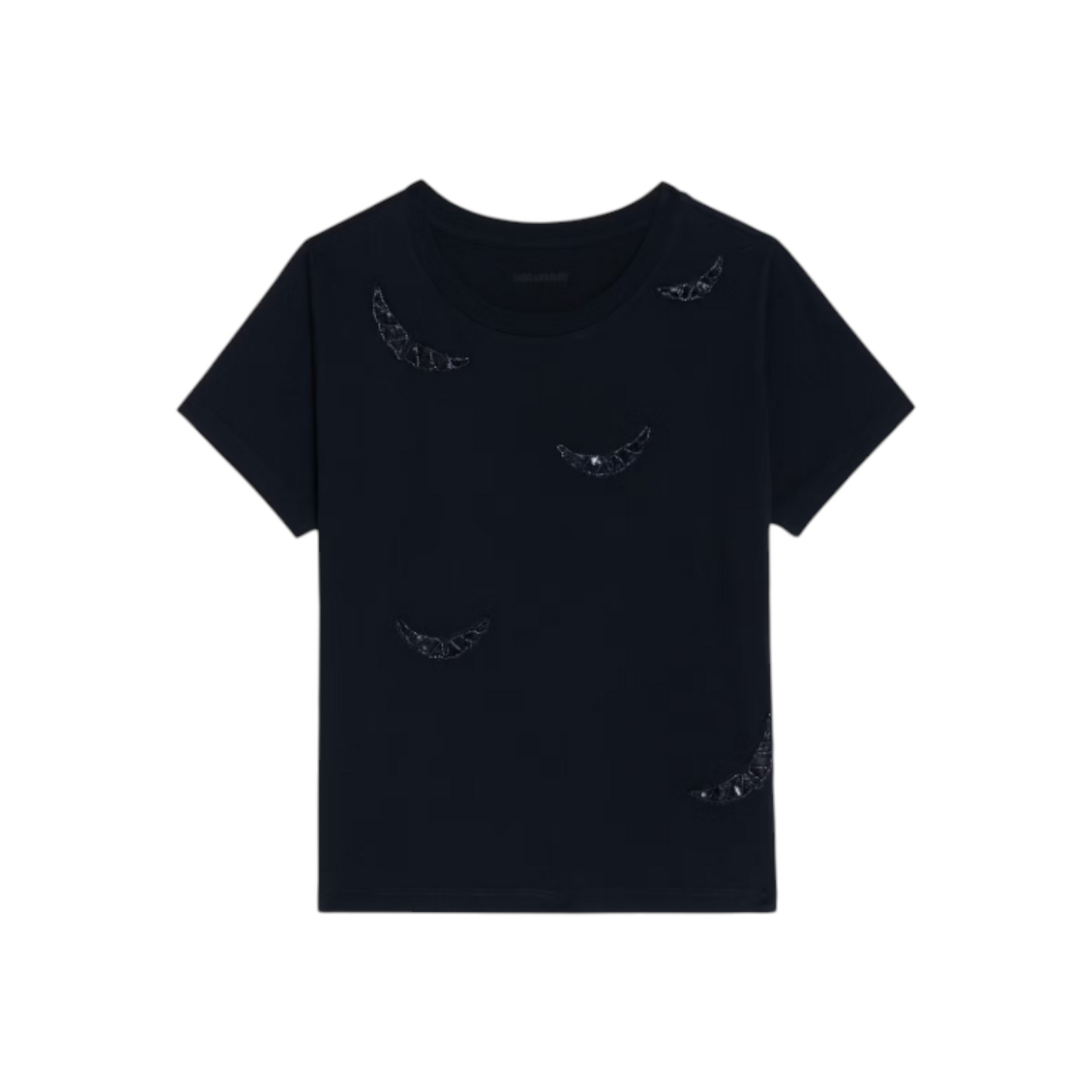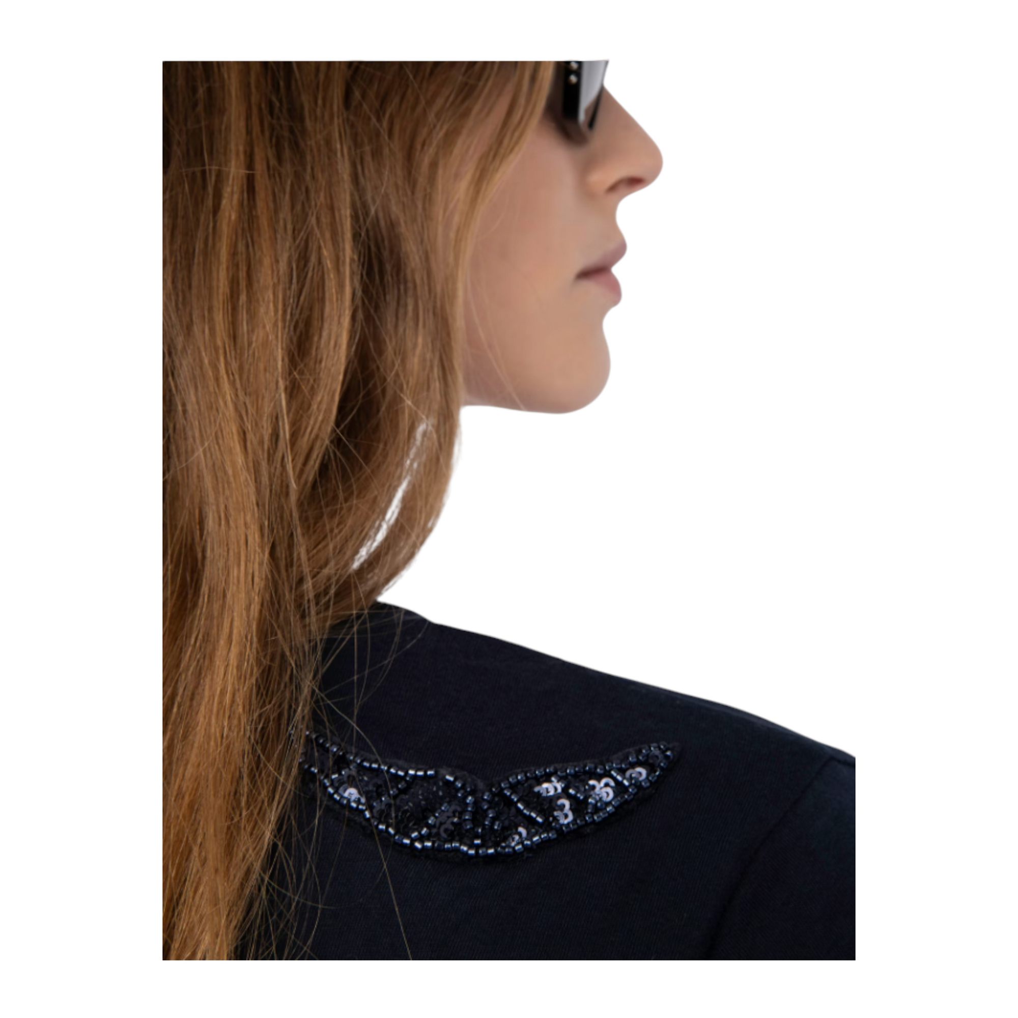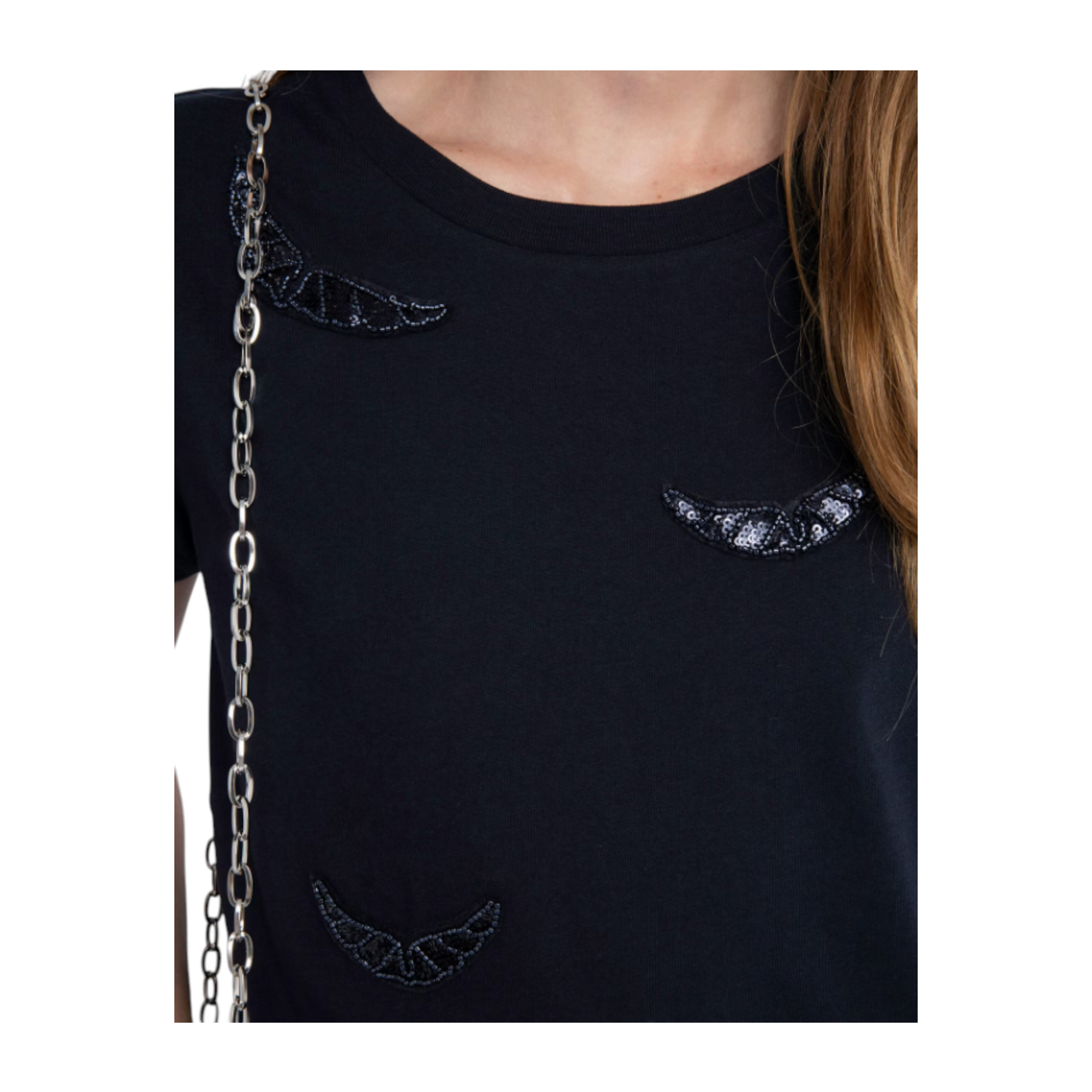Kortærmet T-shirt i 100% bomuld med rund hals og broderede signaturvinger. Klassisk pasform, men en smule lille i størrelsen – vælg eventuelt en størrelse større for et mere afslappet fit.