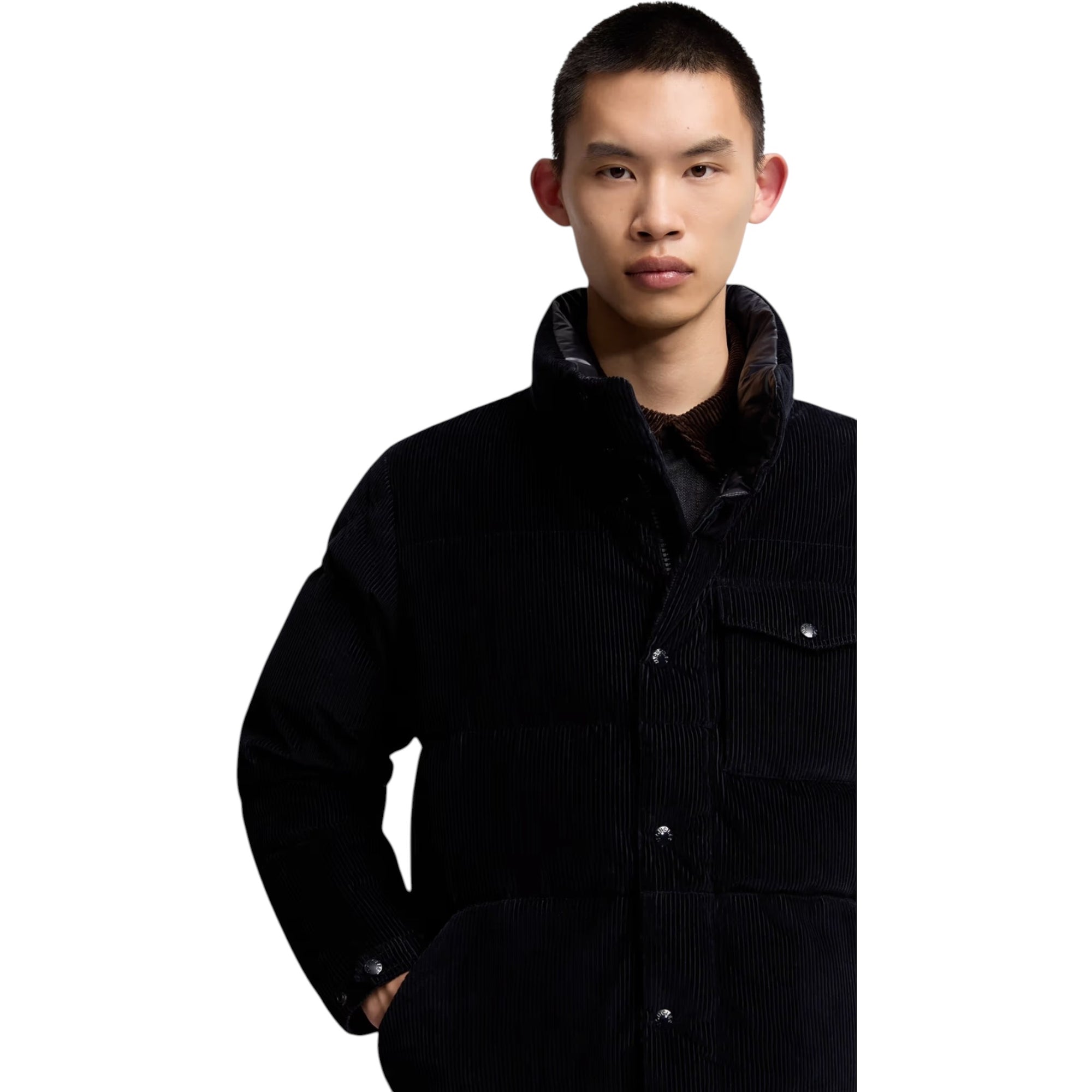 Serrant kort sort dunjakke i fløjl er til manden, der ønsker varme uden at gå på kompromis med stil. Den brede ribstruktur skaber et luksuriøst udtryk, mens den korte pasform gør jakken ideel til både hverdag og byliv. Et statement-piece, der kombinerer funktion og fashion på højeste niveau.