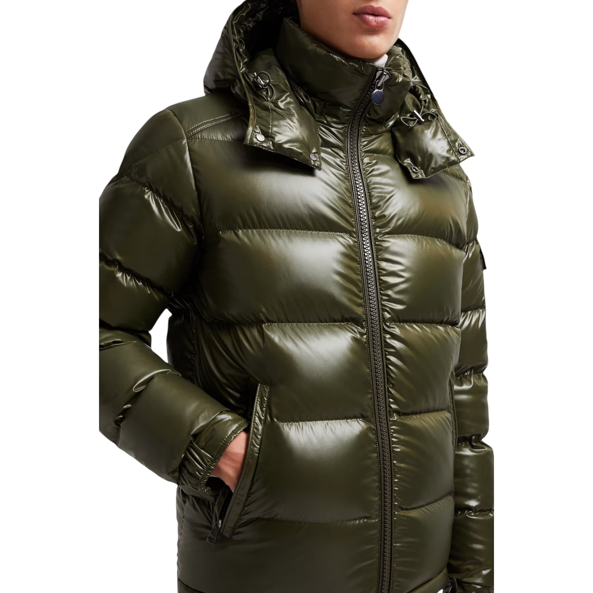En ikonisk dunjakke med moderne kant – Moncler Maya i grøn er et statement af stil, komfort og luksus.