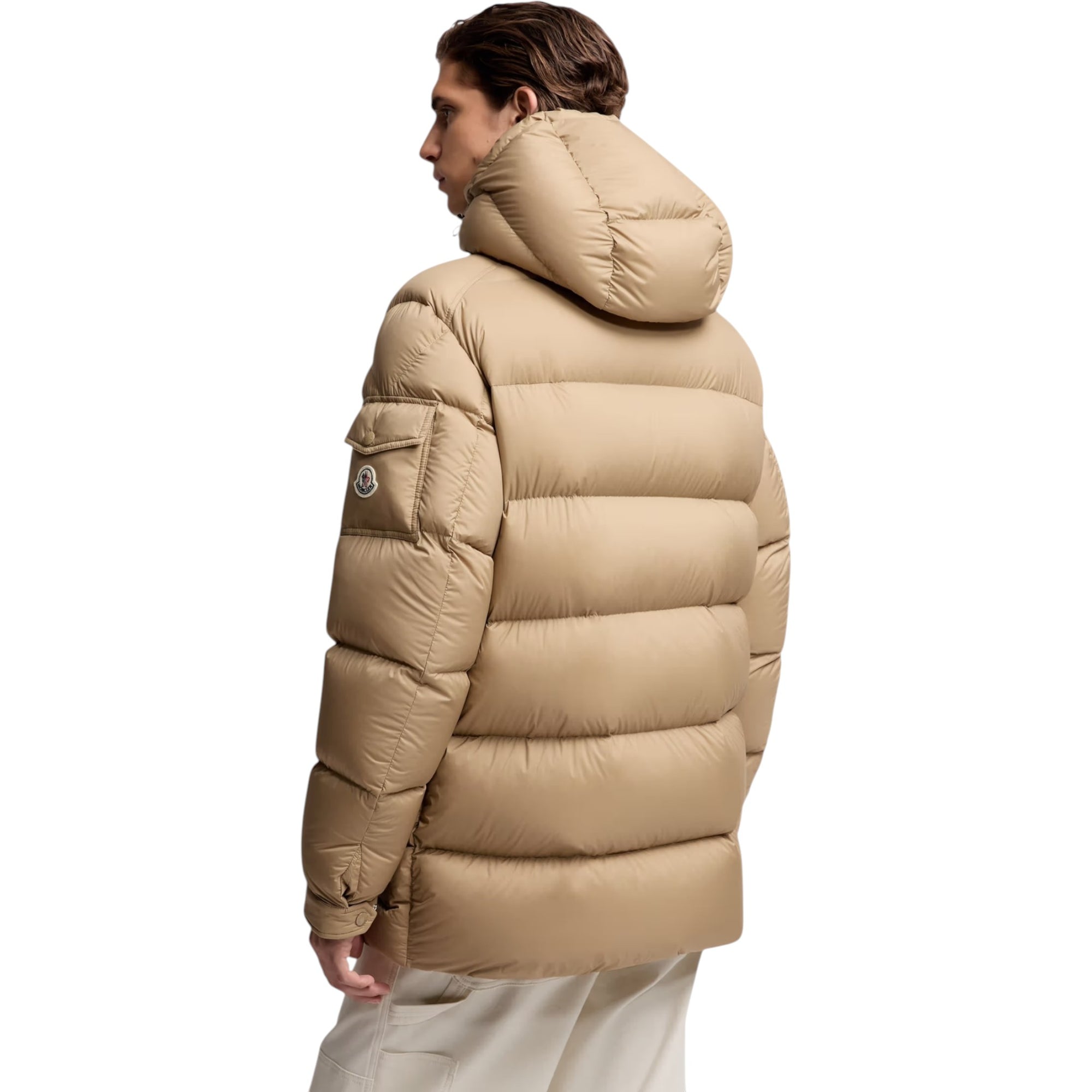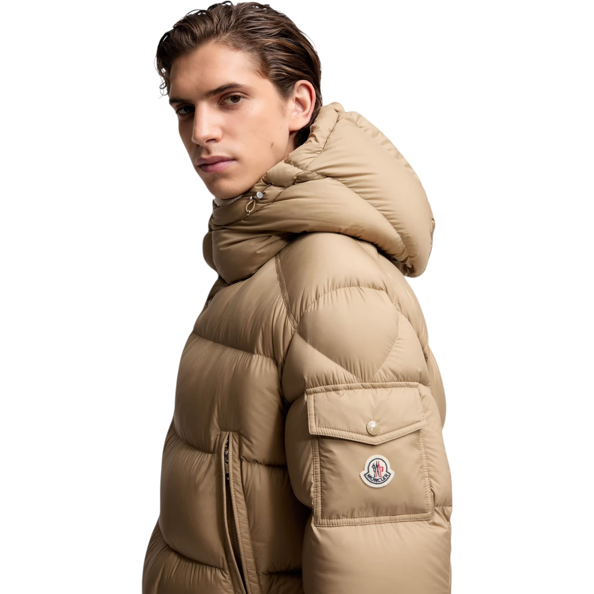 Med sit moderne, beige look og funktionelle detaljer tilbyder denne korte dunjakke til mænd både varme og stil. Det matte Longue Saison-stof er både let og vandafvisende, og sammen med den justerbare hætte og rummelige lommer får du en jakke, der er lige så praktisk som den er eksklusiv.