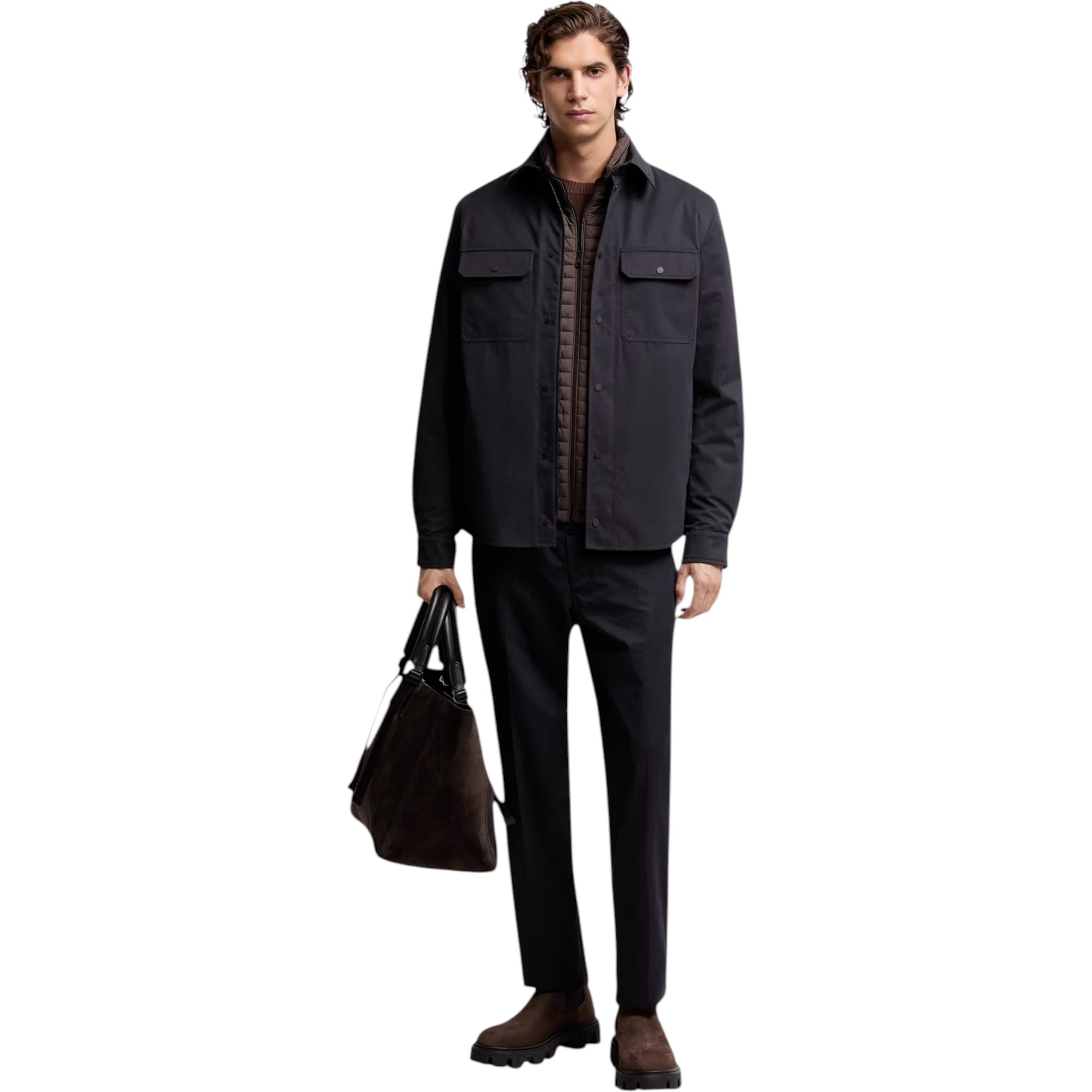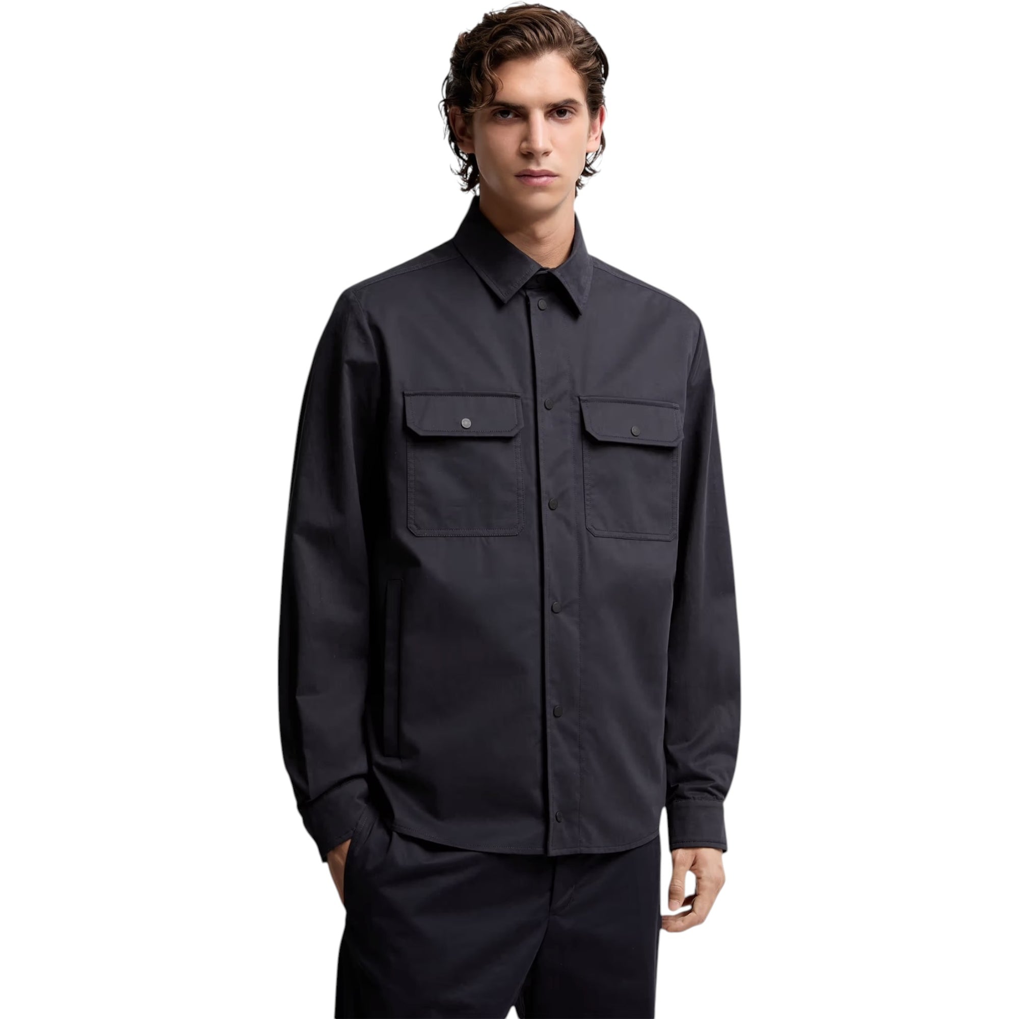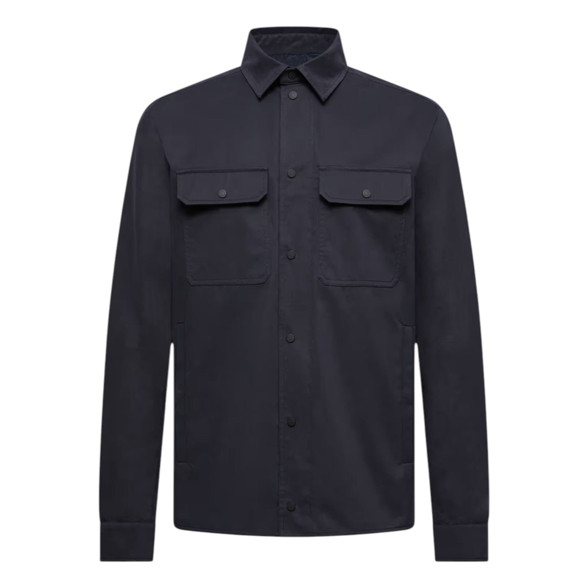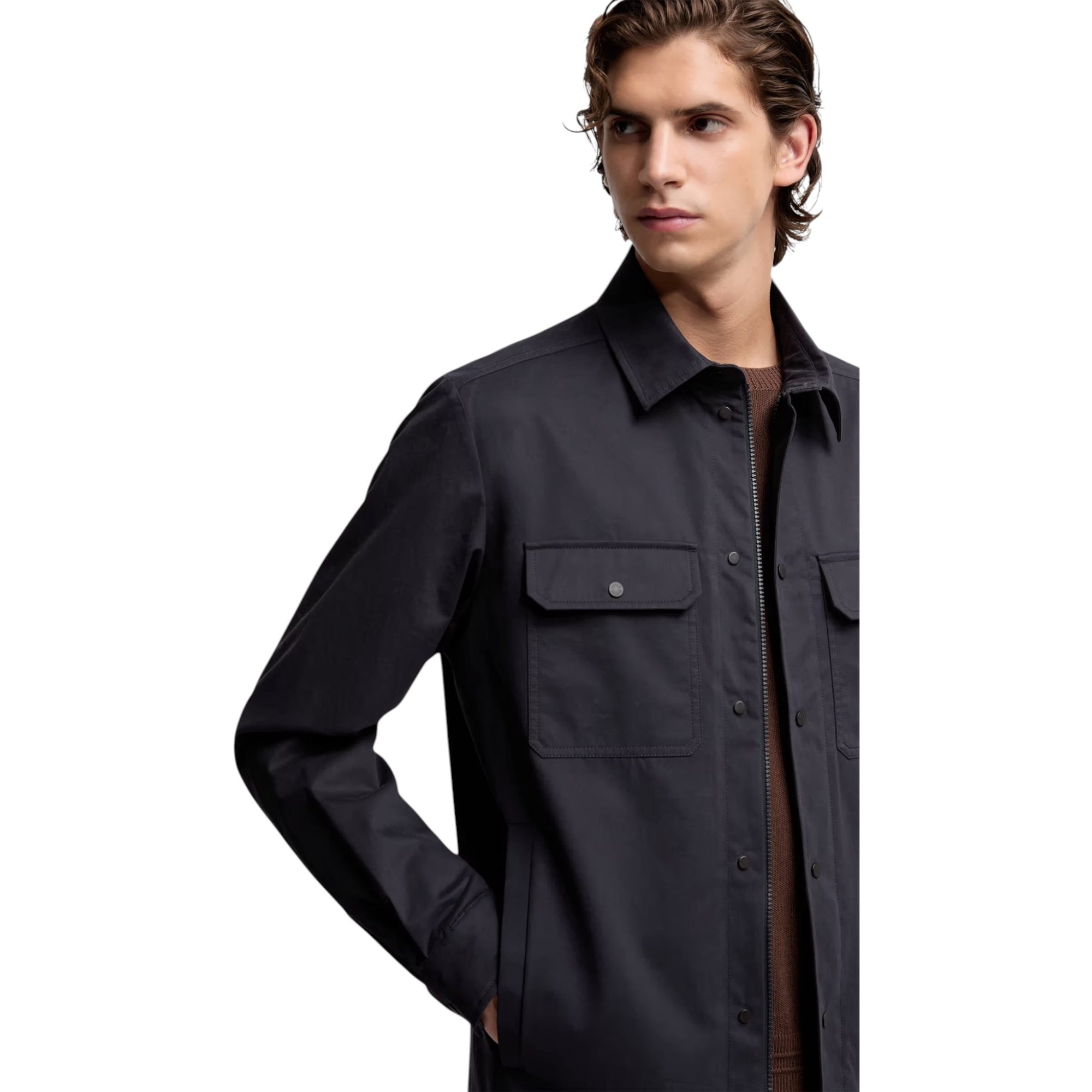 Denne navy herreskjorte kombinerer et moderne zip-up design med klassiske detaljer. Den bløde, behandlede bomuldsgabardine giver en behagelig og luksuriøs følelse, mens de praktiske lommer og justerbare manchetter gør skjorten både alsidig og anvendelig – perfekt til både arbejde og fritid.