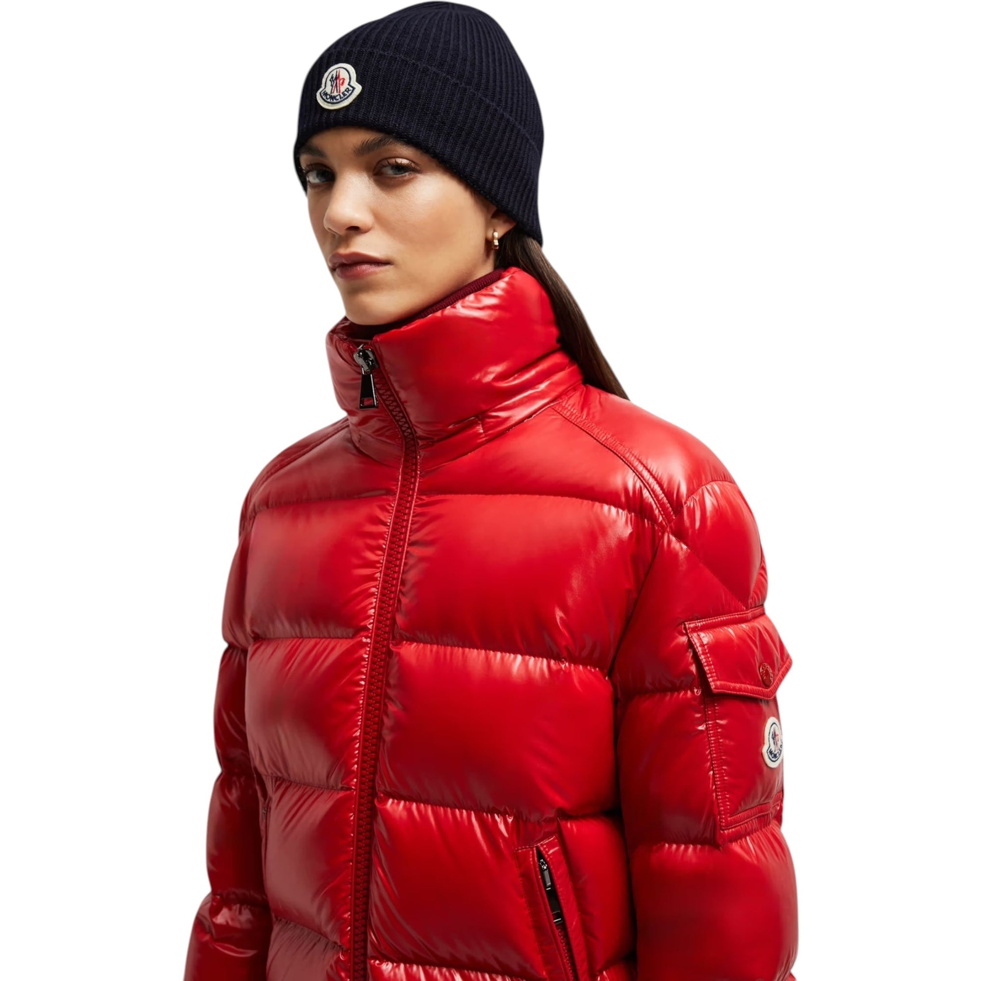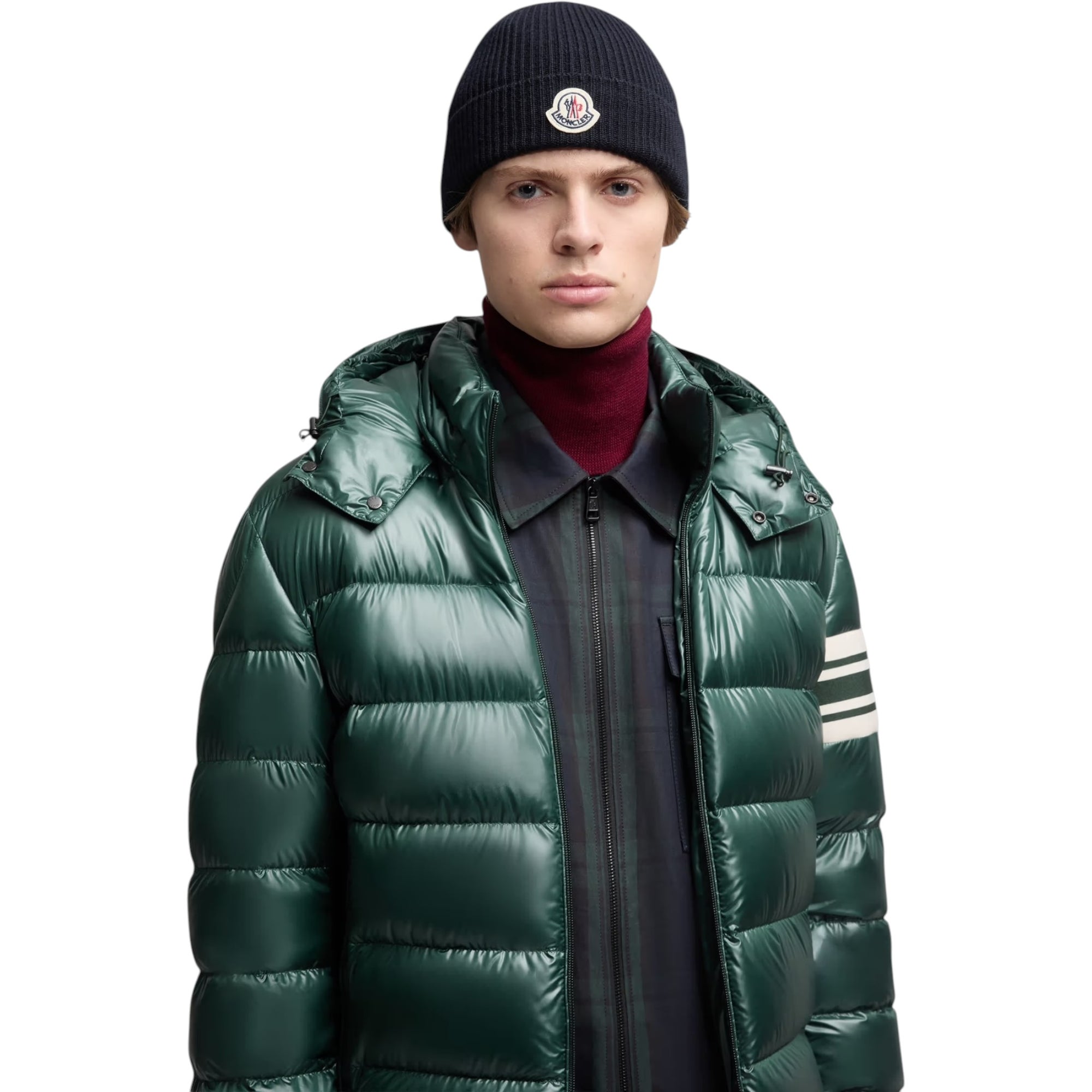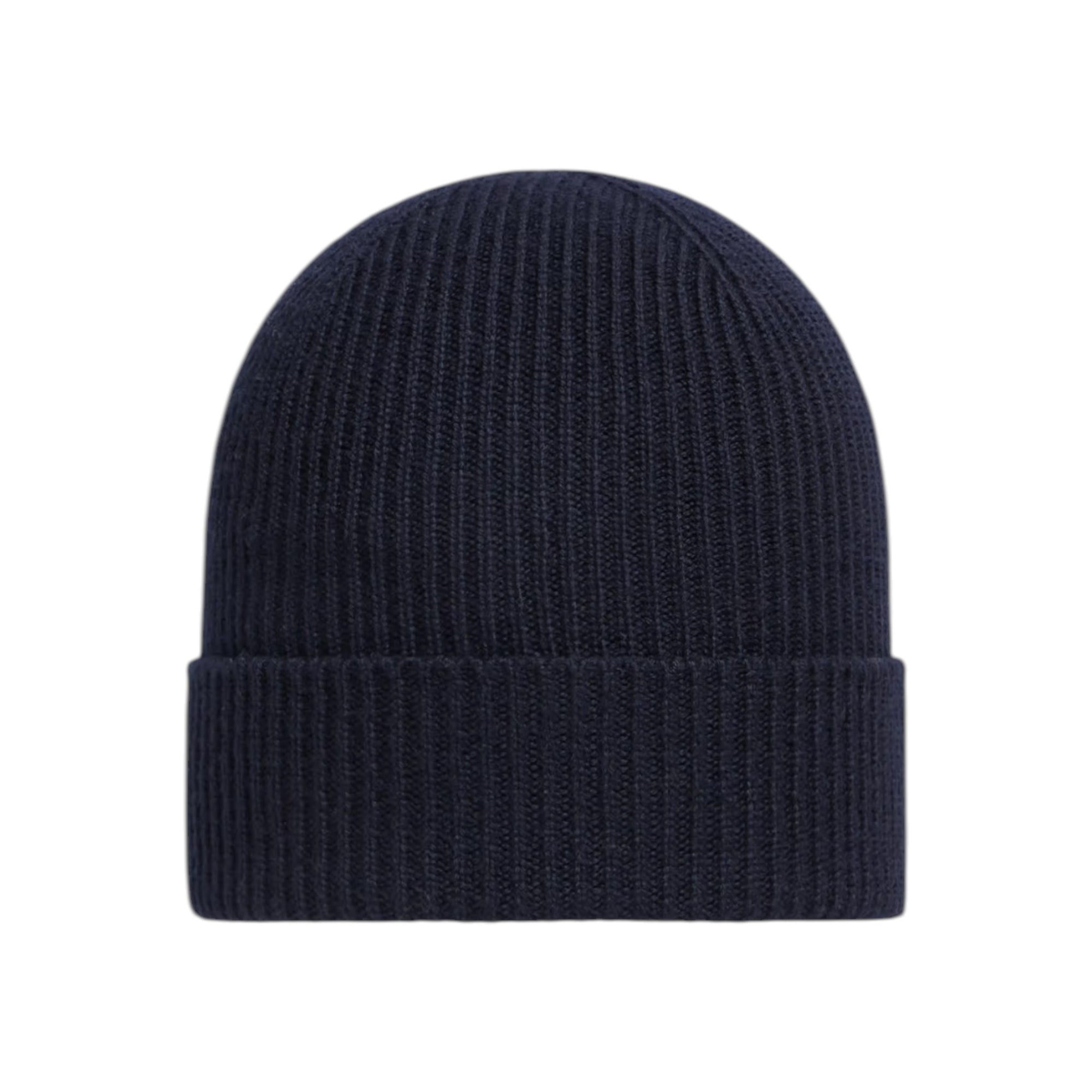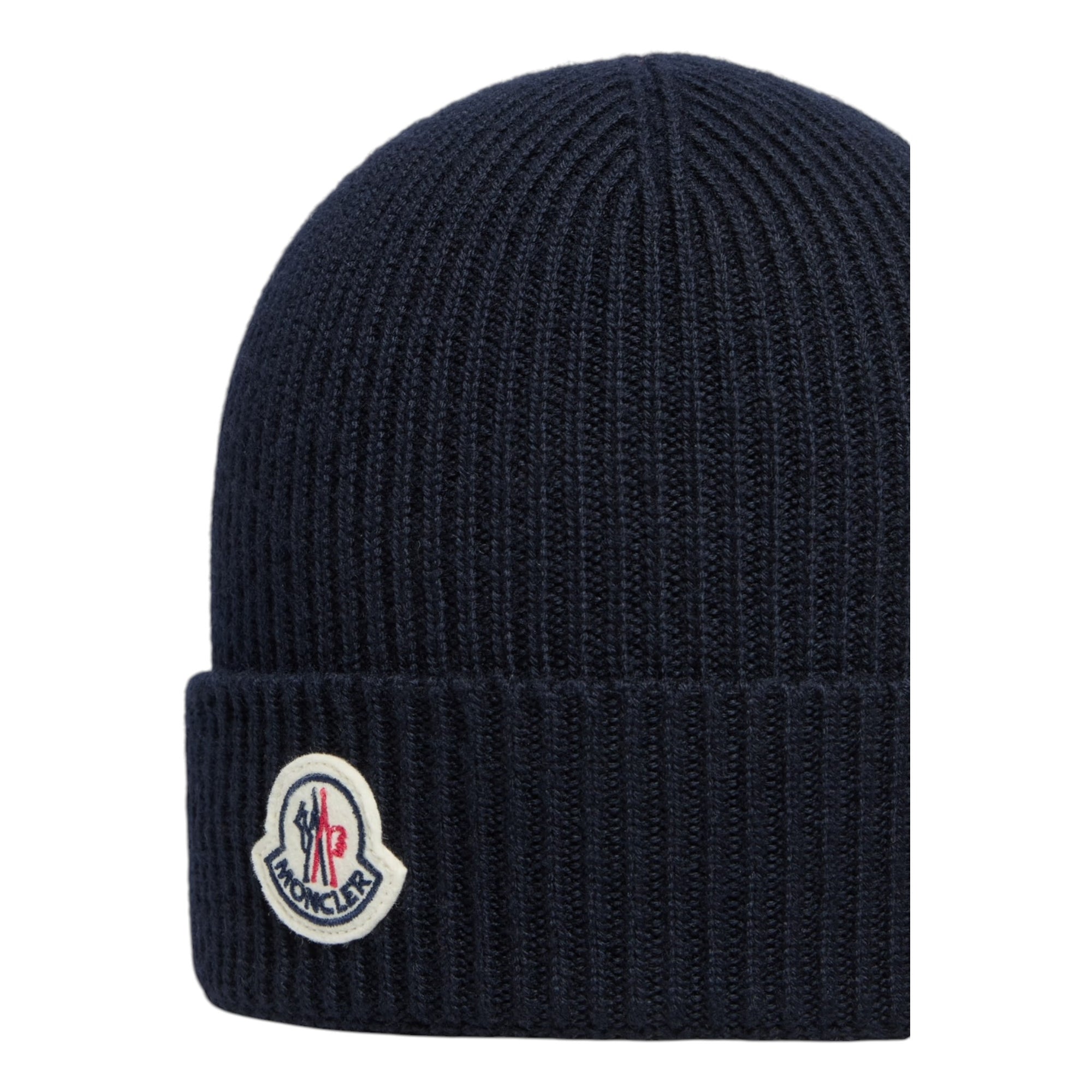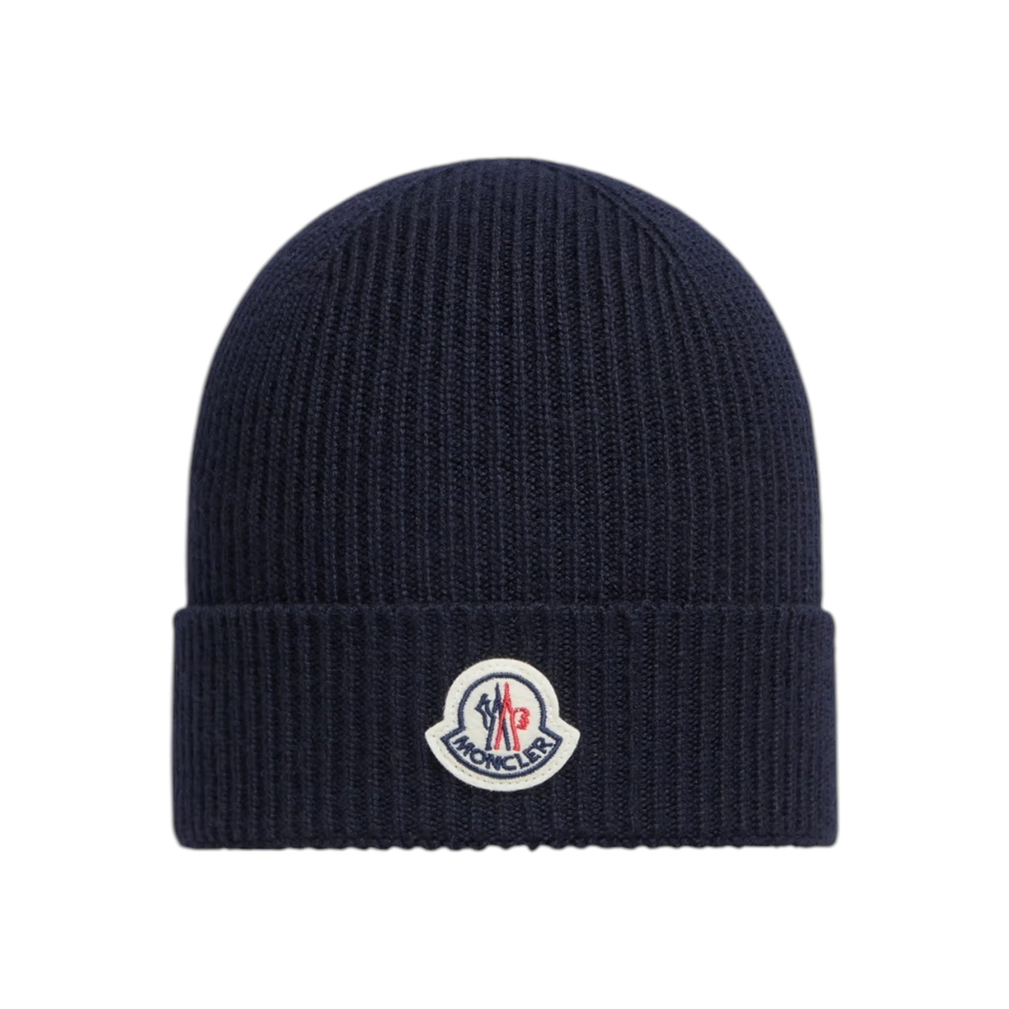 Marineblå Moncler beanie i jomfruuld – klassisk design og luksuriøs varme