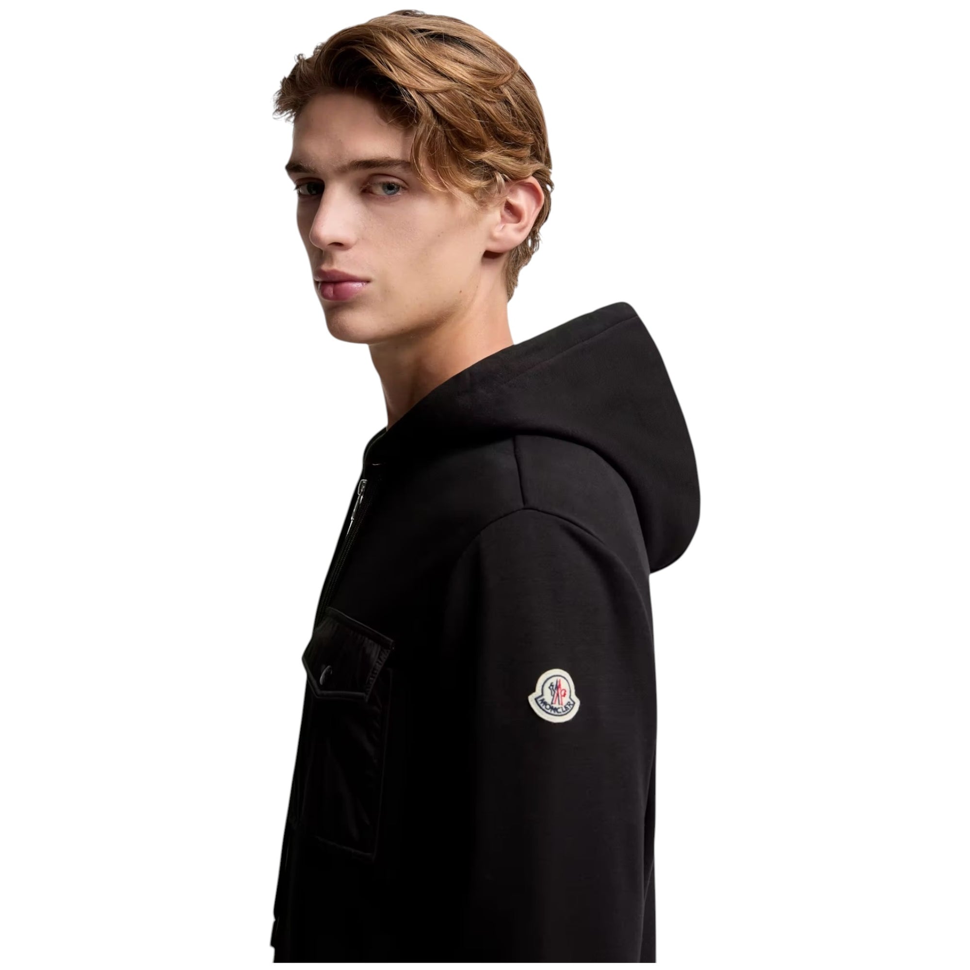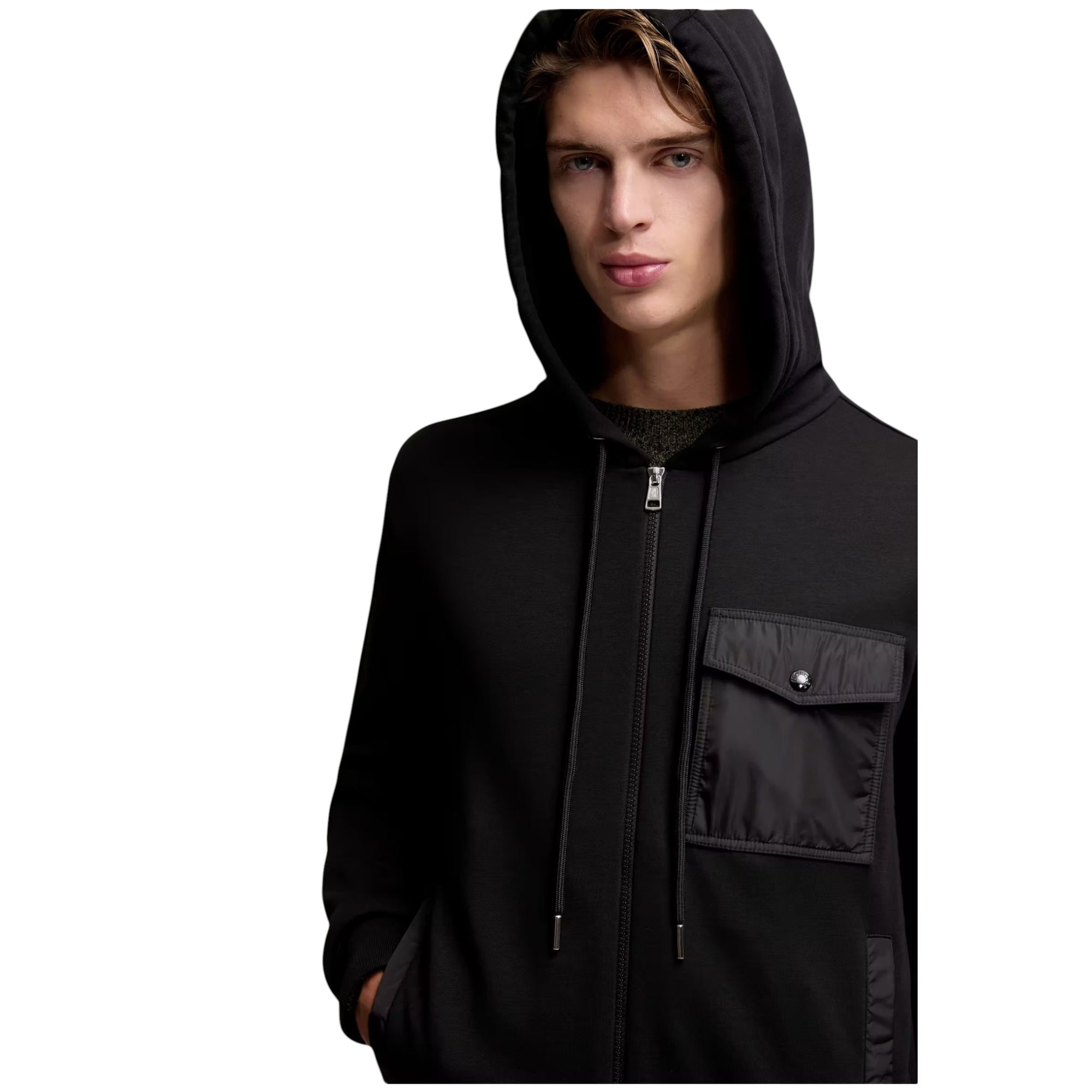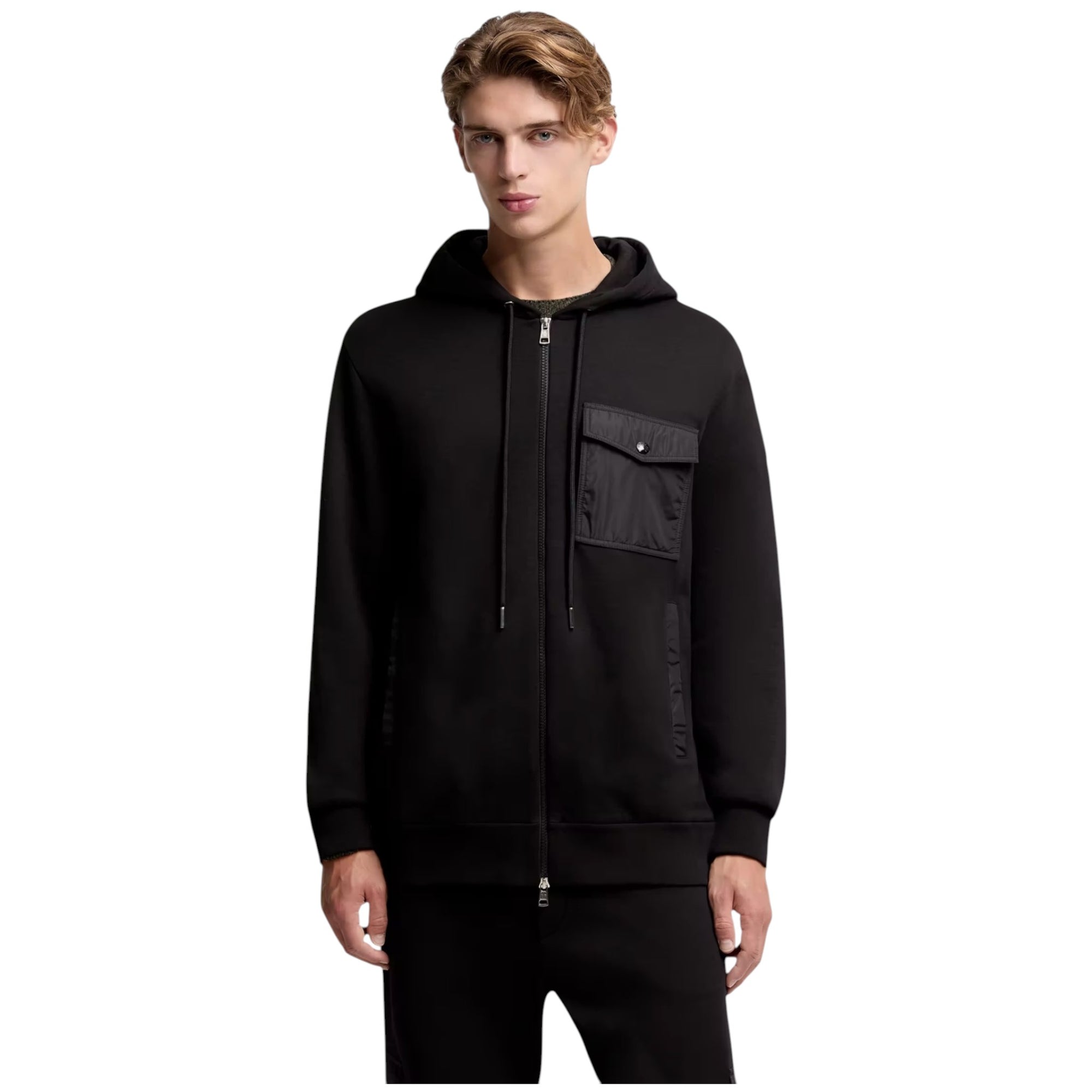 Opgrader din hverdagsgarderobe med denne komfortable og stilrene cotton blend zip-up hoodie i sort. Hoodie’en er skabt til mænd, der ønsker afslappet komfort uden at gå på kompromis med et moderne udtryk. Med sin bløde fleece, skinnende nylondetaljer og praktiske brystlomme er denne hoodie et perfekt valg til både fritid og sporty hverdagslooks.