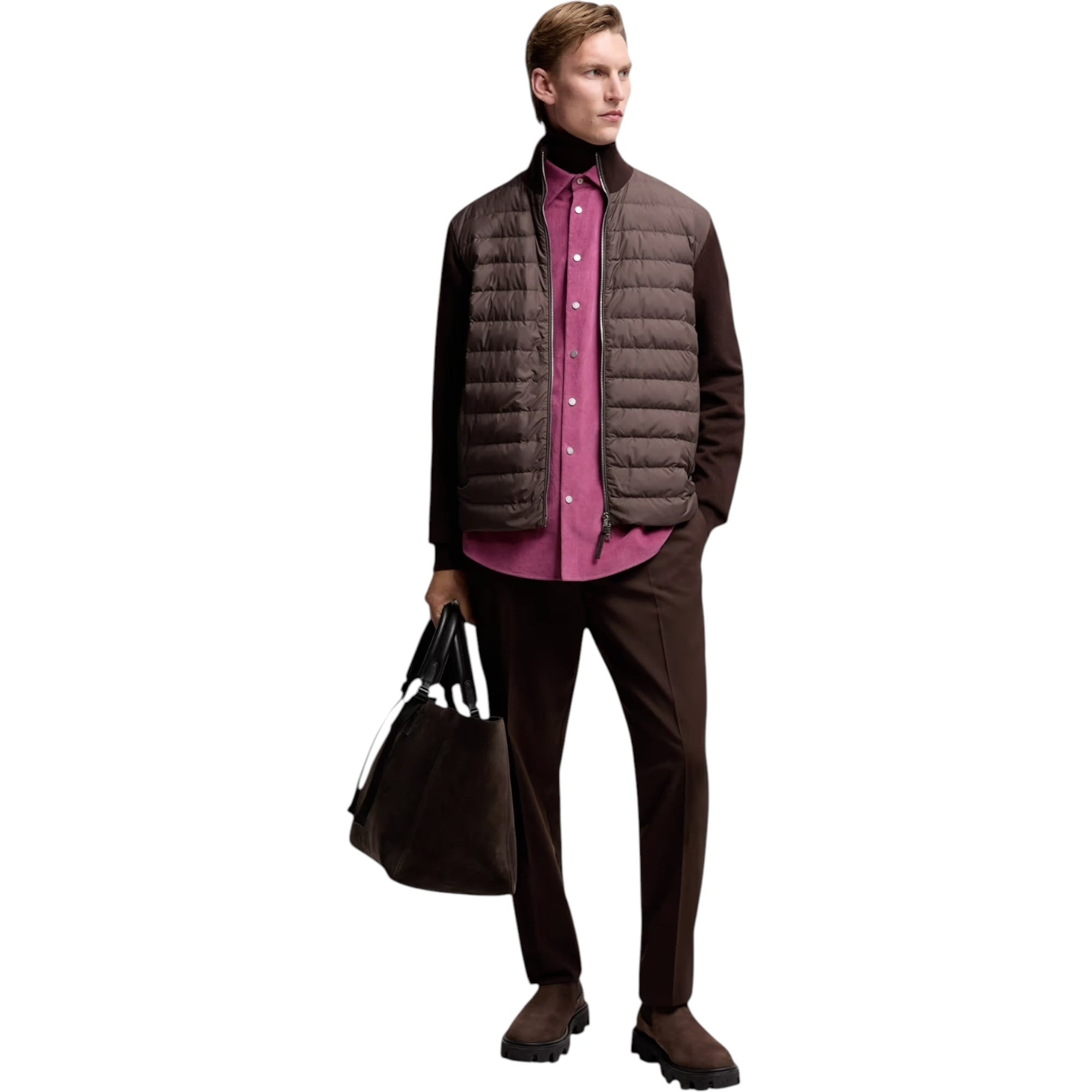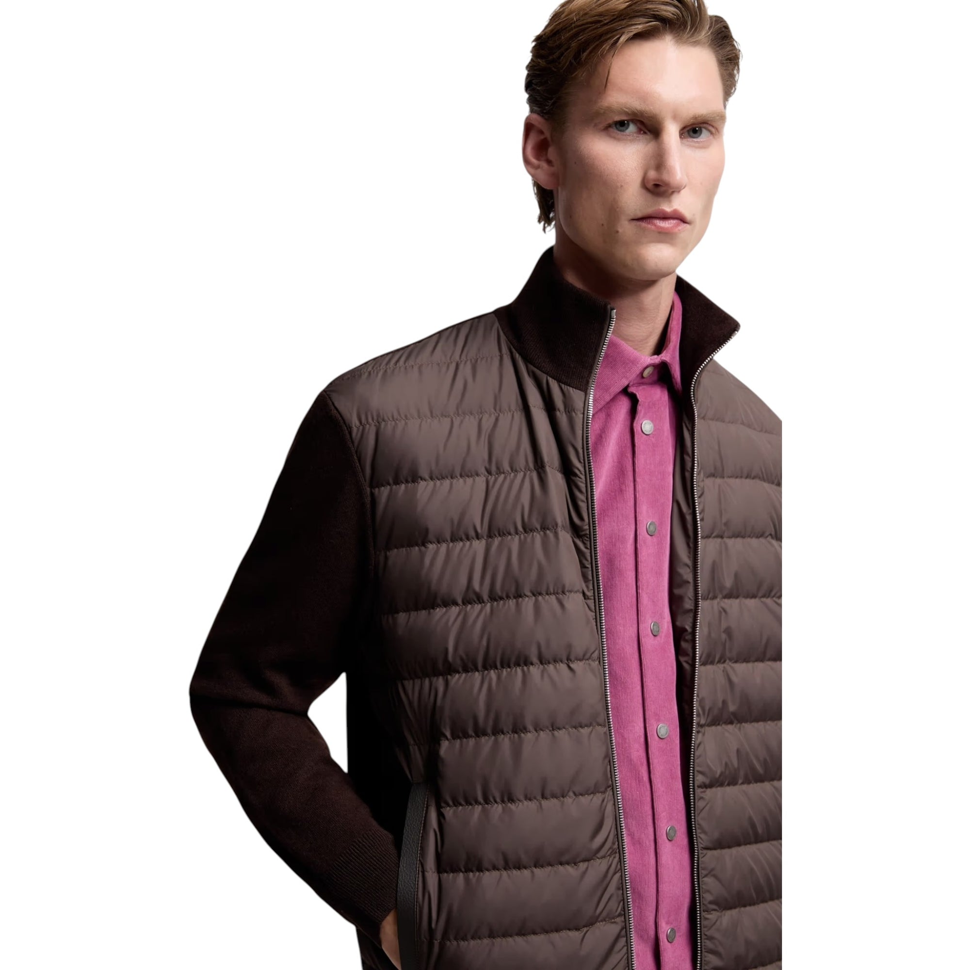 Padded Wool & Cashmere Zip-Up Cardigan i brun forener luksuriøs komfort med teknisk varme. Denne cardigan fungerer både som en elegant striktrøje og som let yderjakke i overgangsperioder – perfekt til moderne mænd, der ønsker stil og funktion i ét.