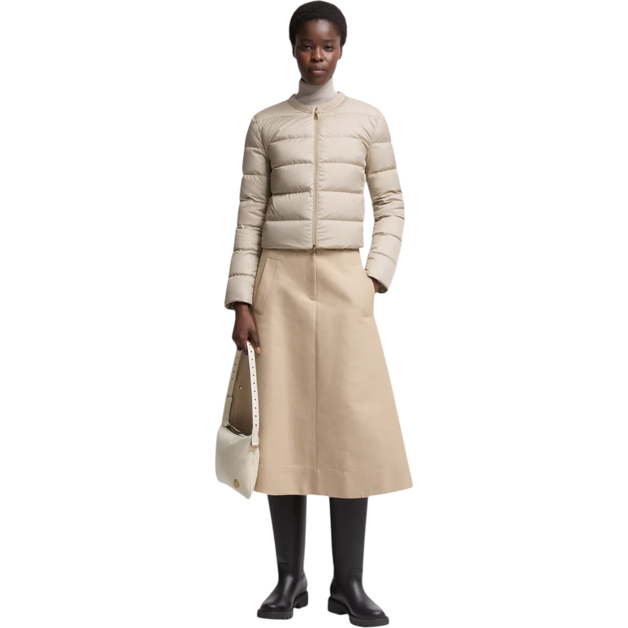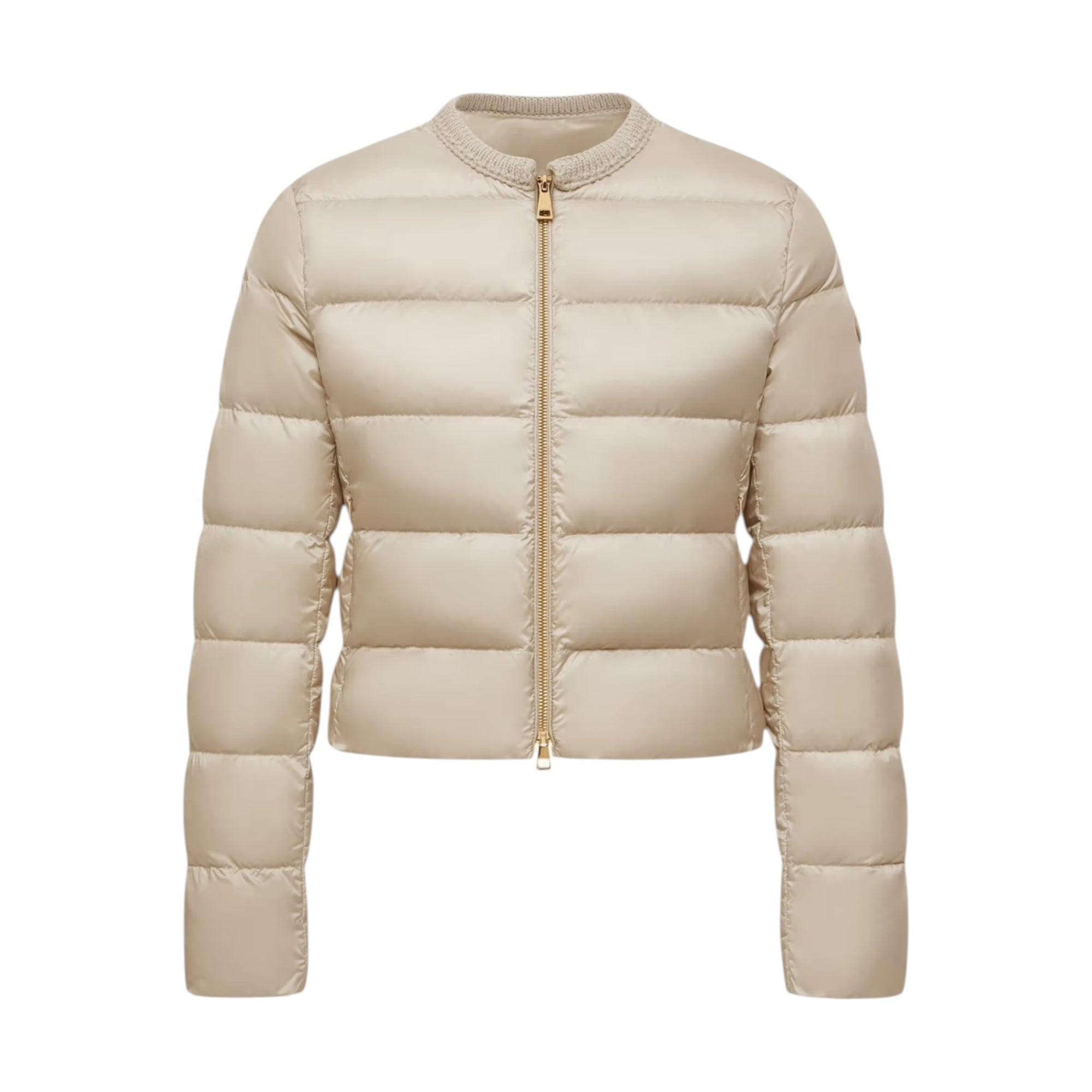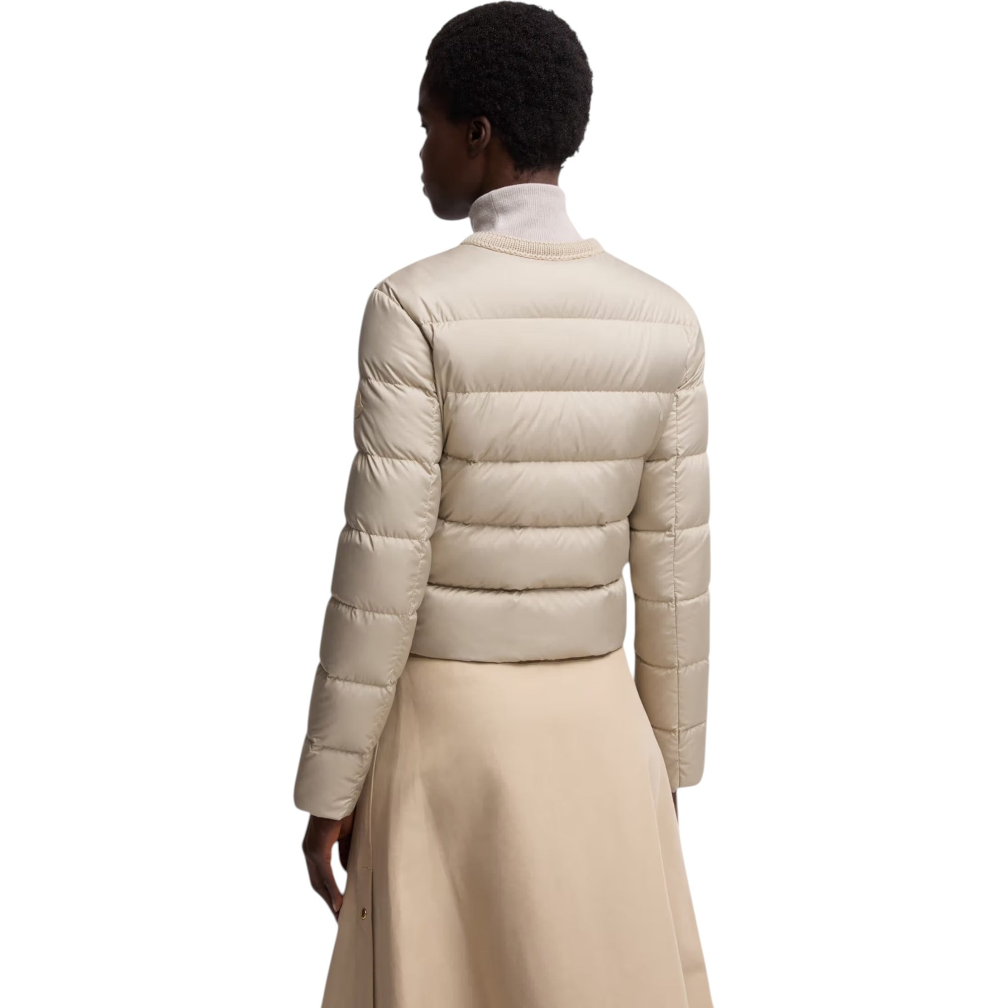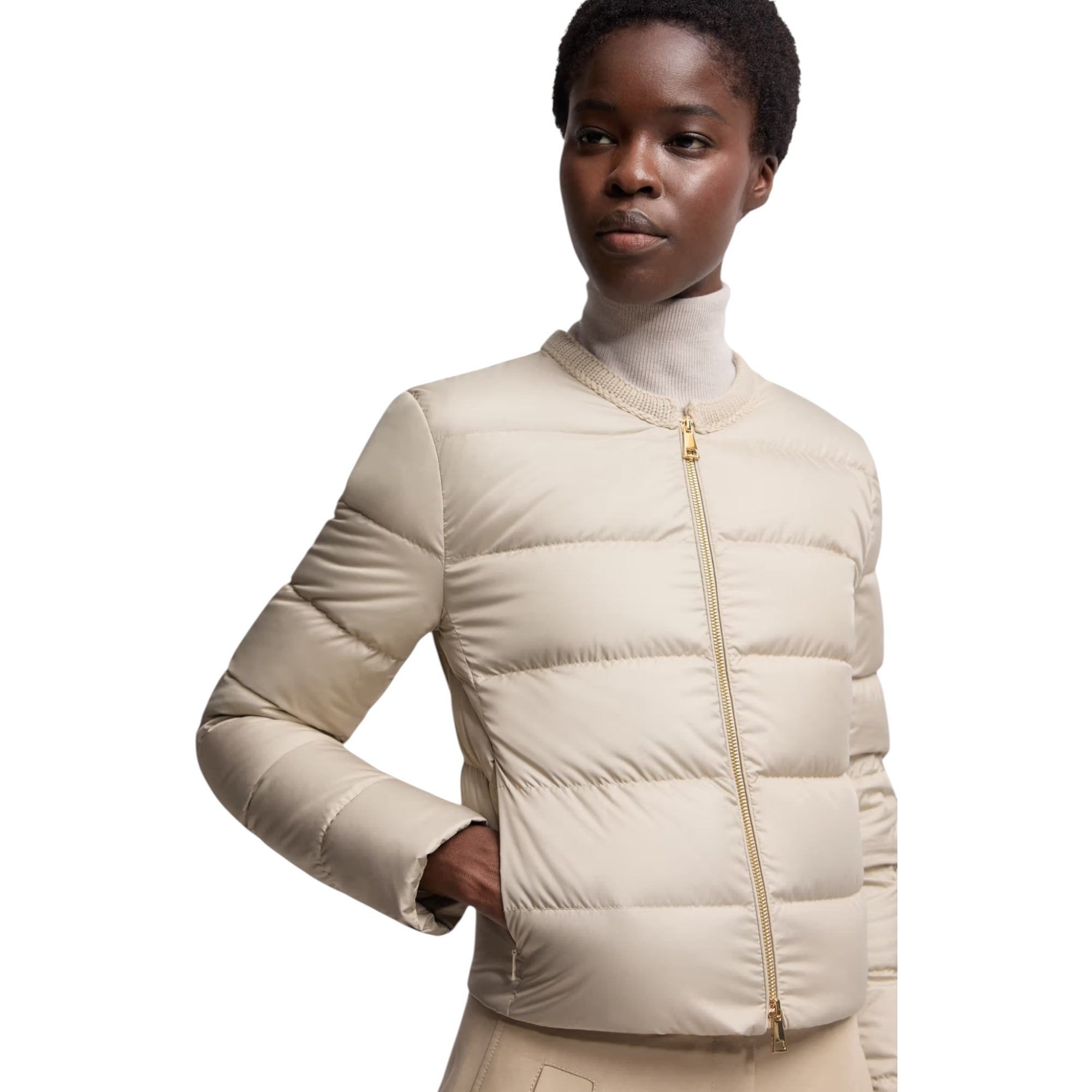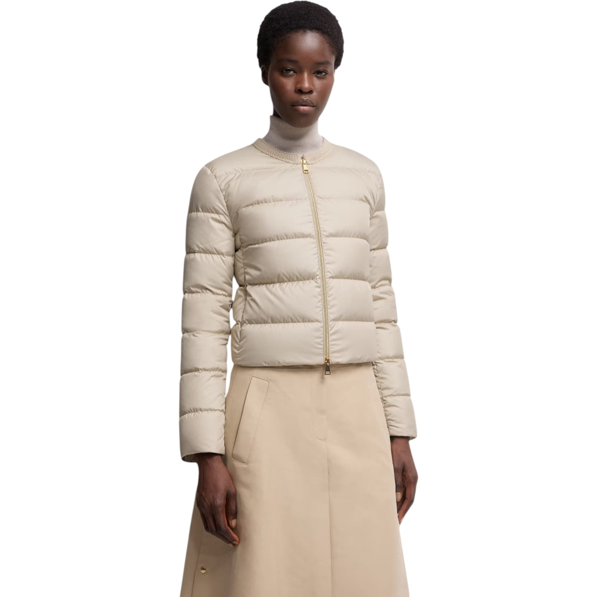 Mauvezin Wool-Trimmed Short Down Jacket i beige er en eksklusiv og feminint designet dunjakke fra Moncler. Jakken kombinerer luksuriøse materialer med et moderne, minimalistisk udtryk. Den korte, kraveløse silhuet og bløde uldkant ved halsen skaber et sofistikeret look, der er perfekt til både hverdag og mere elegante anledninger.