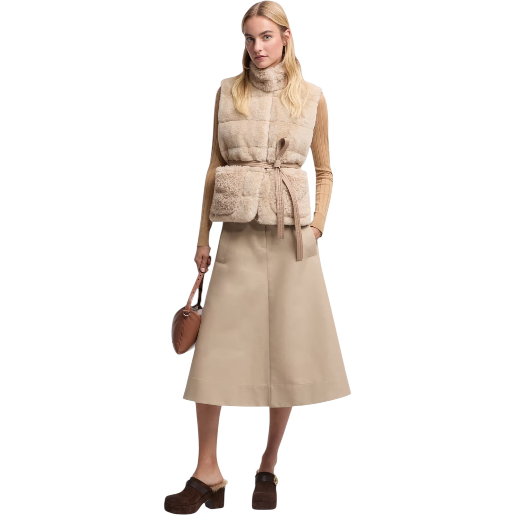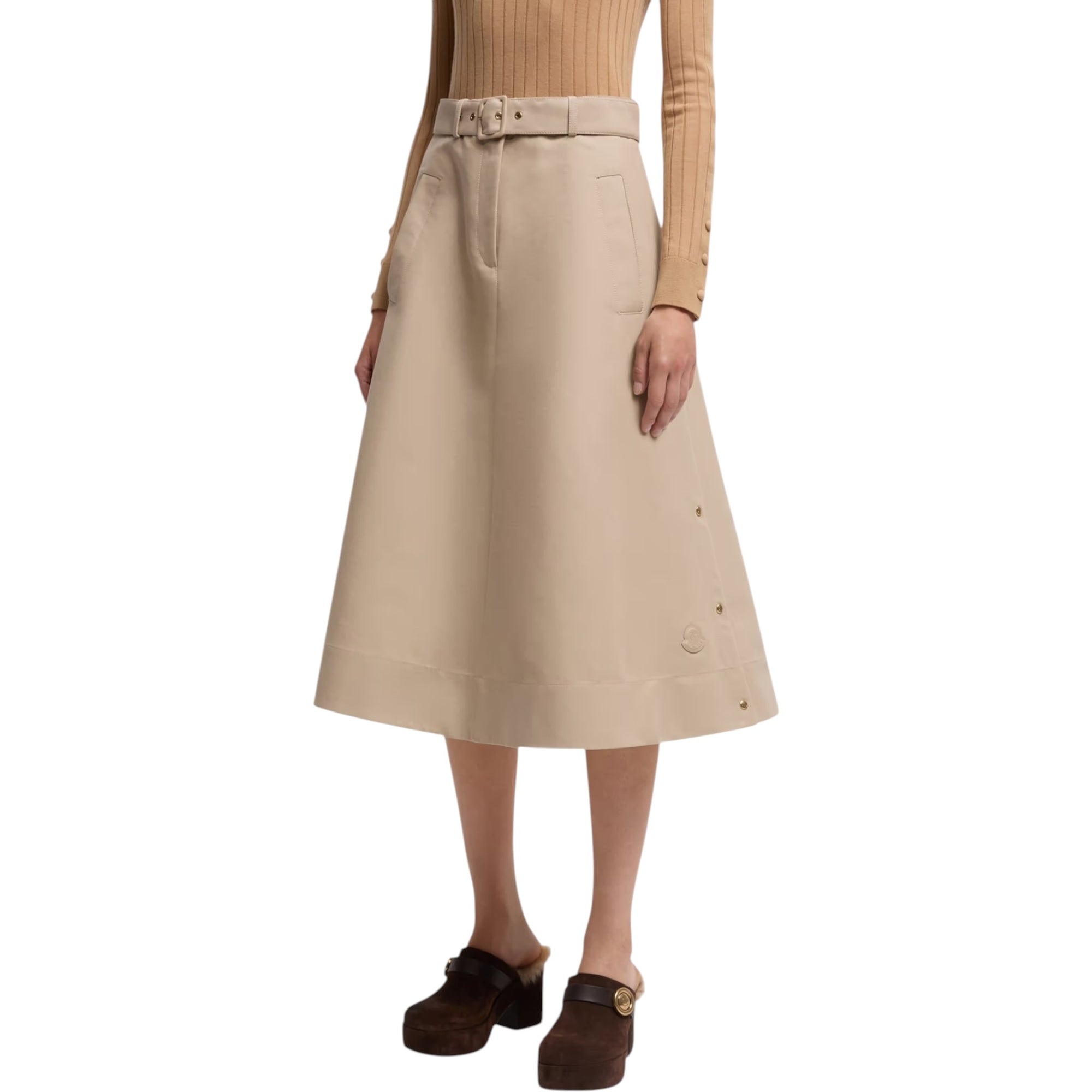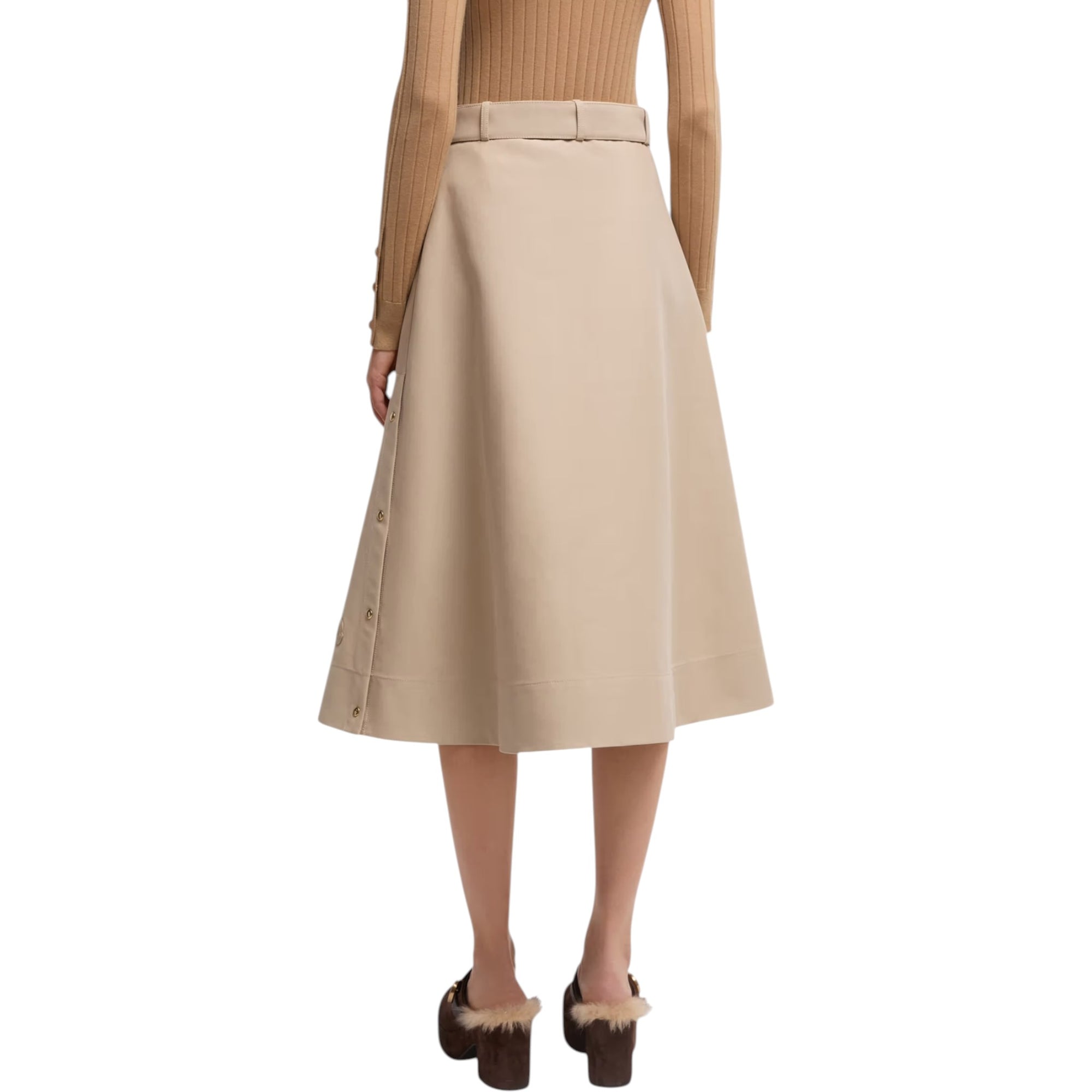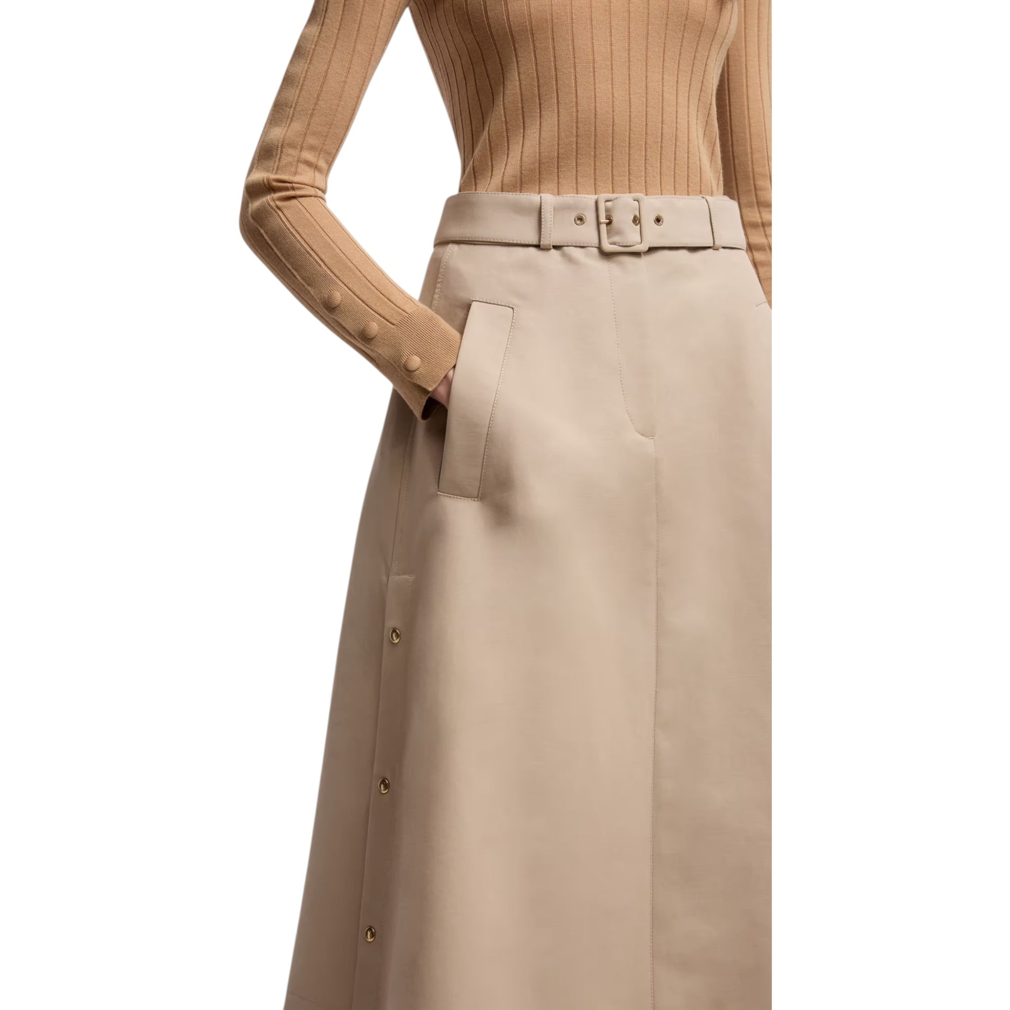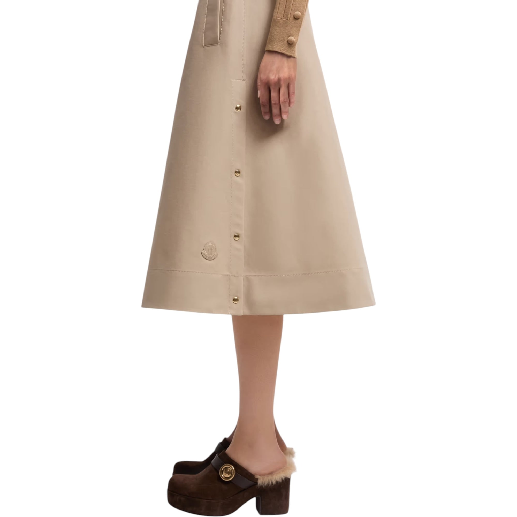 Cotton Midi Skirt Beige – Tidløs A-formet nederdel i 100% bomuld Denne Cotton Midi Skirt i beige kombinerer klassisk design med moderne funktionalitet og komfort. Med sit elegante A-line snit og justerbare detaljer er nederdelen et alsidigt valg til både hverdag og mere formelle anledninger. Fremstillet i dobbeltlags bomuld, sikrer den både struktur og bevægelighed – perfekt til den moderne kvinde. Komfort og stil i perfekt balance Nederdelen er designet med justerbare slids i siderne, der giver mulighed for at tilpasse udtrykket – fra klassisk og lukket til mere afslappet og luftig. En aftagelig taljebælte fremhæver figuren og giver ekstra stylingmuligheder. De praktiske sidelommer tilføjer funktionalitet, mens læderlogoet påsyet diskret giver et eksklusivt finish. Produktdetaljer: Fremstillet i dobbelt bomuld for struktur og komfort Klassisk A-line pasform i midi-længde Justerbare slidser i siderne Aftageligt bælte til at fremhæve taljen Sidelommer og lynlåslukning Eksklusivt læderlogo-patch Farve: Beige – alsidig og tidløs Materialesammensætning: Basestof: 100% Bomuld Logo-tag: Kalveskind (læder) Derfor skal du vælge Cotton Midi Skirt Beige: Flatterende A-formet silhuet – elegant og moderne Luftigt og holdbart bomuldsstof – perfekt til både varme og overgangssæsoner Justerbare detaljer for personlig styling Neutral beige farve, der passer til alt i garderoben Kombination af komfort, funktion og stil