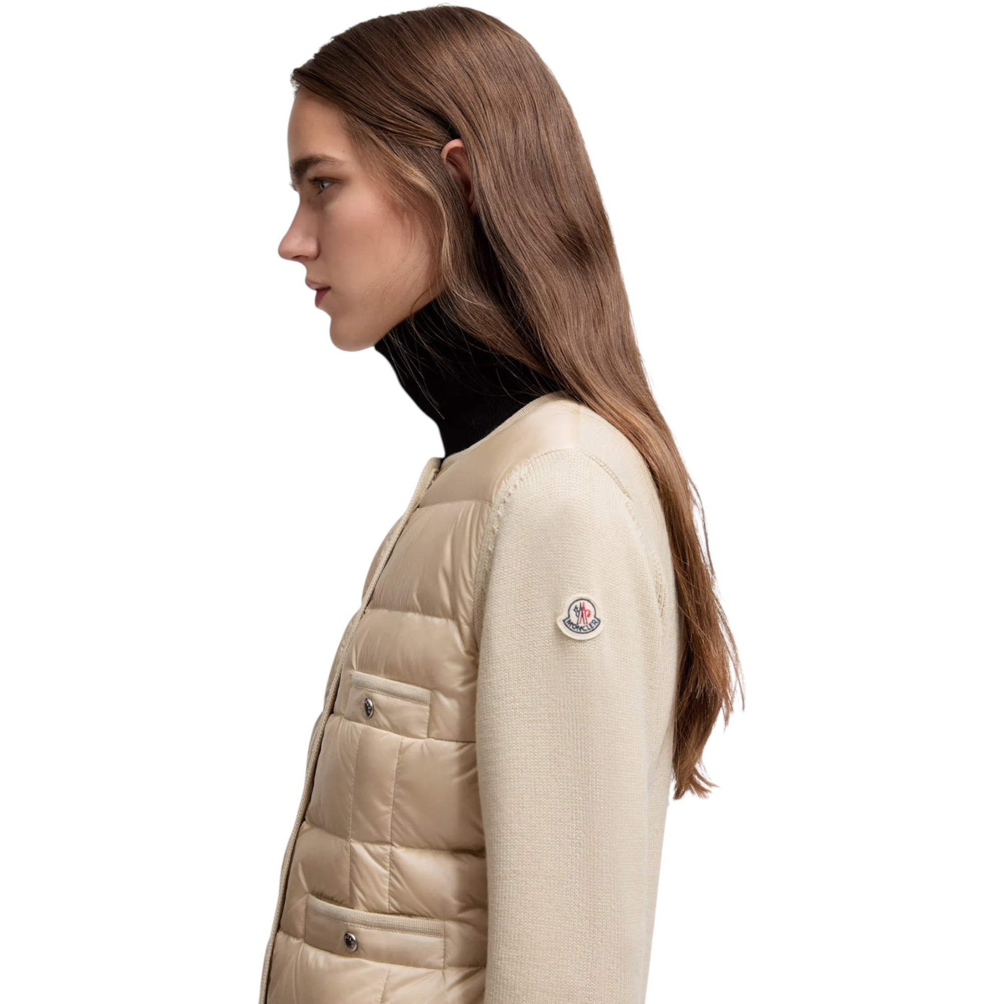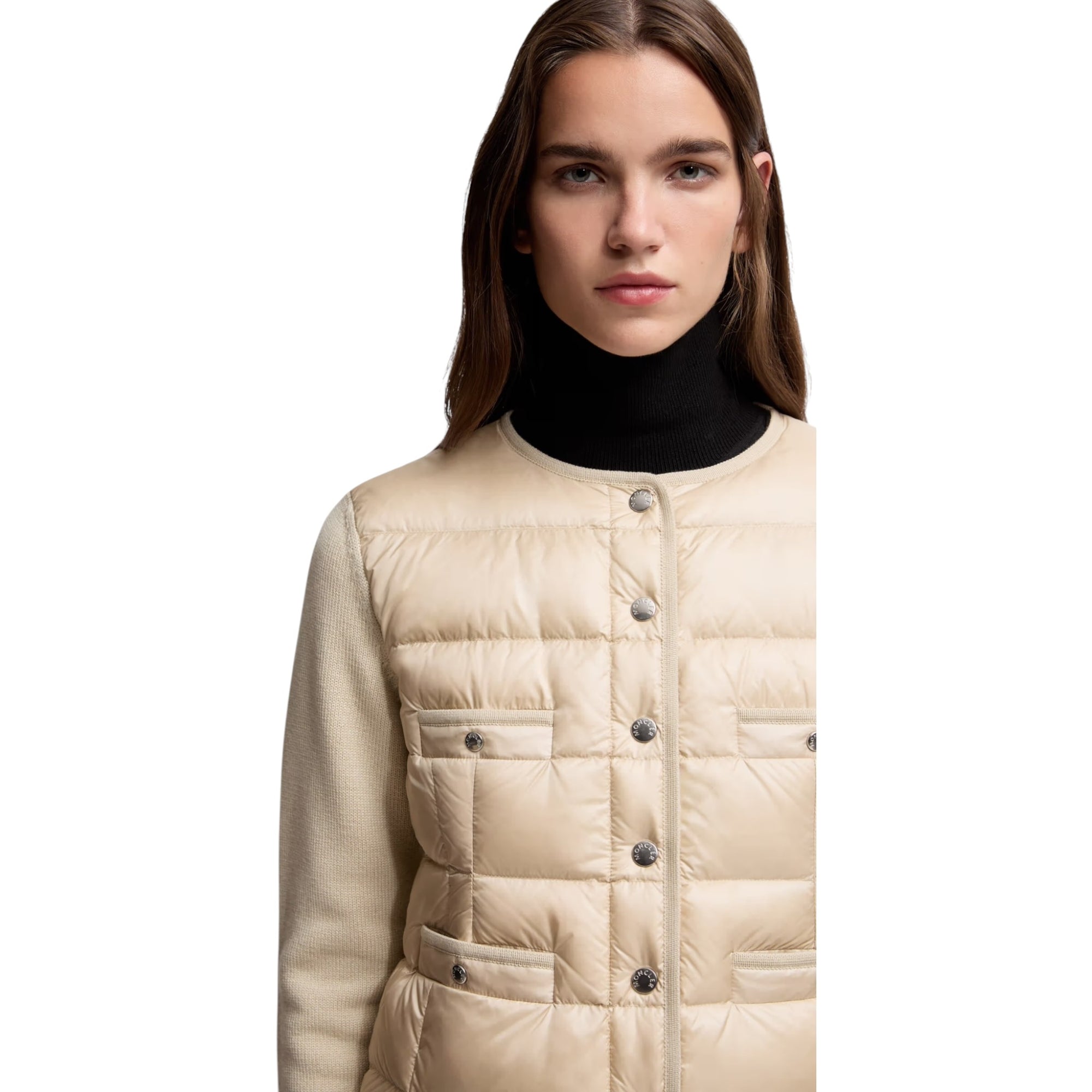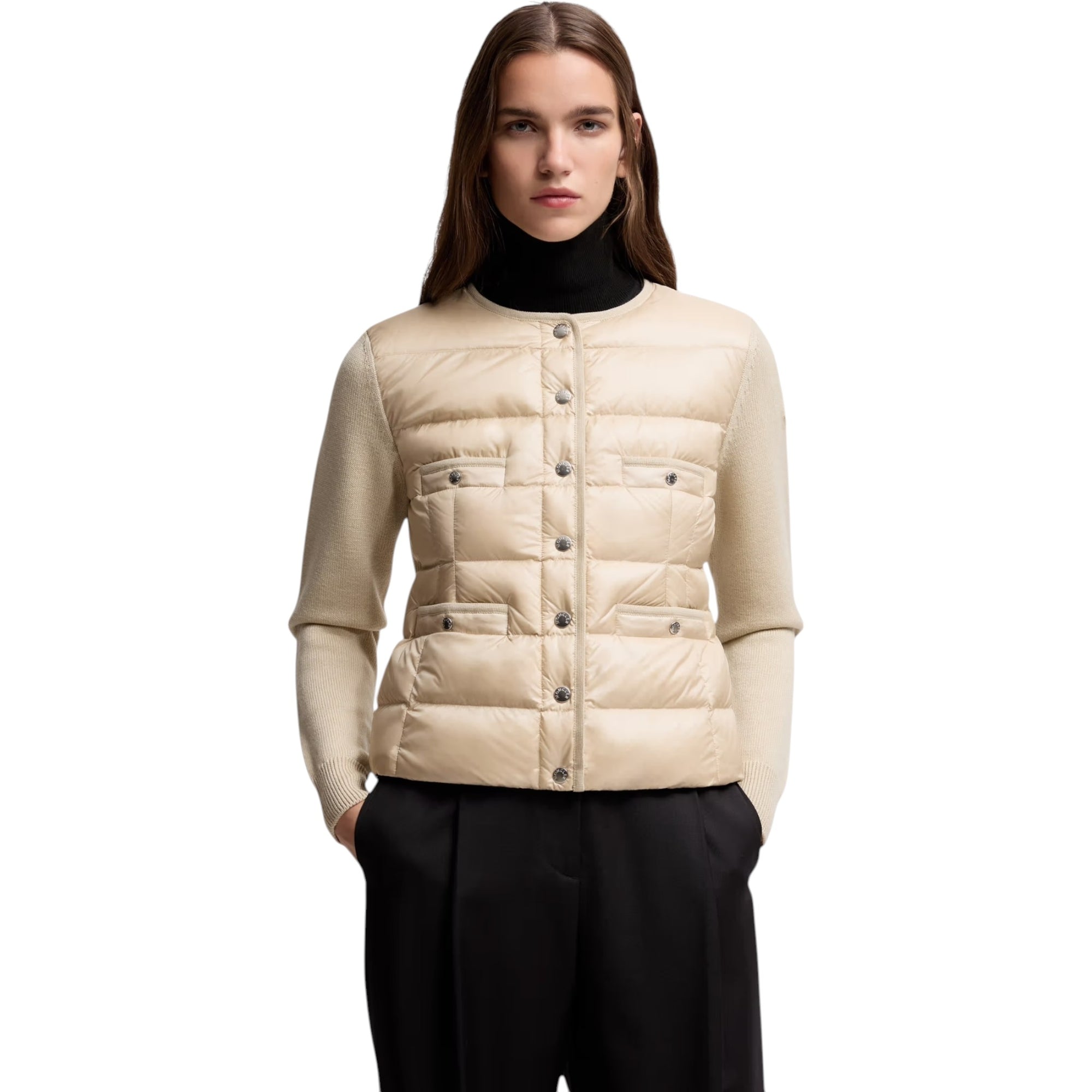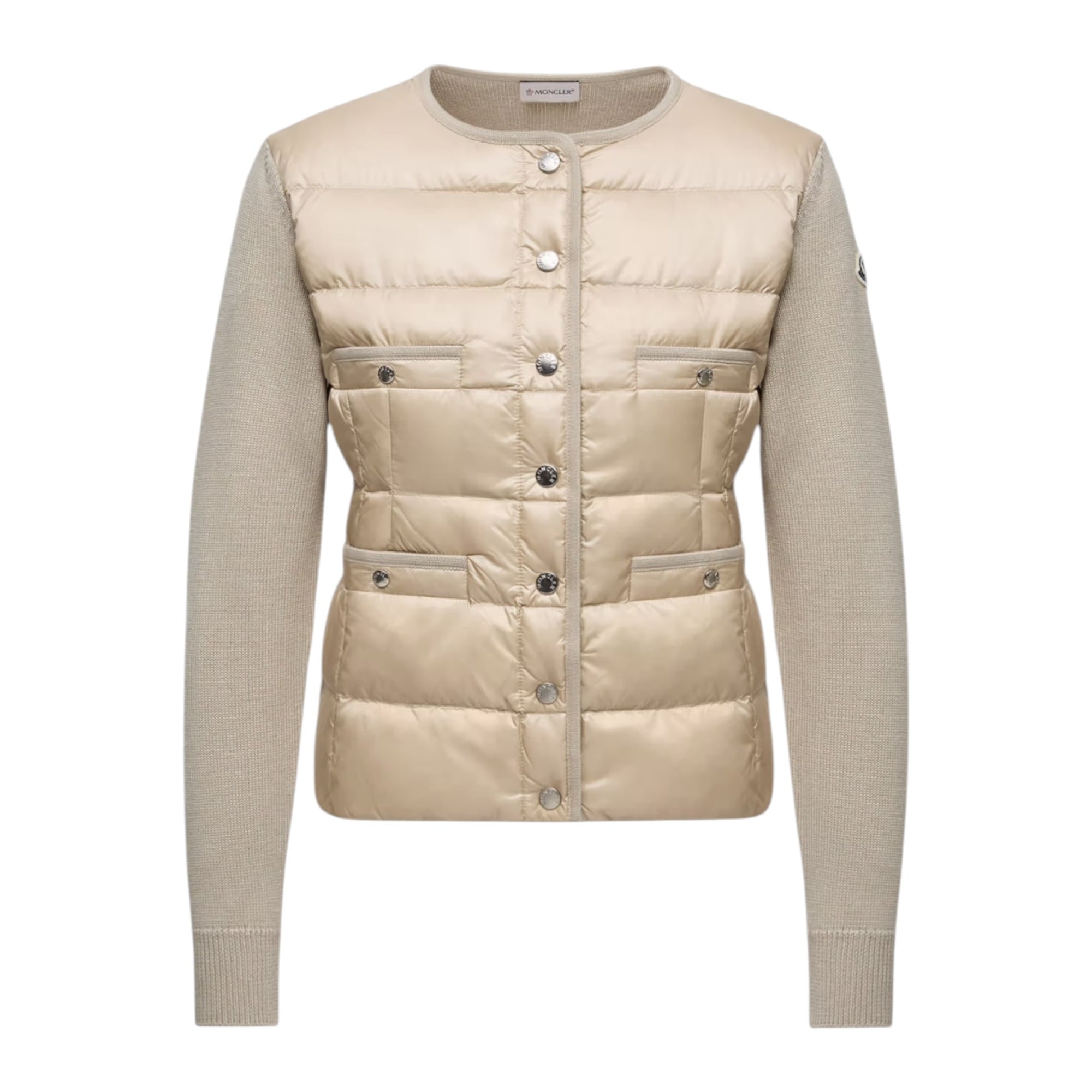 Padded Wool Cardigan Beige – Let luksus til hele året Elegant, tidløs og funktionel – Padded Wool Cardigan i beige kombinerer blød Merino-uld med en let dunfyldt front, hvilket gør den til et ideelt valg som både cardigan og let jakke. Den lyse farve tilføjer et eksklusivt og feminint udtryk, som gør cardiganen velegnet til både hverdag og mere formelle lejligheder. Perfekt balance mellem varme og stil Cardiganen er strikket i ultrafin Merino-uld, kendt for sin naturlige blødhed og evne til at temperaturregulere. Fronten er betrukket med glansfuld Longue Saison-nylon og fyldt med let dun, hvilket giver varme uden at gå på kompromis med lethed og bevægelighed. Trykknaplukning, lommer og strikkede detaljer fuldender det minimalistiske, sofistikerede look. Produktdetaljer: Fremstillet i 100% ultrafin Merino-uld Dunfyldt front i Longue Saison-nylon Let og varm – ideel som overgangslag Gauge 7 fully-fashioned strik for struktur og komfort Trykknapper foran for enkel lukning Diskrete lommer og ribkanter Farve: Beige – lys, neutral og alsidig Pasform og størrelse: Regular fit – flatterende og behagelig til alle kropsformer Nem at style lag-på-lag Kan anvendes som let jakke i milde temperaturer Materialesammensætning: Front: 100% Polyamid / Nylon Basestof: 100% Virgin wool (Merino) Foer: 100% Polyamid / Nylon Fyld: 90% Dun, 10% Fjer Derfor skal du vælge Padded Wool Cardigan i beige: Luksuriøs kombination af uld og dun Let og alsidig – fungerer hele året Tidløs beige farve, der passer til alt Eksklusiv komfort i naturlige materialer Kan bruges både som cardigan og let overtøj