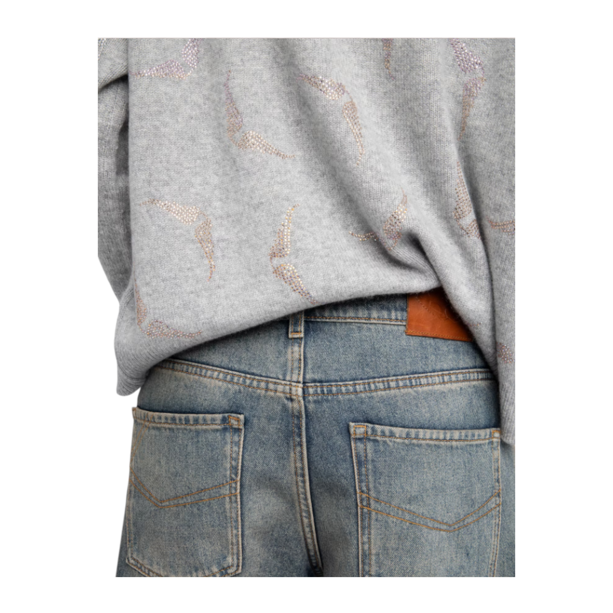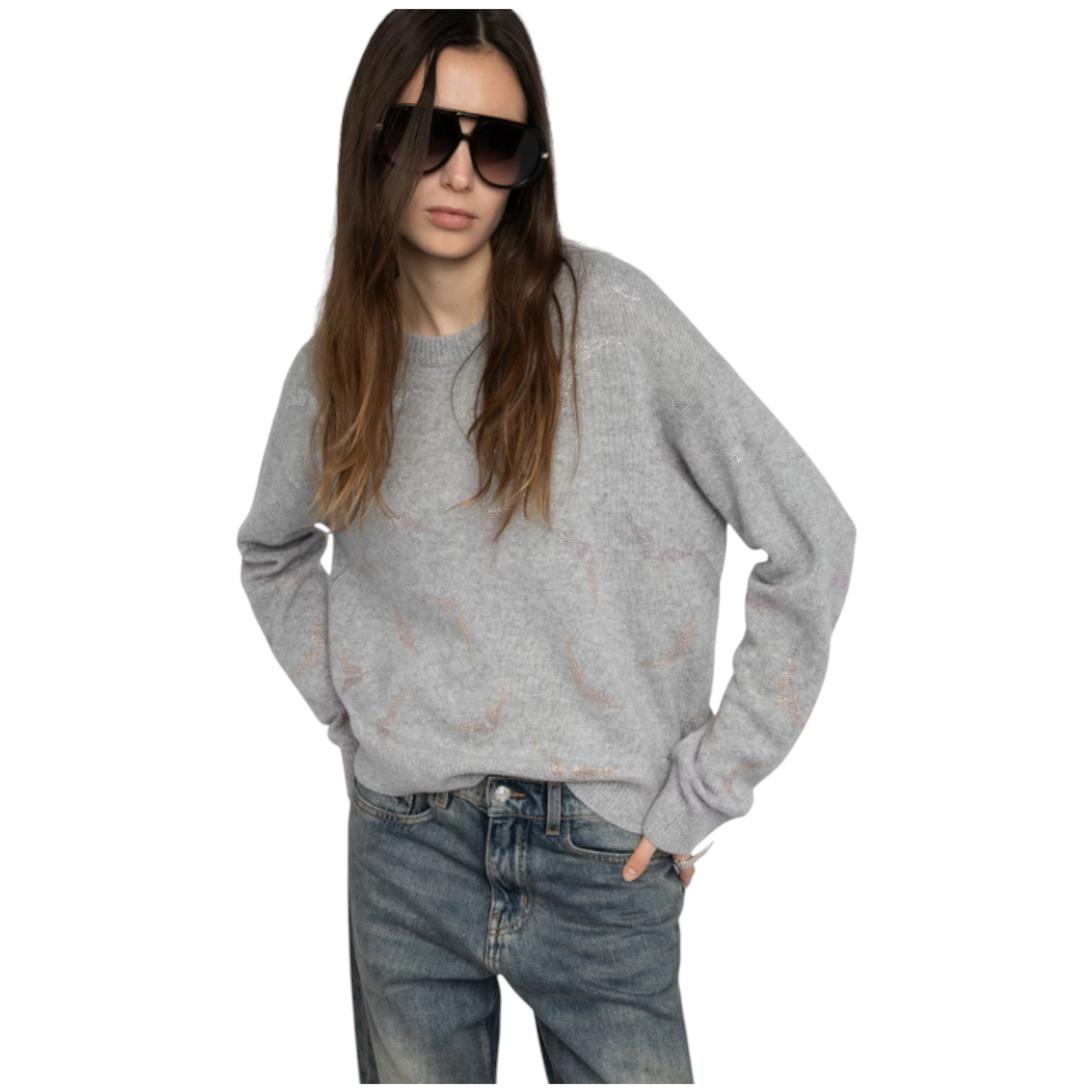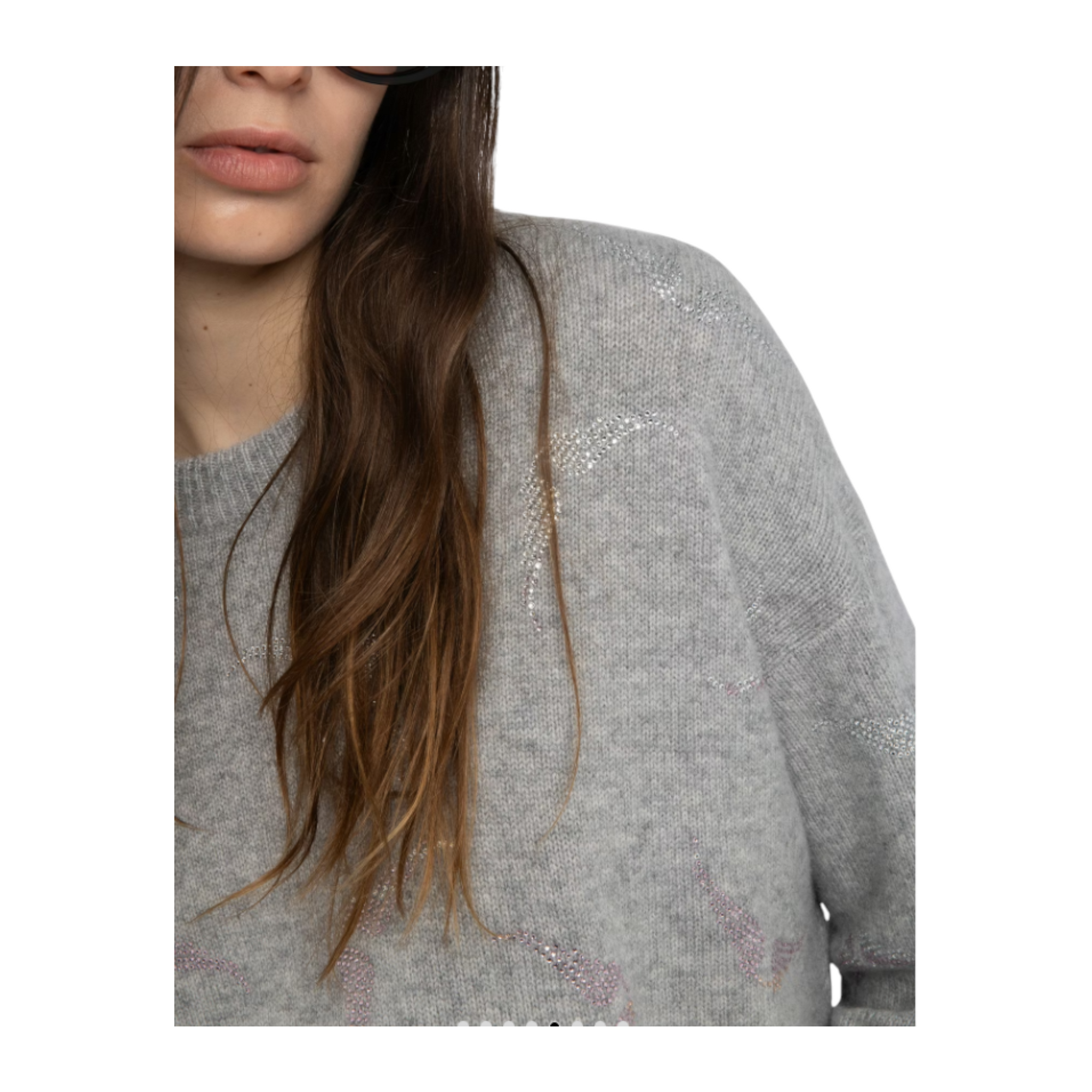 Eksklusiv cashmere-strik med rund hals og ikoniske vinge-detaljer pyntet med rhinsten i forskellige farver. Den bløde kvalitet og det let oversized fit giver et luksuriøst og afslappet udtryk.