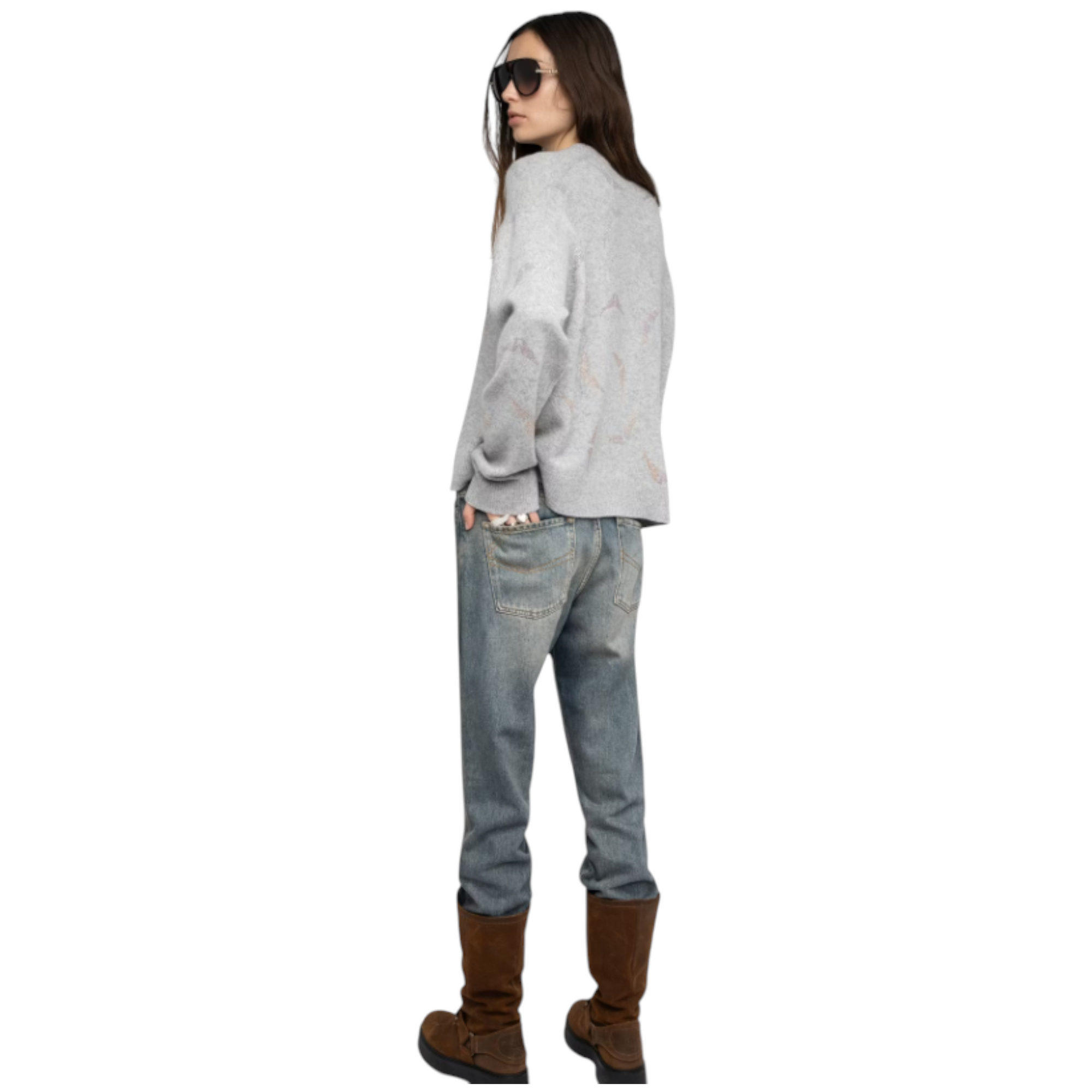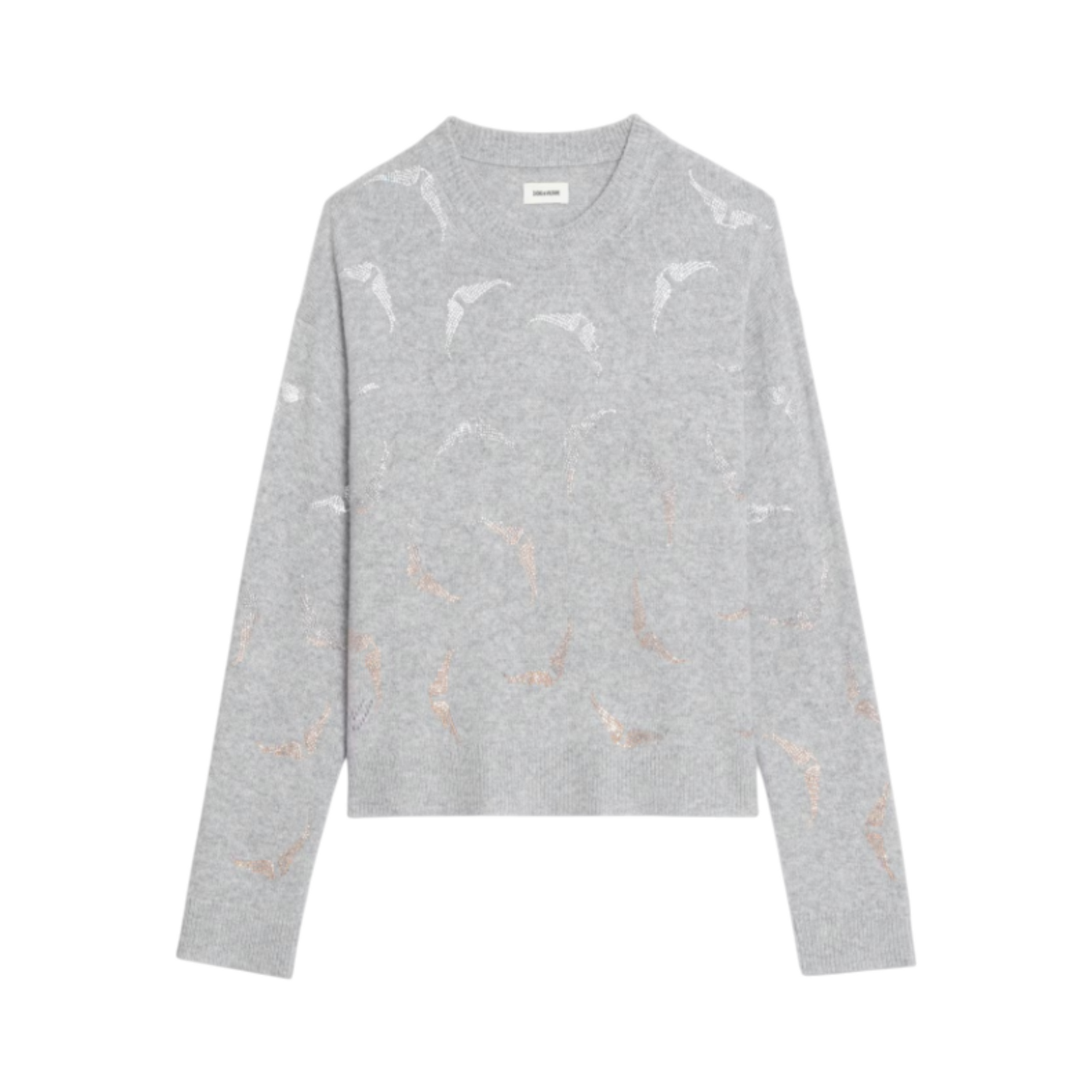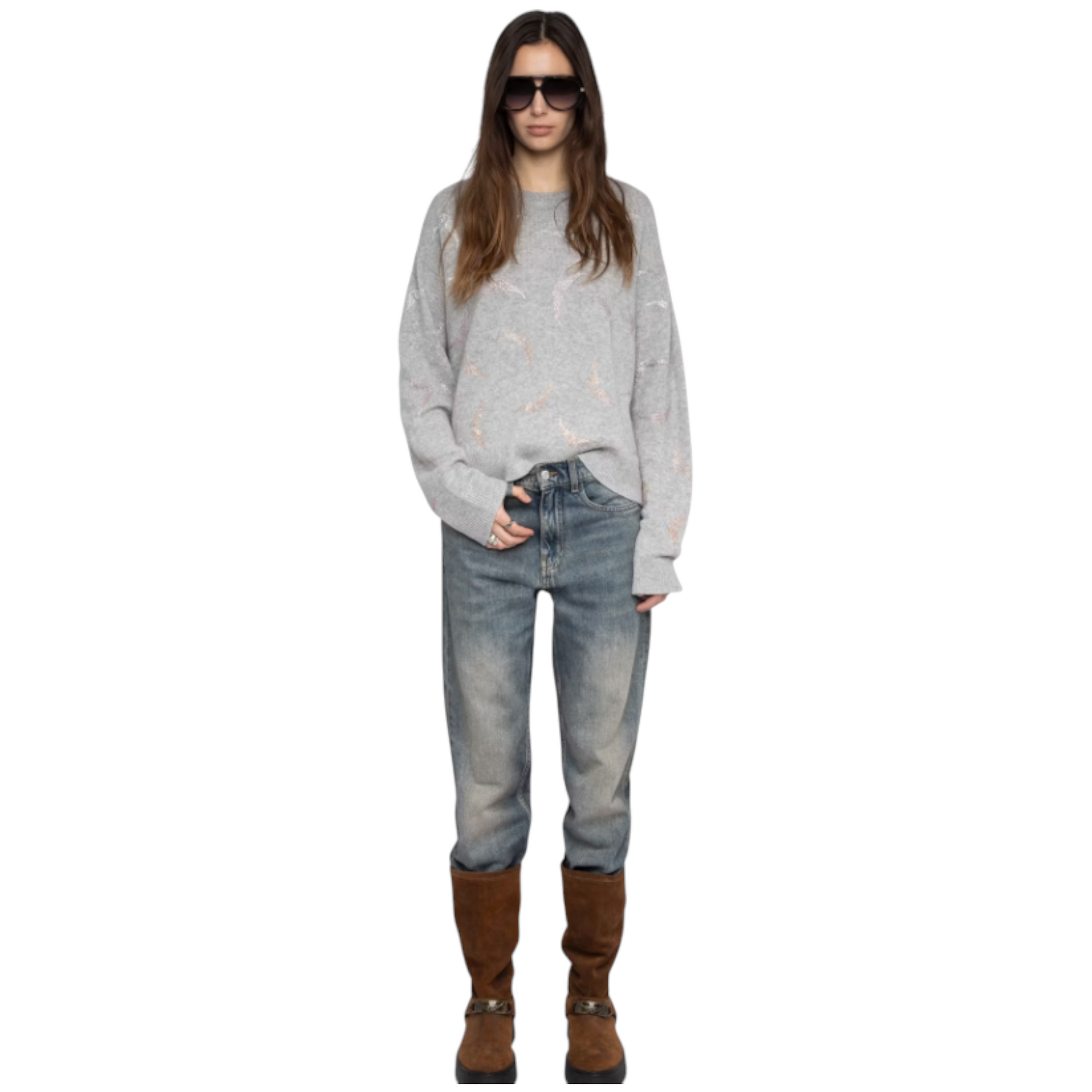 Eksklusiv cashmere-strik med rund hals og ikoniske vinge-detaljer pyntet med rhinsten i forskellige farver. Den bløde kvalitet og det let oversized fit giver et luksuriøst og afslappet udtryk.