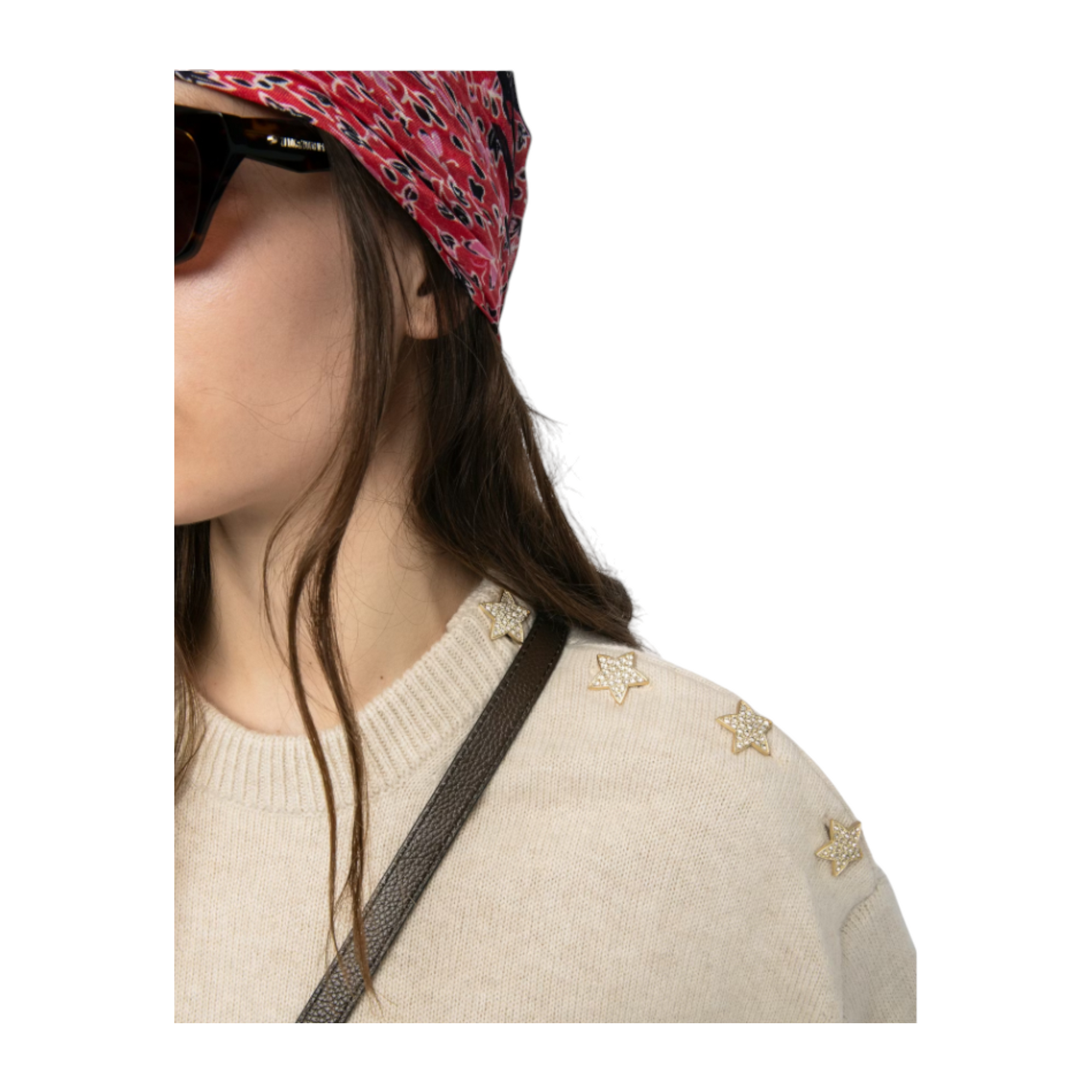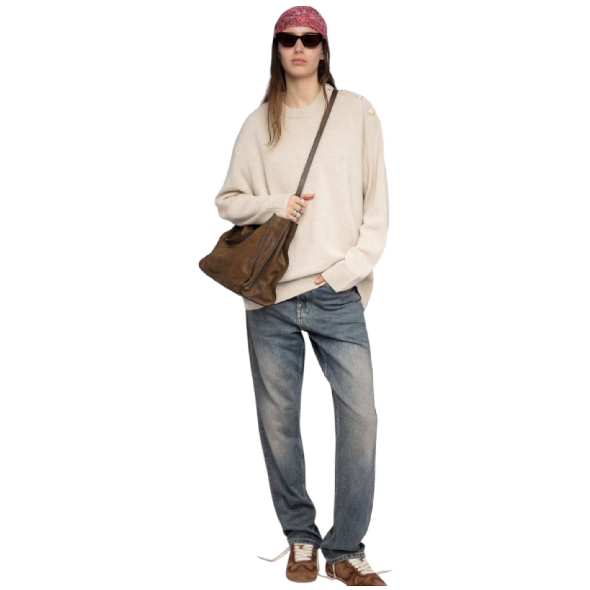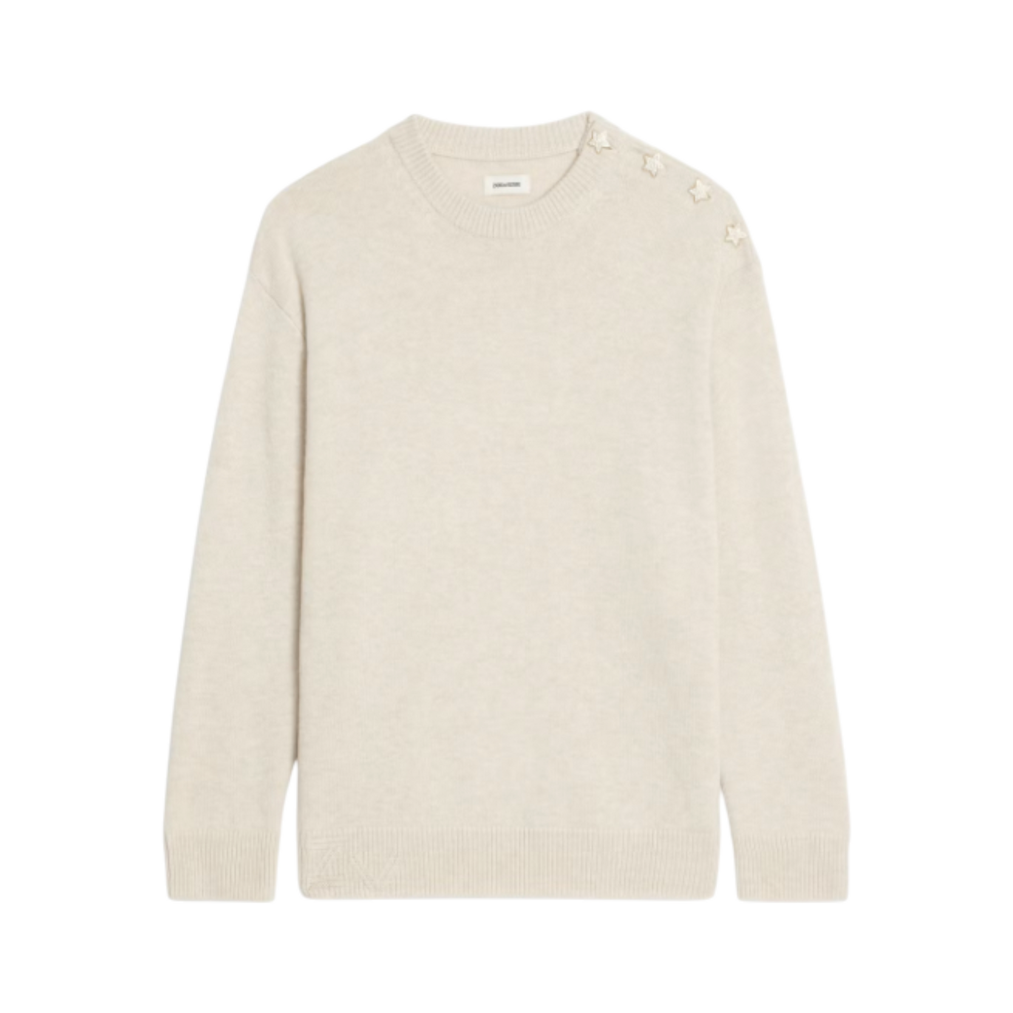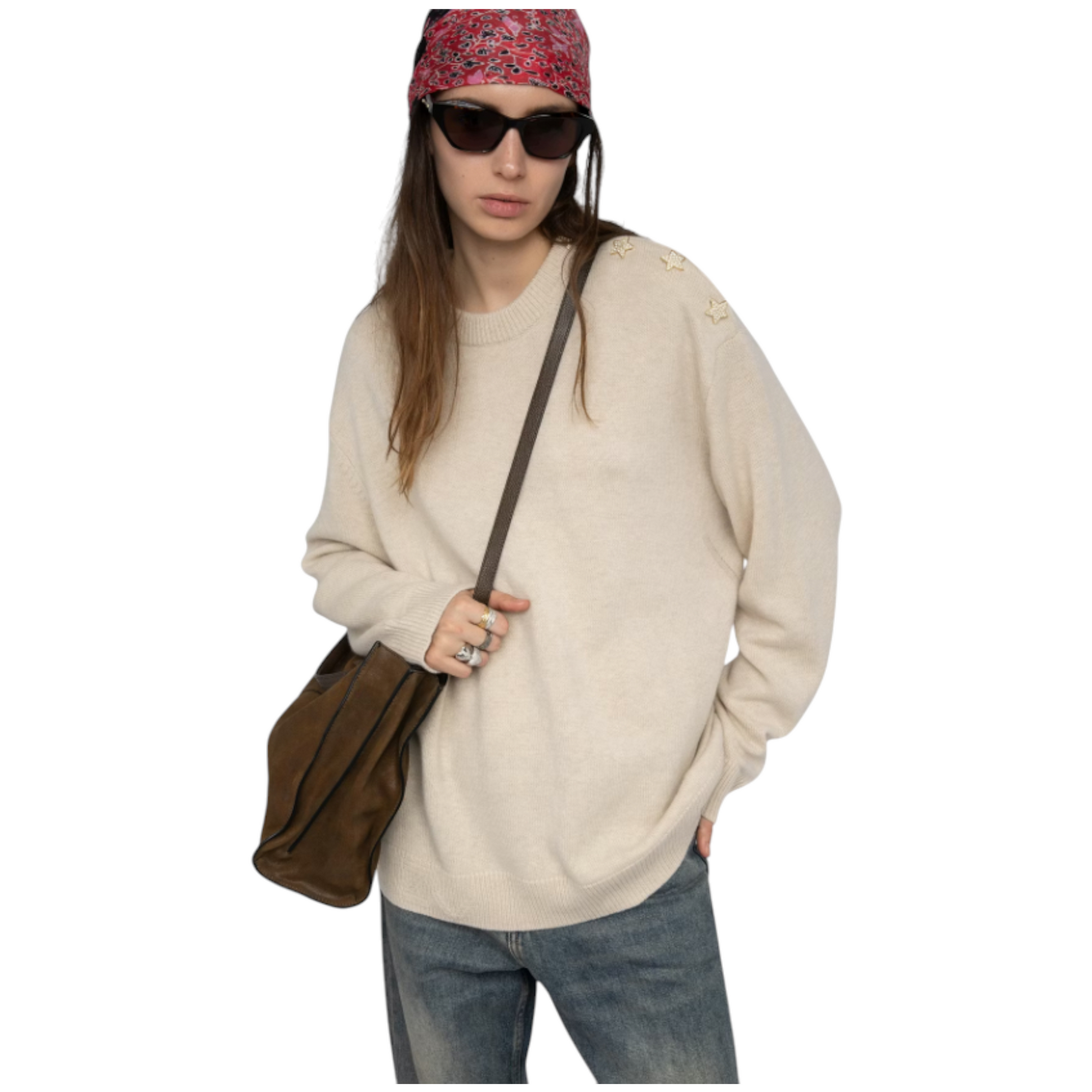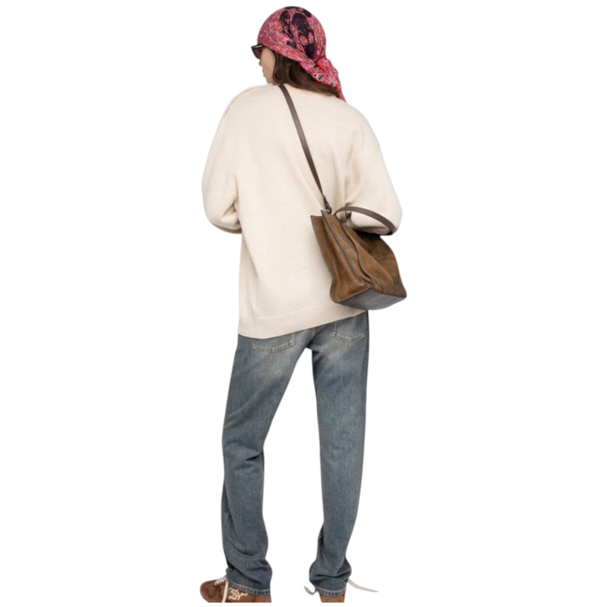 Swyna Jumper i farven Cream er en smuk, oversized strik i uld og cashmere. Den har rund hals, lange ærmer og elegant knaplukning med juvelknapper, der giver et ekstra luksuriøst touch. Strikken har et løst fit – ønsker du et mere tætsiddende look, kan du gå en størrelse ned.
