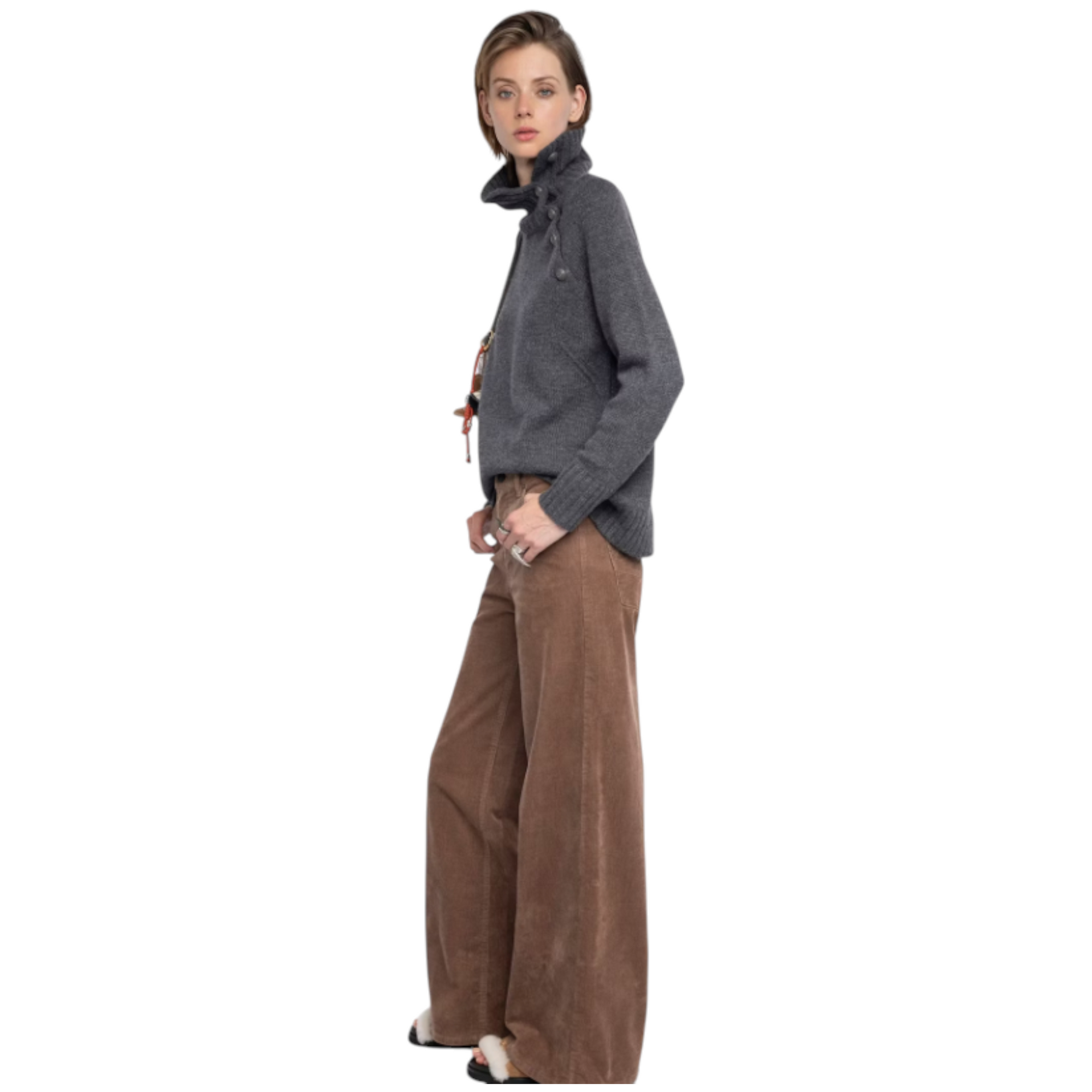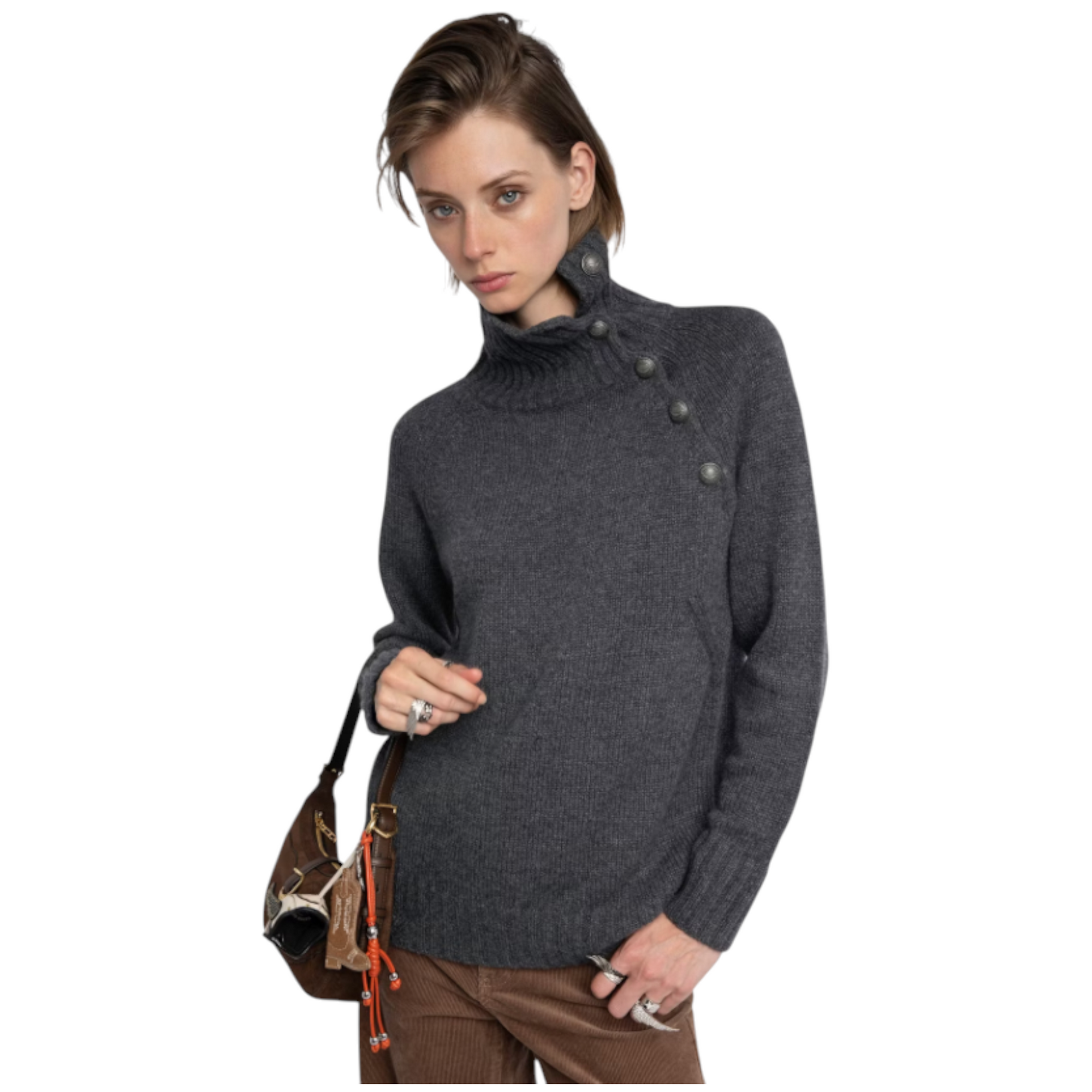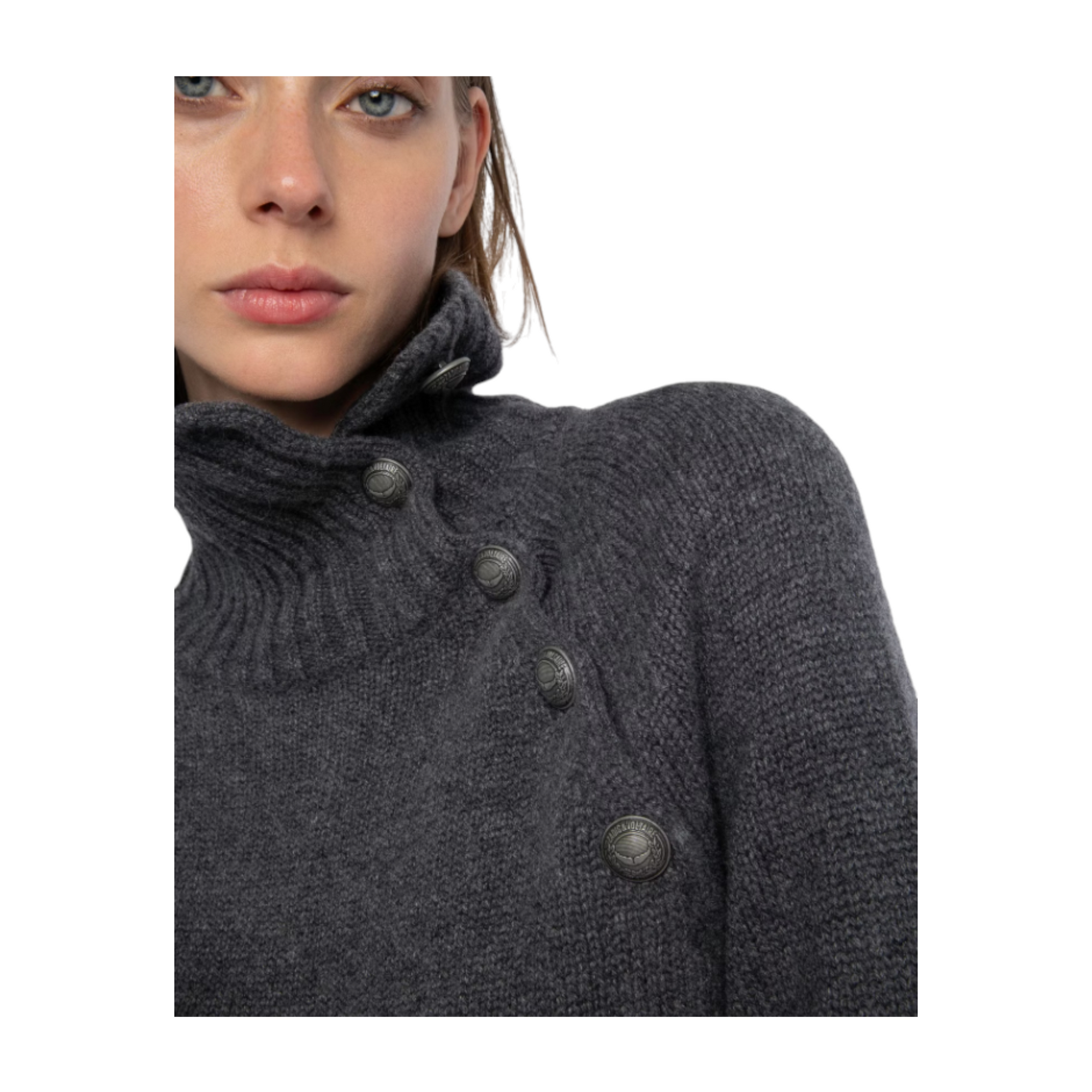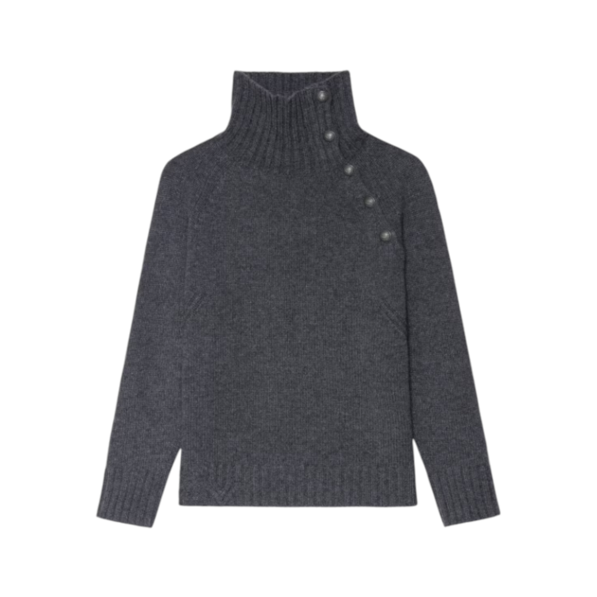 Strik i 100% cashmere med høj krave og knaplukning med vingedetaljer. Lange ærmer og en klassisk pasform. Normal i størrelsen – vælg din sædvanlige størrelse.