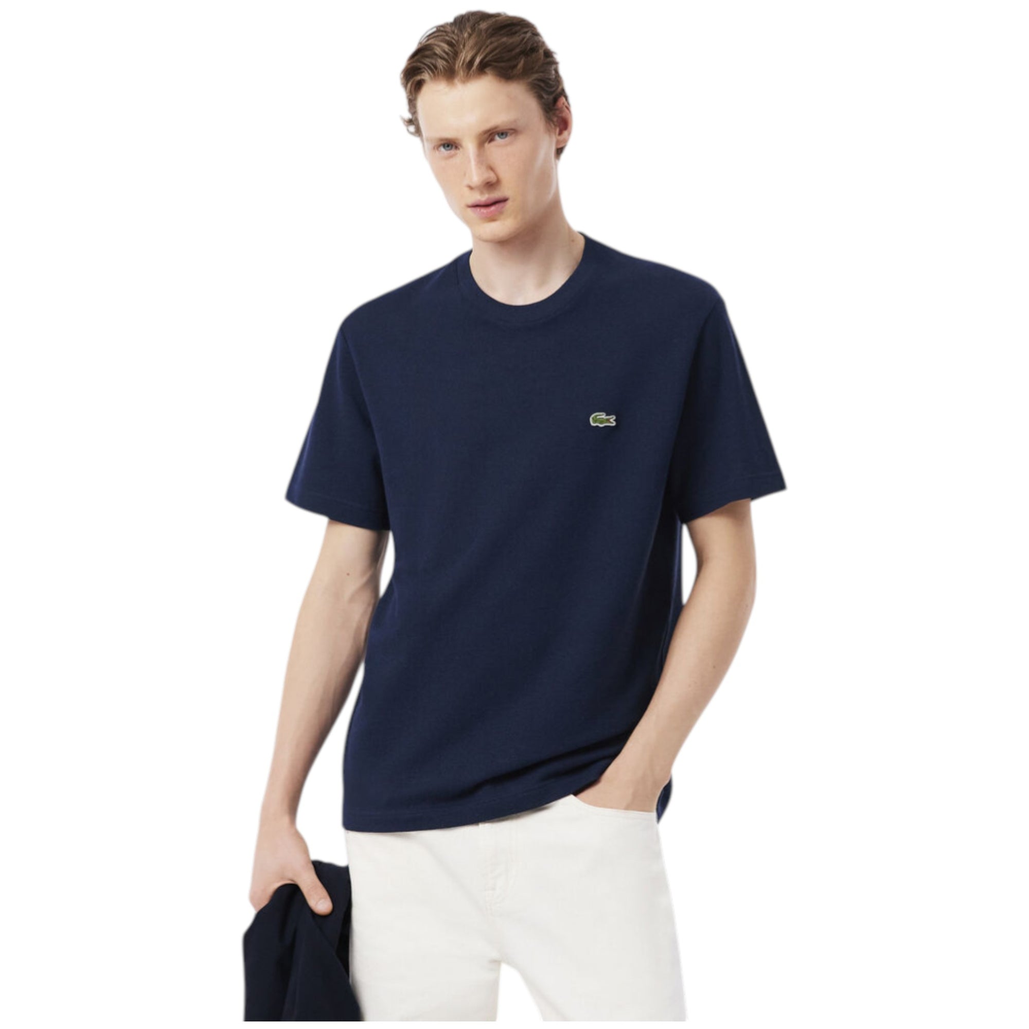 Denne navy Lacoste T-shirt i piqué er nem at style og fungerer perfekt sammen med både lyse og mørke bukser – et elegant basisitem i enhver herregarderobe.