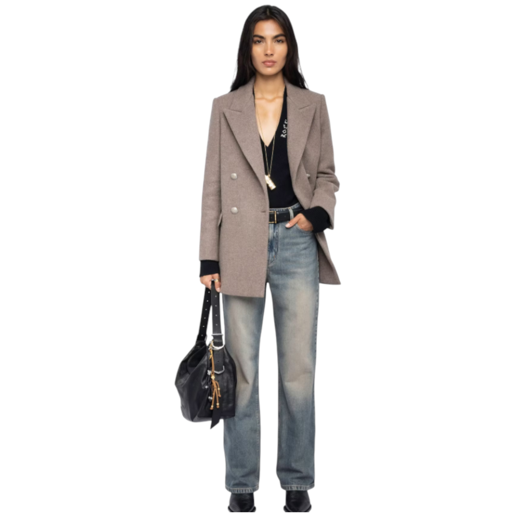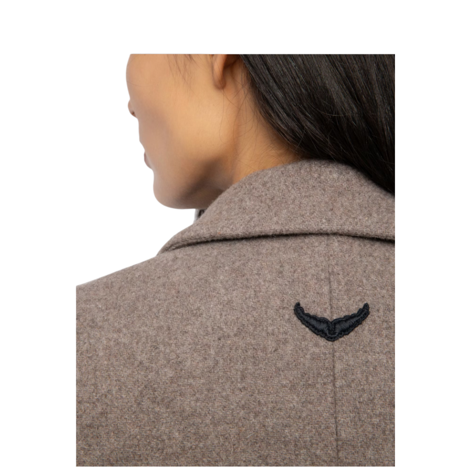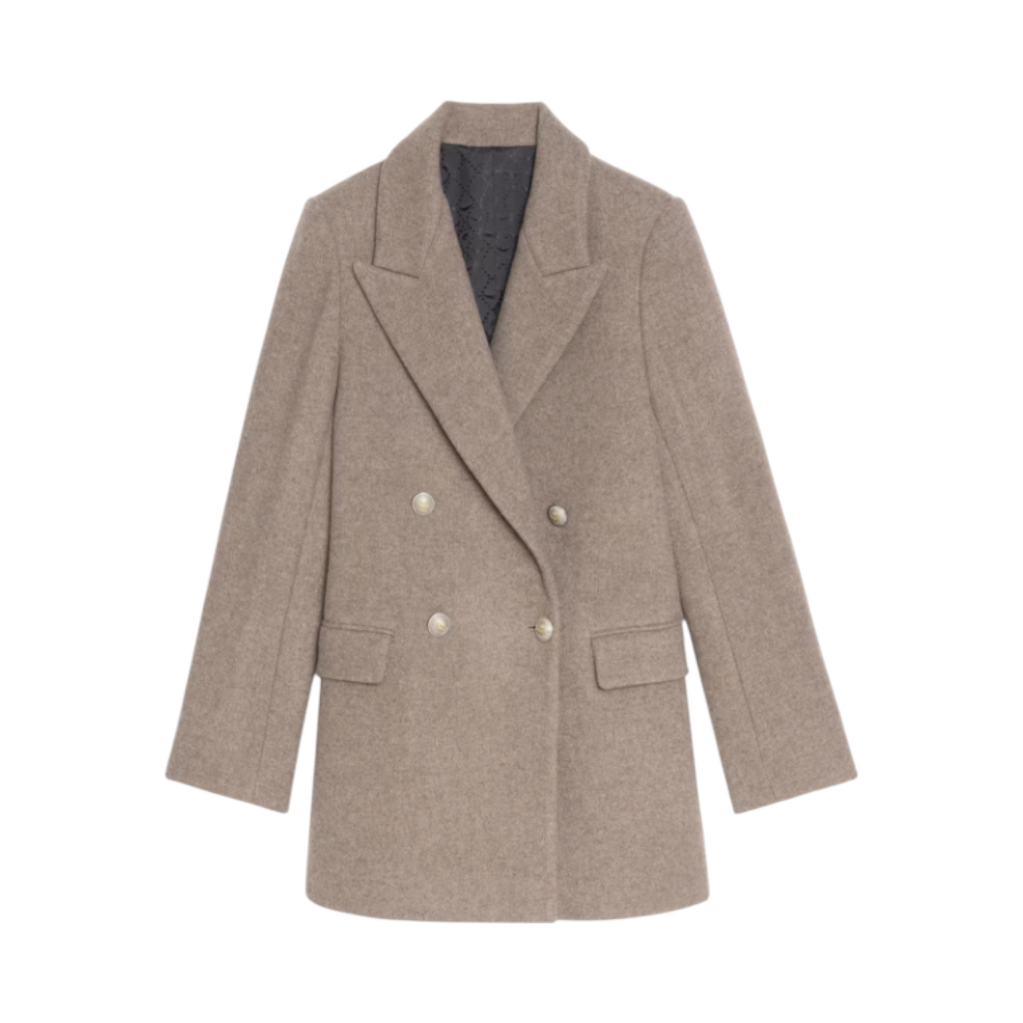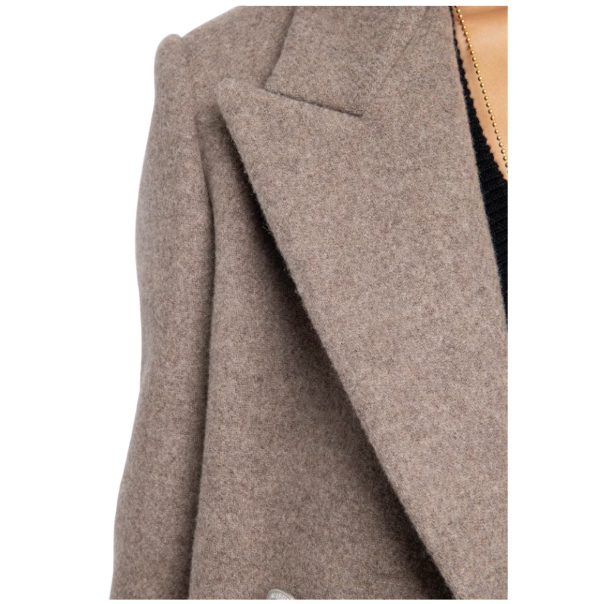 Elegant uldfrakke i peacoat-stil med dobbeltradet lukning, klassisk krave og skulderstropper. Udstyret med to klaplommer og lange ærmer.