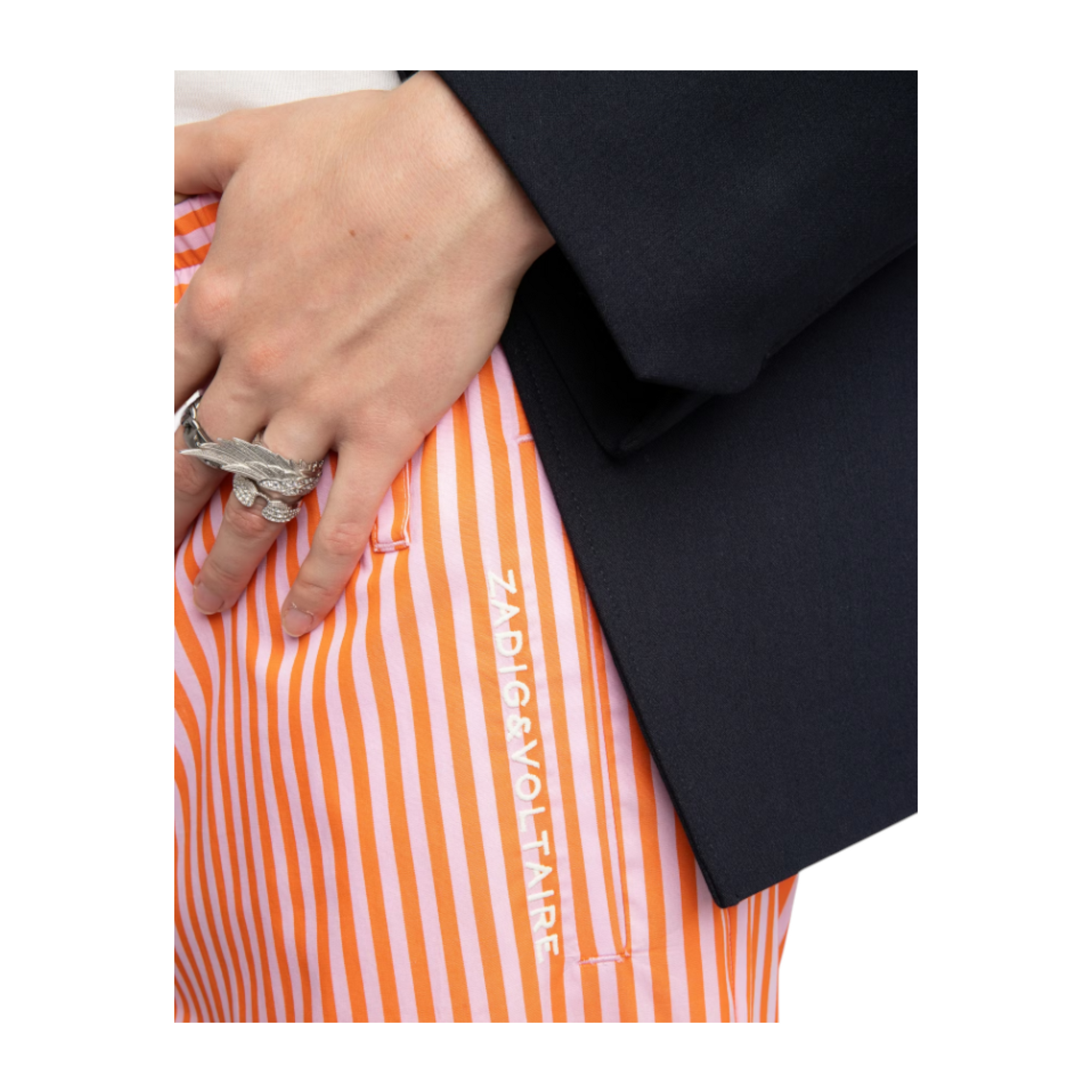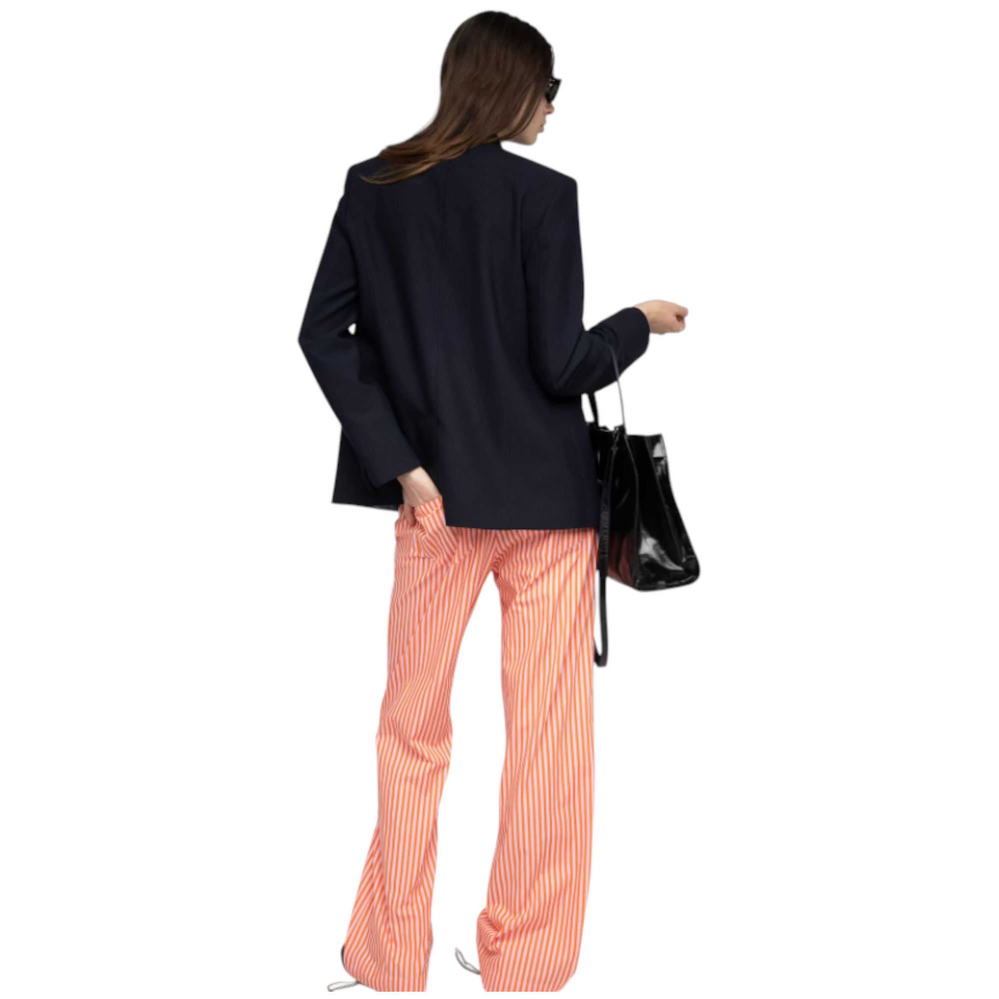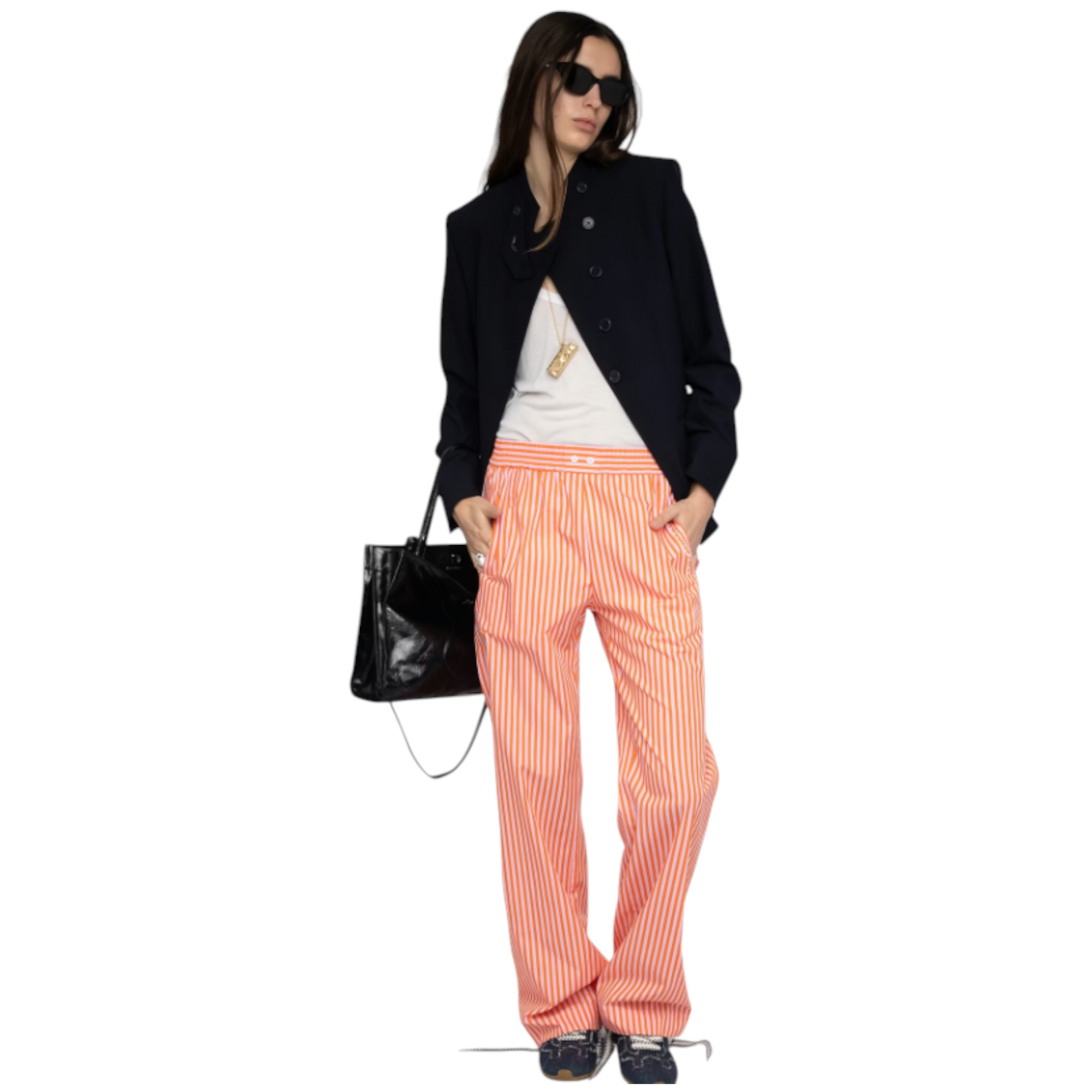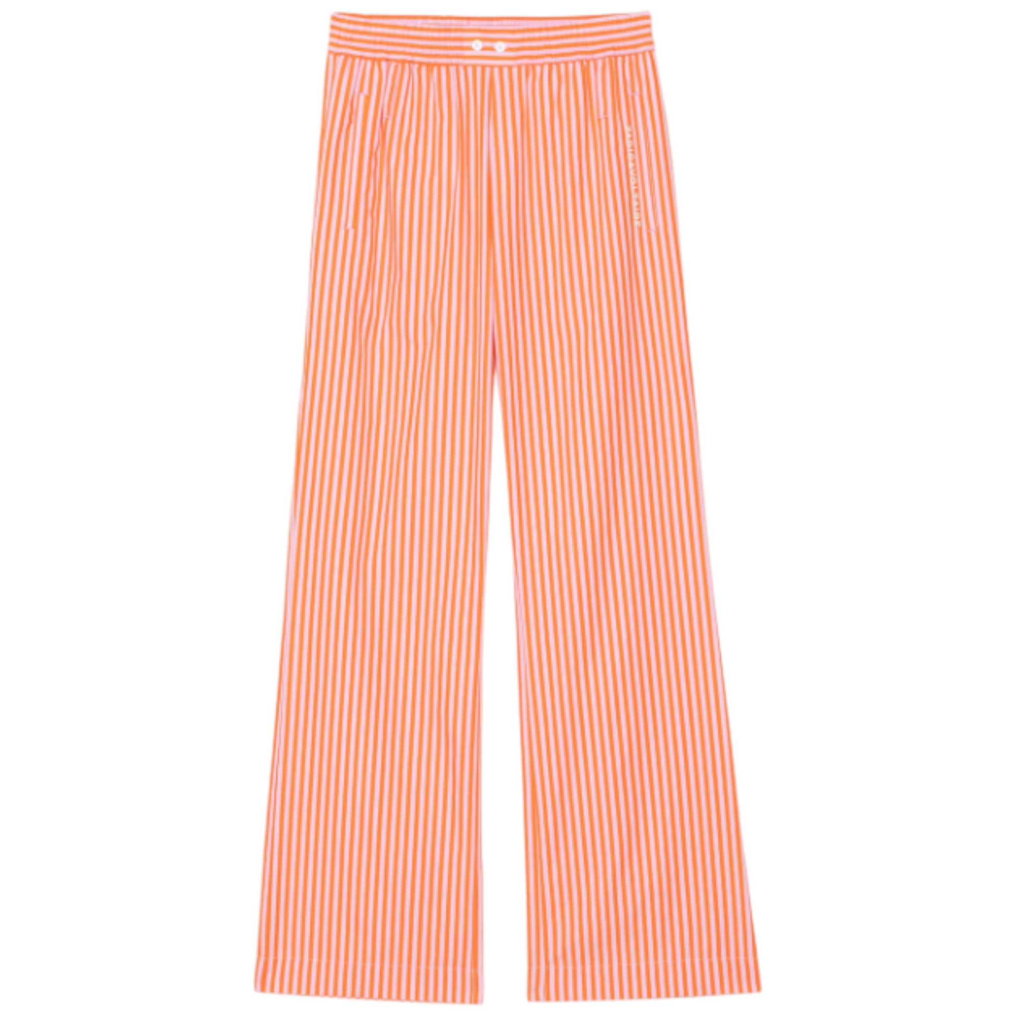 Trousers Poma er jogger-inspirerede bukser med lige ben i stribet poplin. Designet med elastisk talje, påsatte lommer og en lille ticket-lomme. Modellen har regular fit og mid-rise pasform og er fremstillet i 100% bomuld. Normal i størrelsen.
