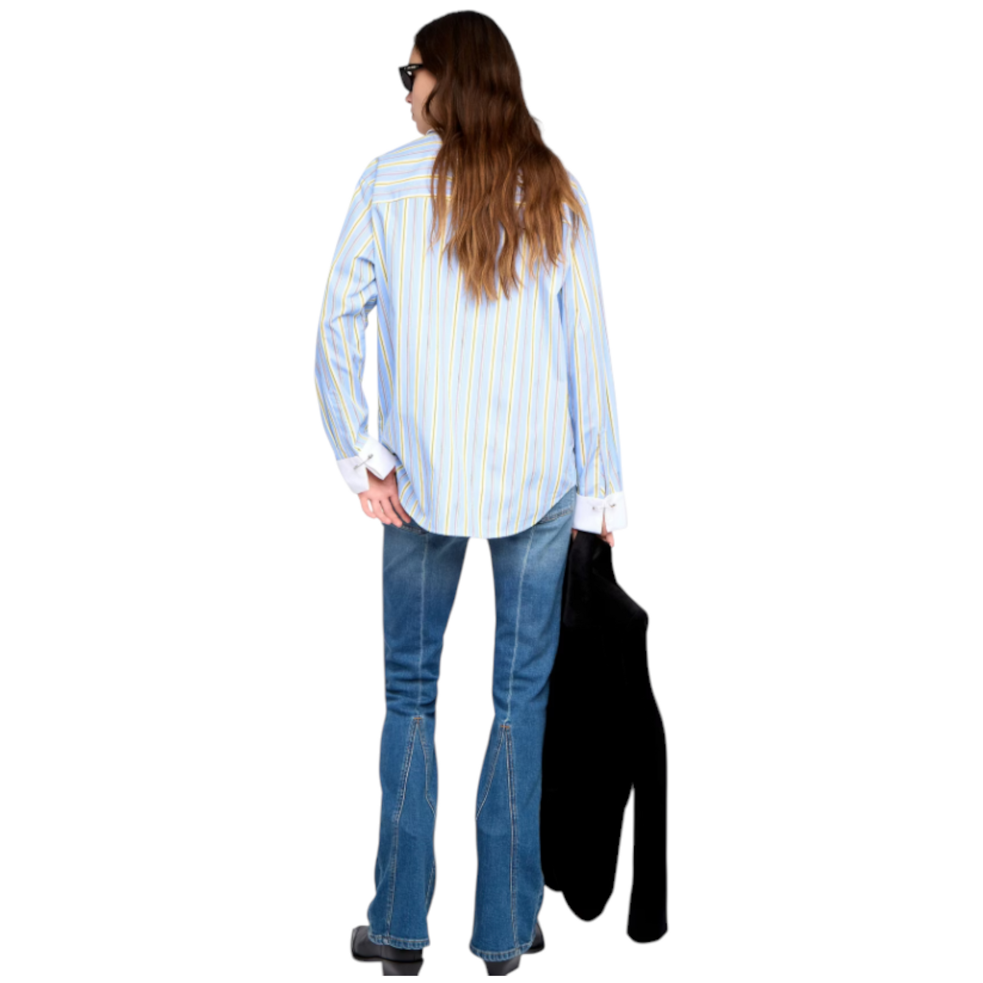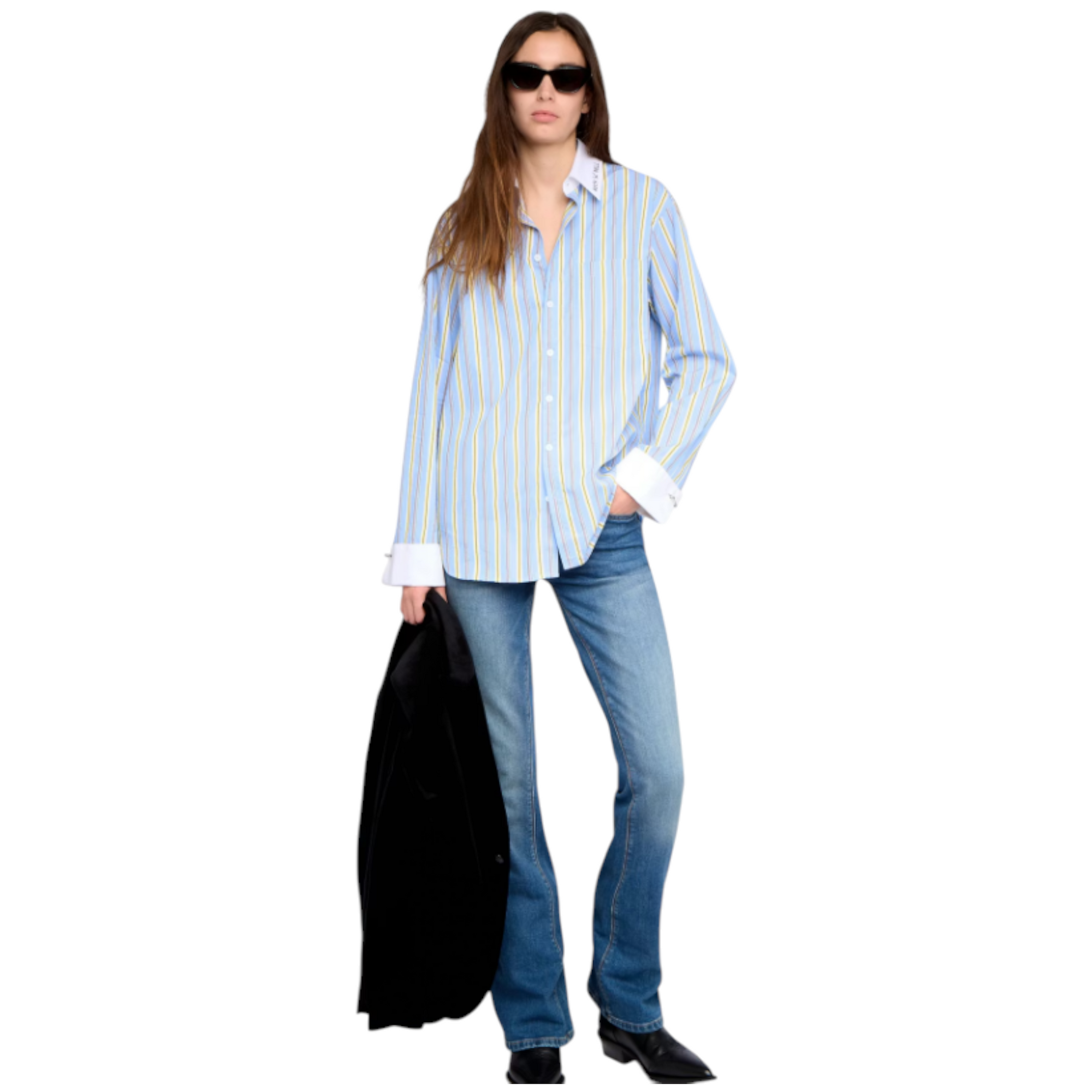 Shirt Morning er en oversized, stribet poplinskjorte med broderi og kontrastfarvet klassisk krave og manchetter. Designet med knaplukning, påsat brystlomme og lange ærmer. En moderne skjorte i 100% bomuld med et afslappet udtryk. Ønskes et mere tætsiddende fit, anbefales det at vælge én størrelse mindre.
